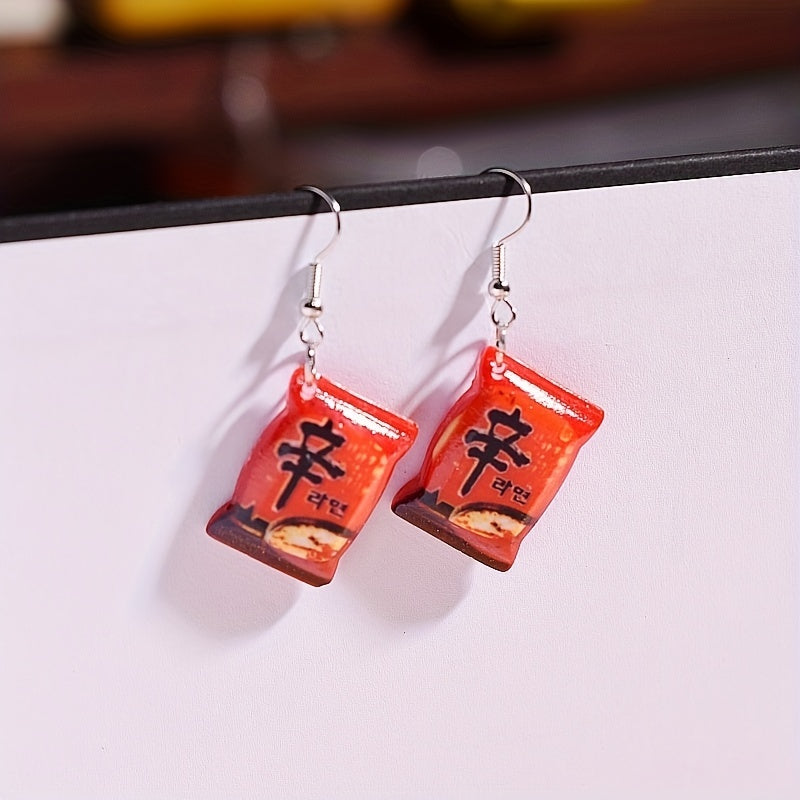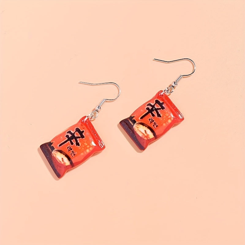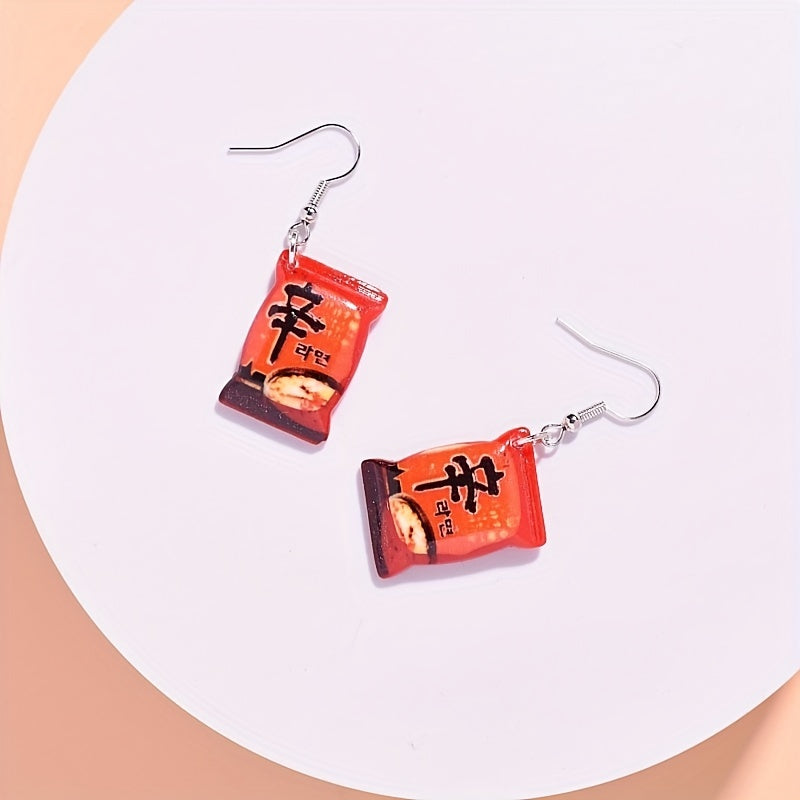 These unique earrings feature instant noodles design, perfect for Kpop and food enthusiasts. Made of high-quality resin, these statement earrings are a fun addition to any outfit.