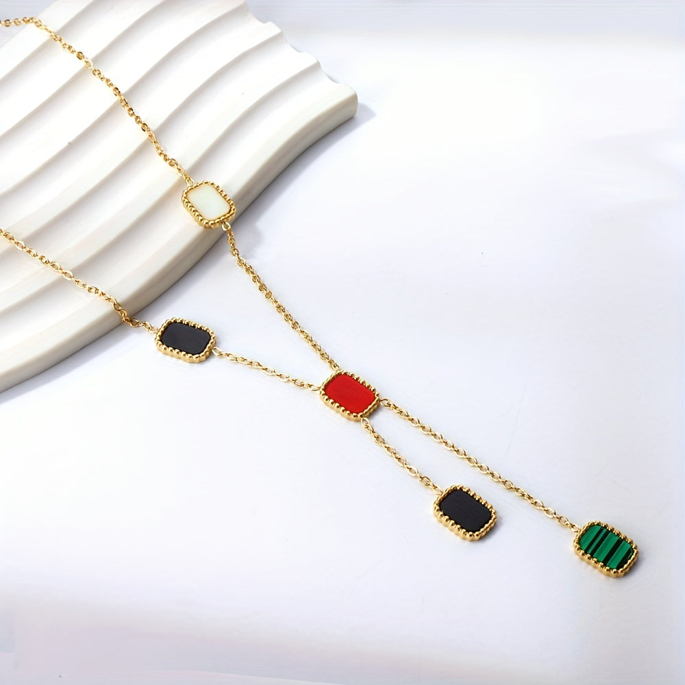 Make a statement with this stylish necklace featuring 5 geometric shape pendants in vibrant colors. Perfect gift for women who love unique jewelry pieces.