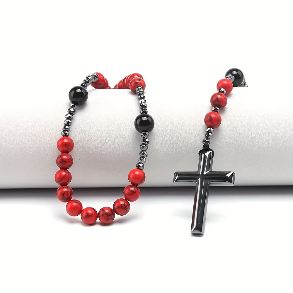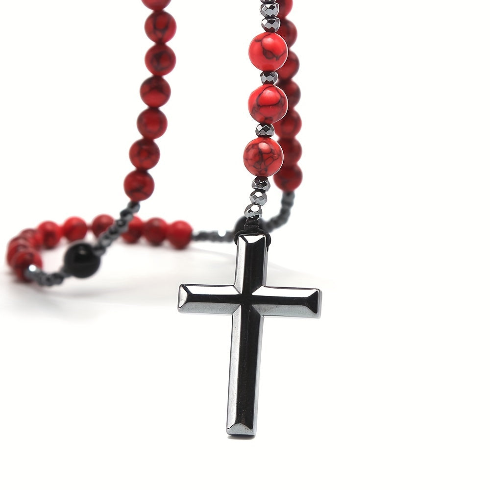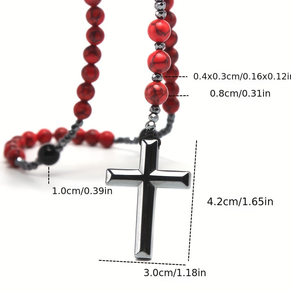 This exquisite rosary necklace features 8mm red pine stone beads with a striking agate gallstone cross pendant. It is designed for men and comes with a long chain for a stylish look.