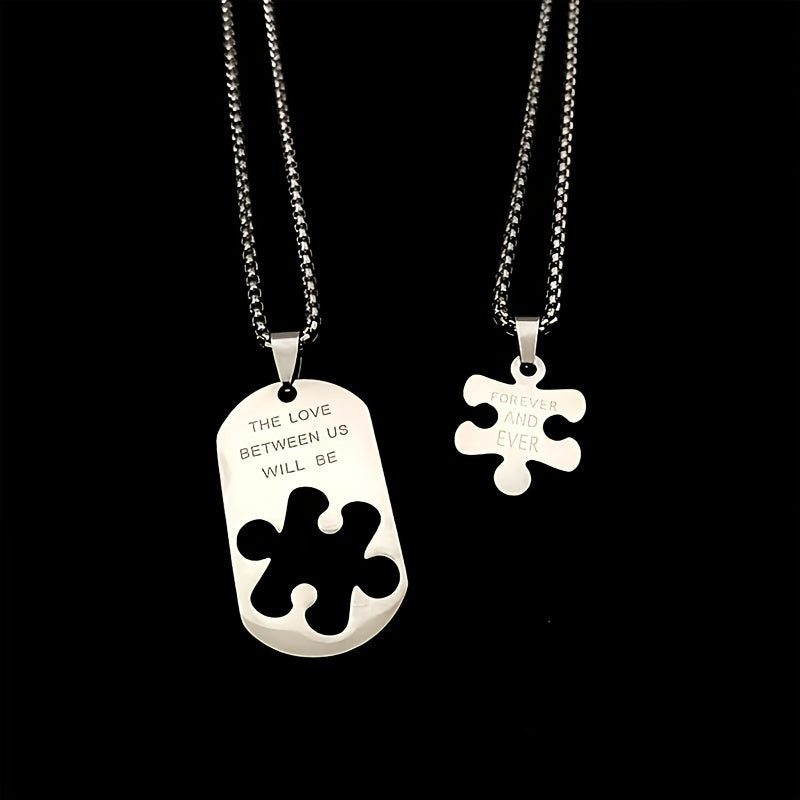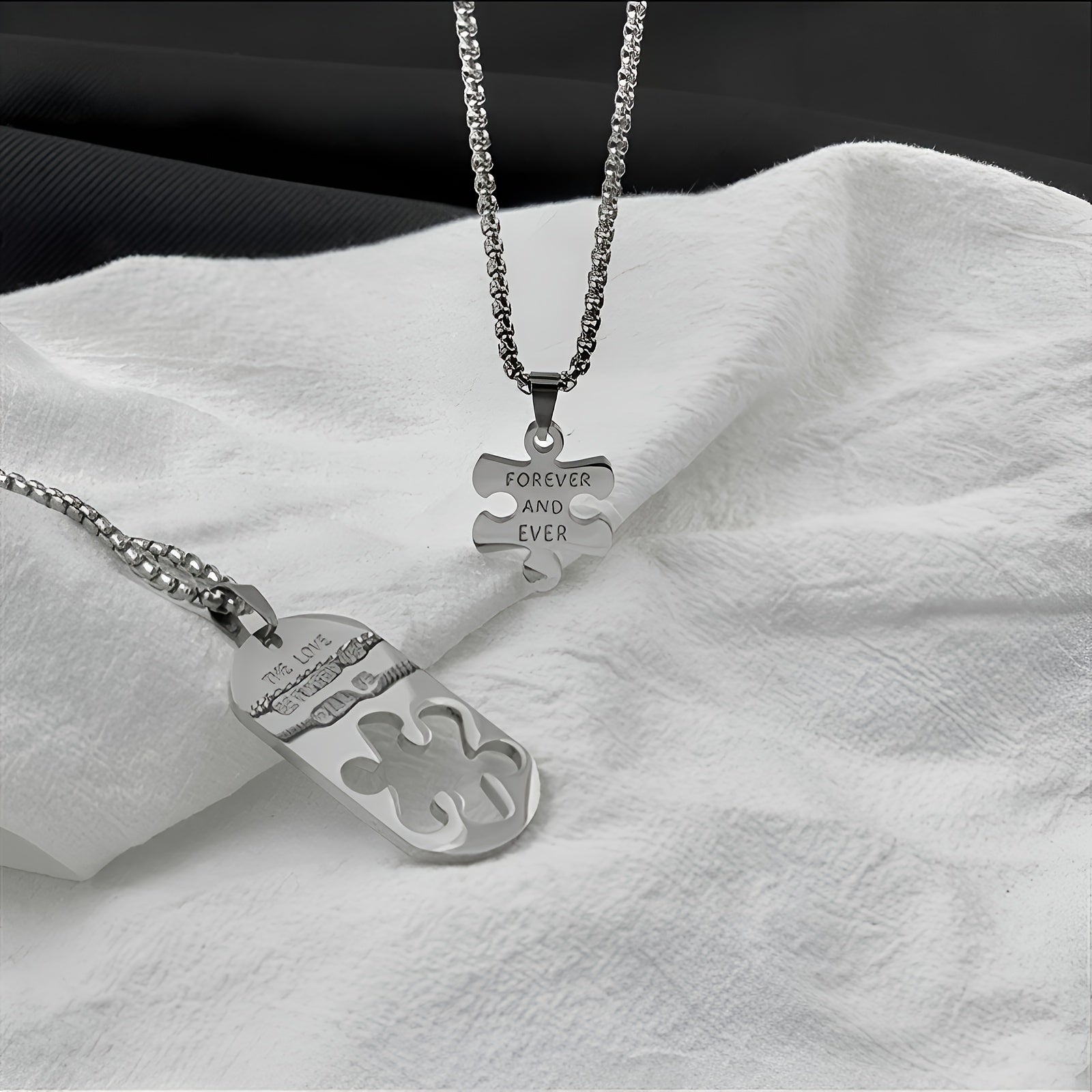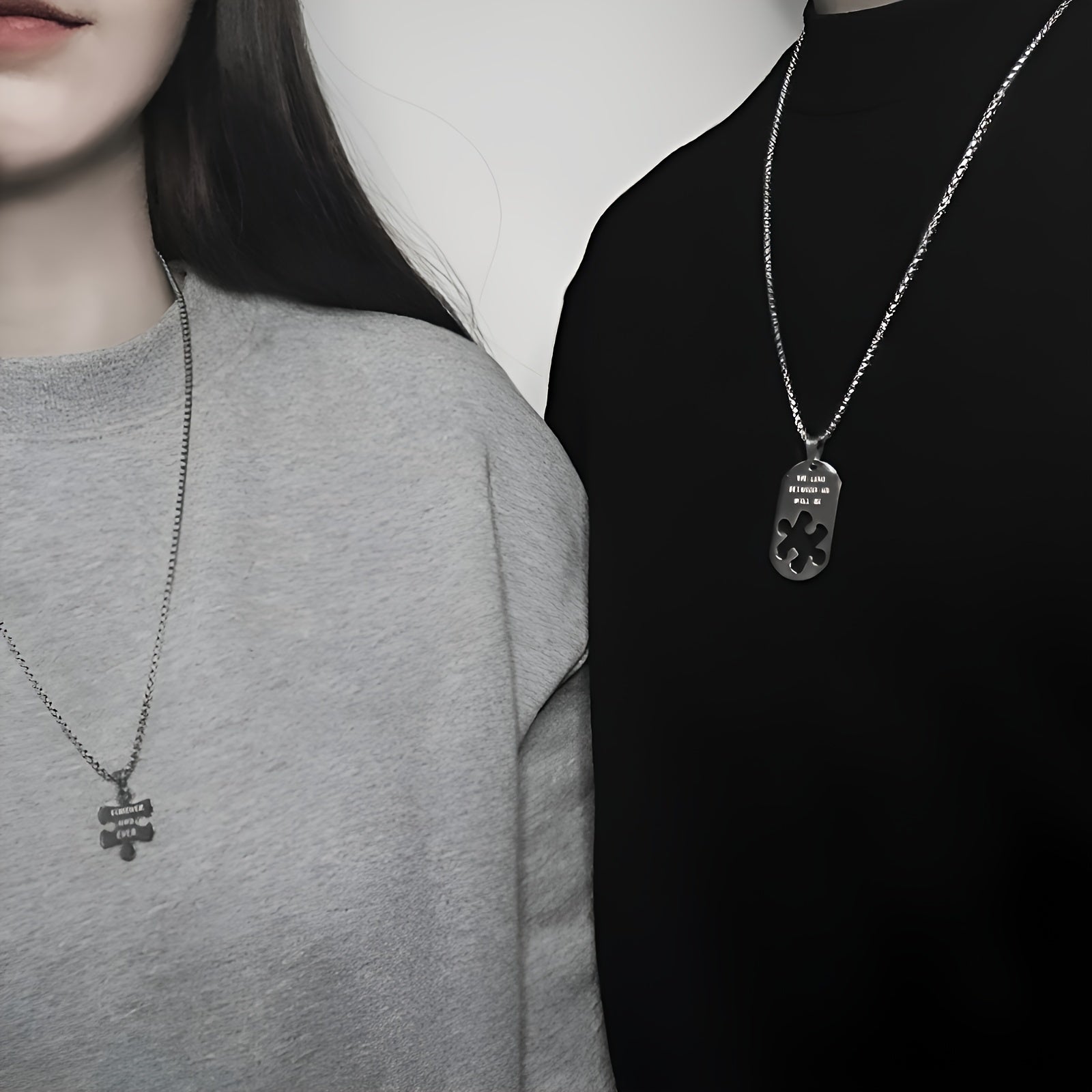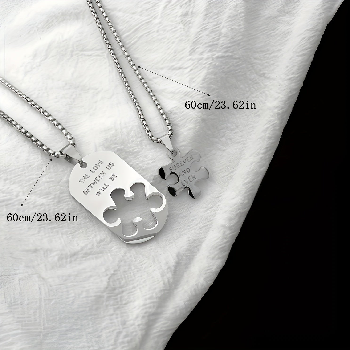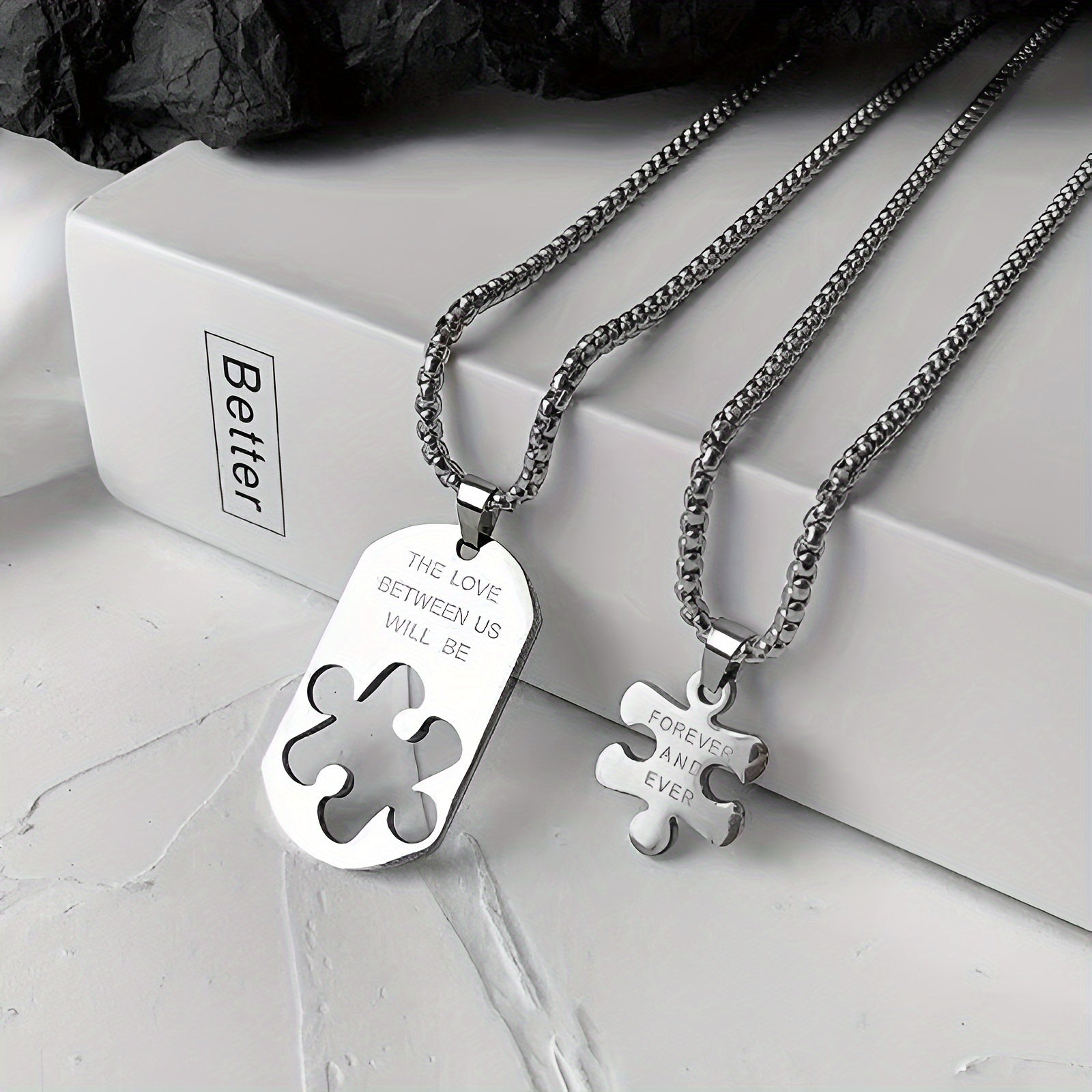 This set includes 2 pieces of stainless steel puzzle necklaces, perfect for couples. The hip hop style design features a niche puzzle alphabet square card on a sweater chain.