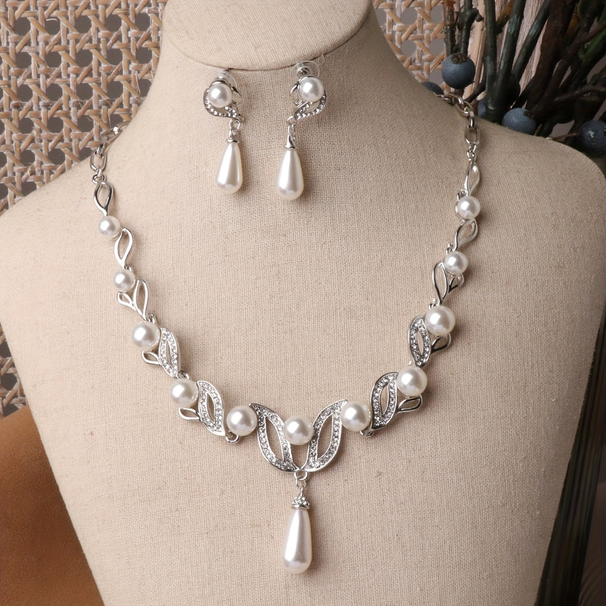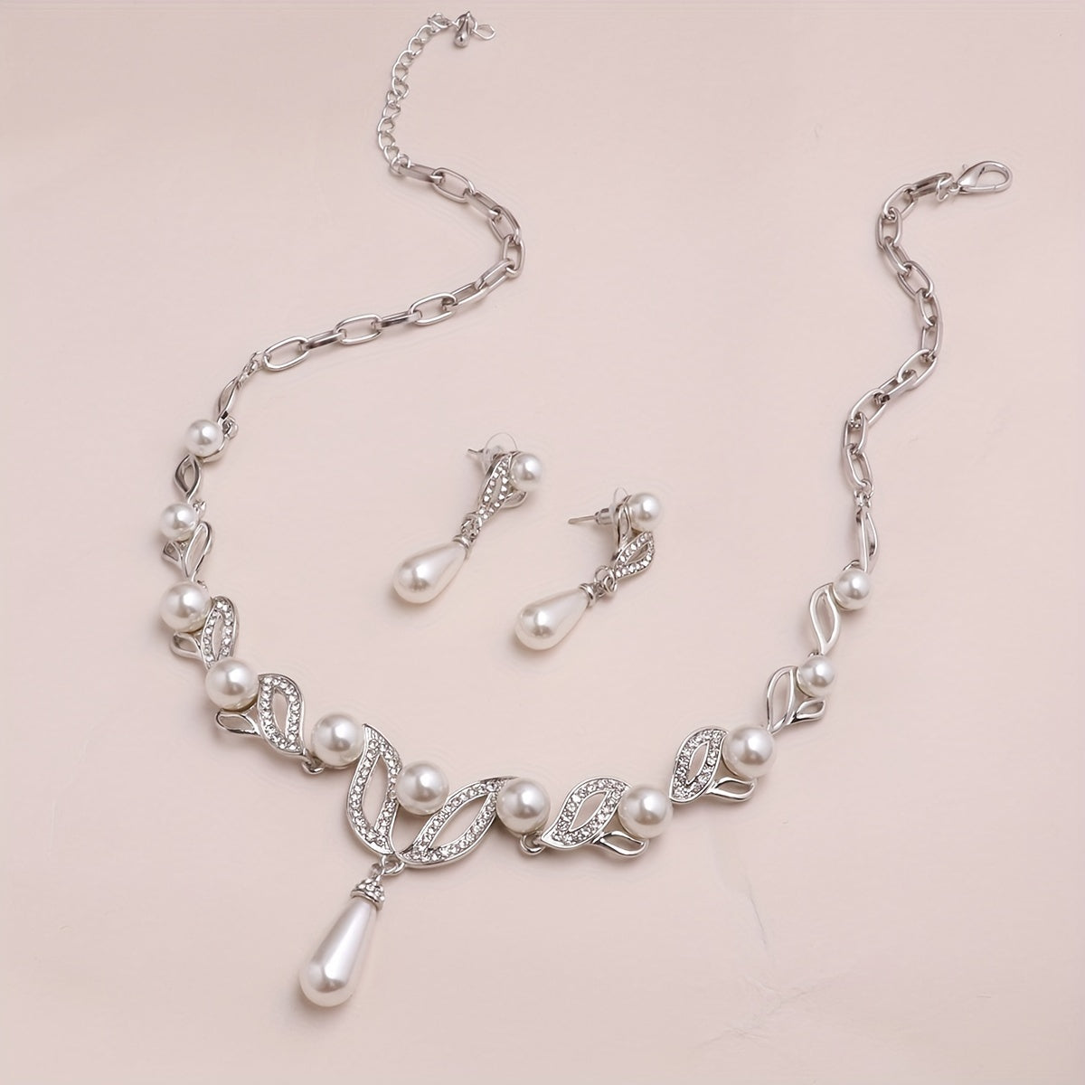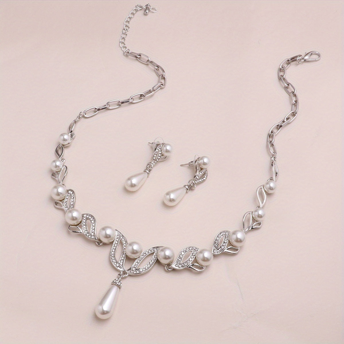 Complete your banquet outfit with this elegant faux pearls jewelry set that includes a pendant necklace and dangle earrings. Perfect for any special occasion.