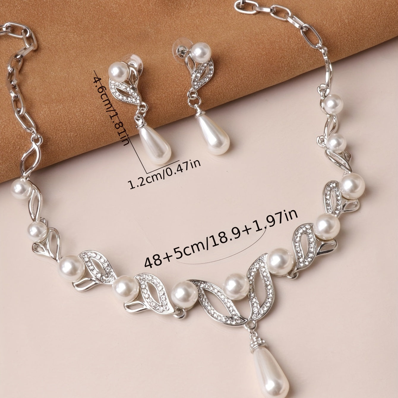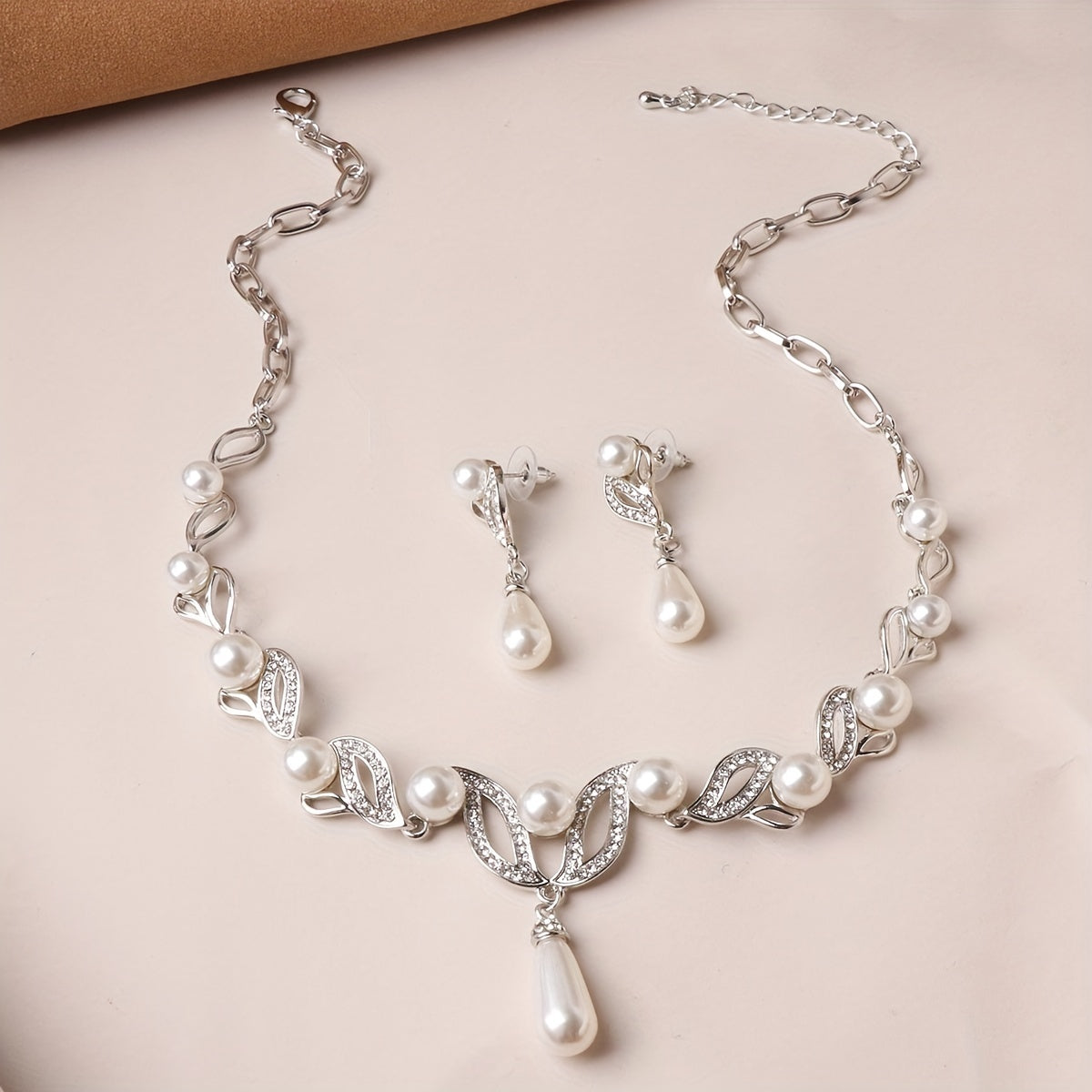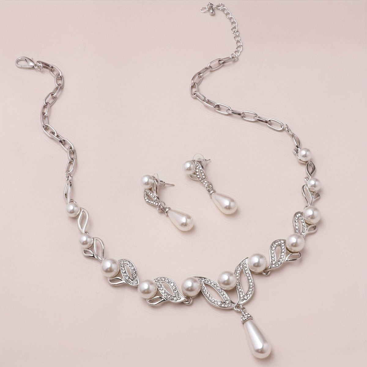 Complete your banquet outfit with this elegant faux pearls jewelry set that includes a pendant necklace and dangle earrings. Perfect for any special occasion.