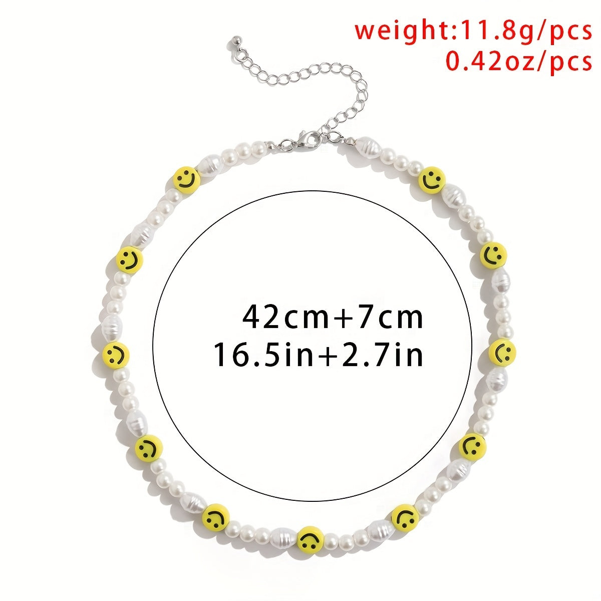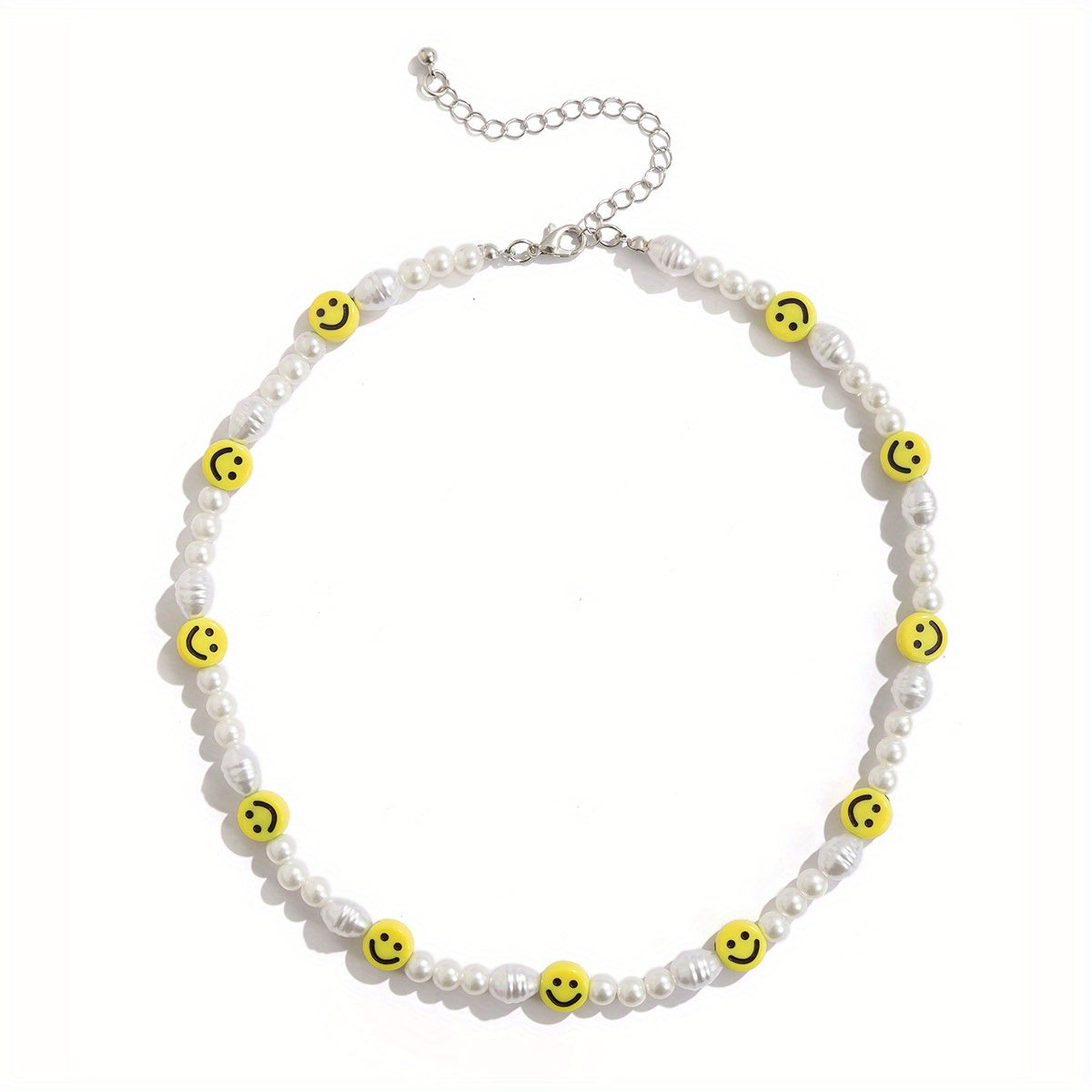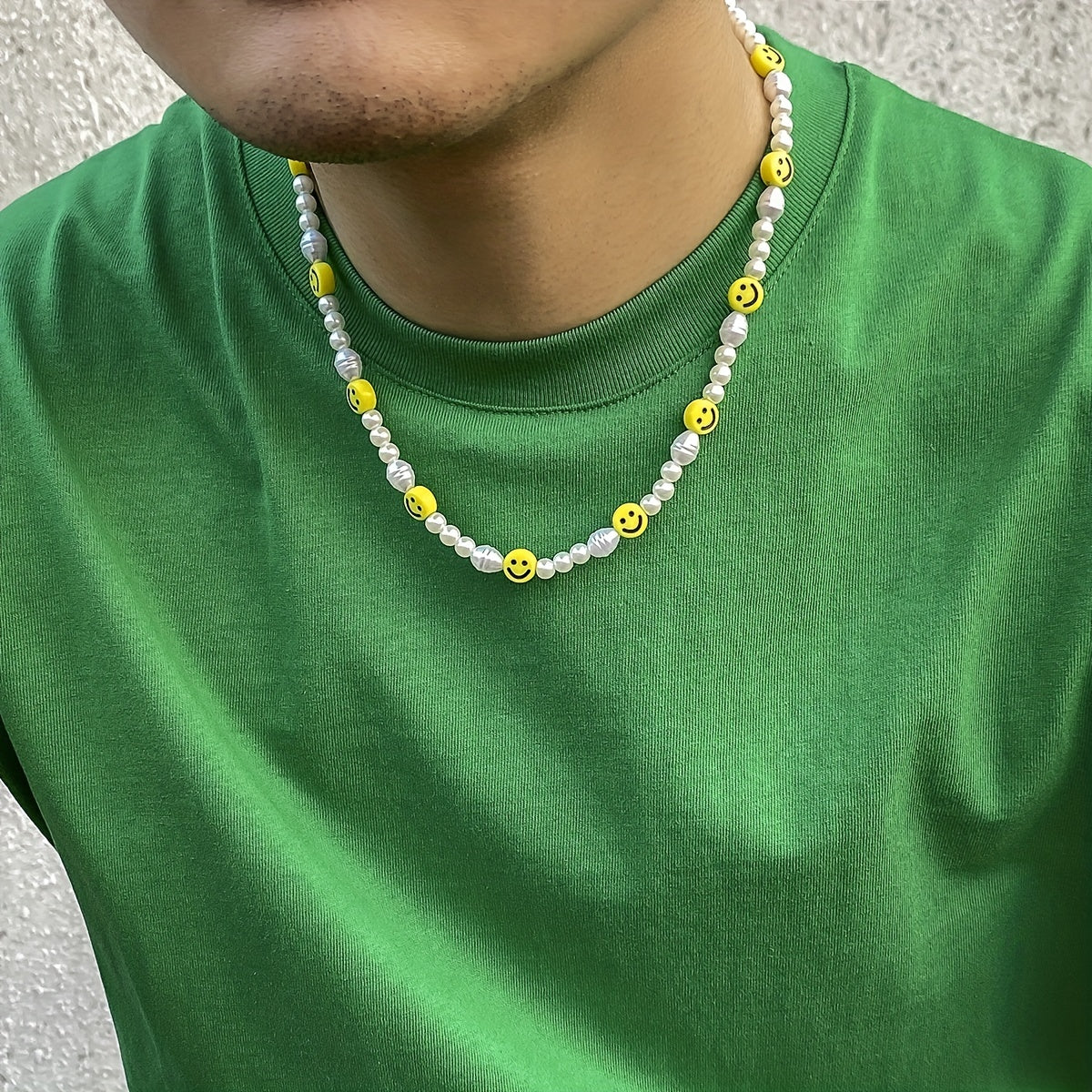 Stay trendy with this single layer pearl necklace featuring a soft pottery yellow smiley face splicing design. Perfect for men who want to make a fashion statement.
