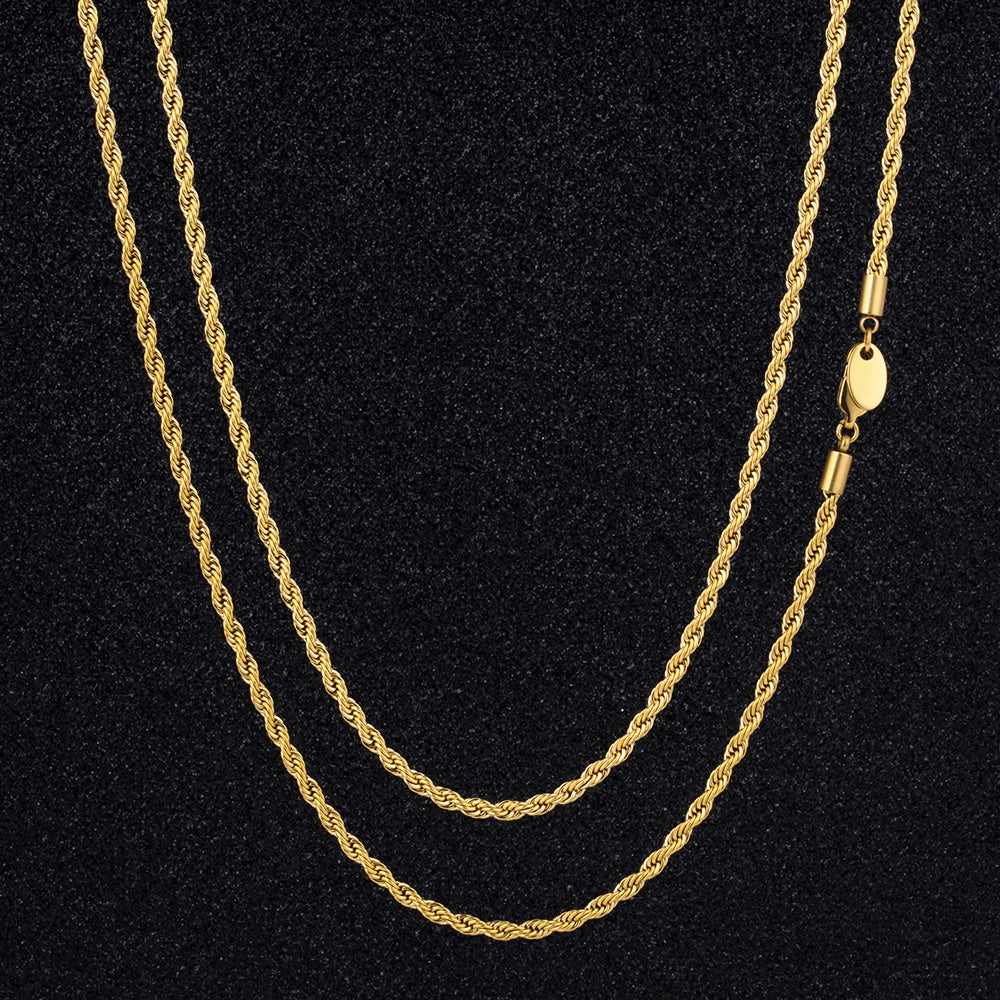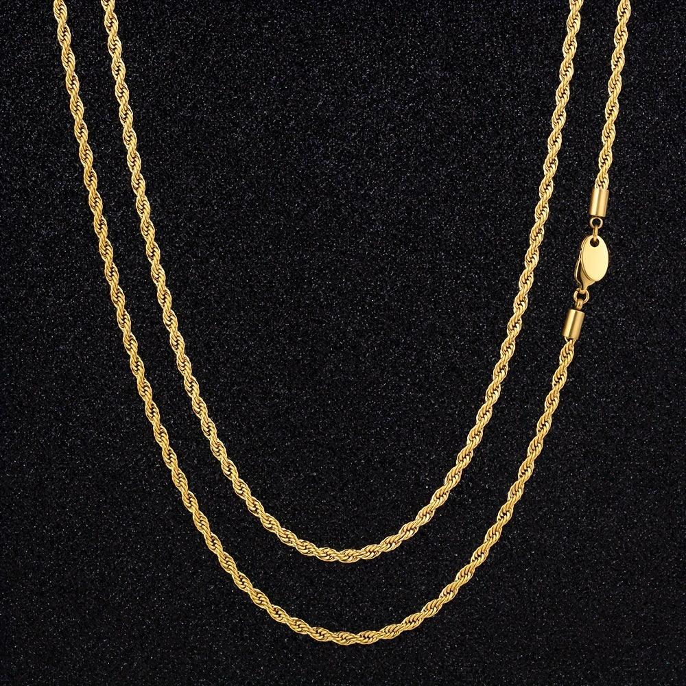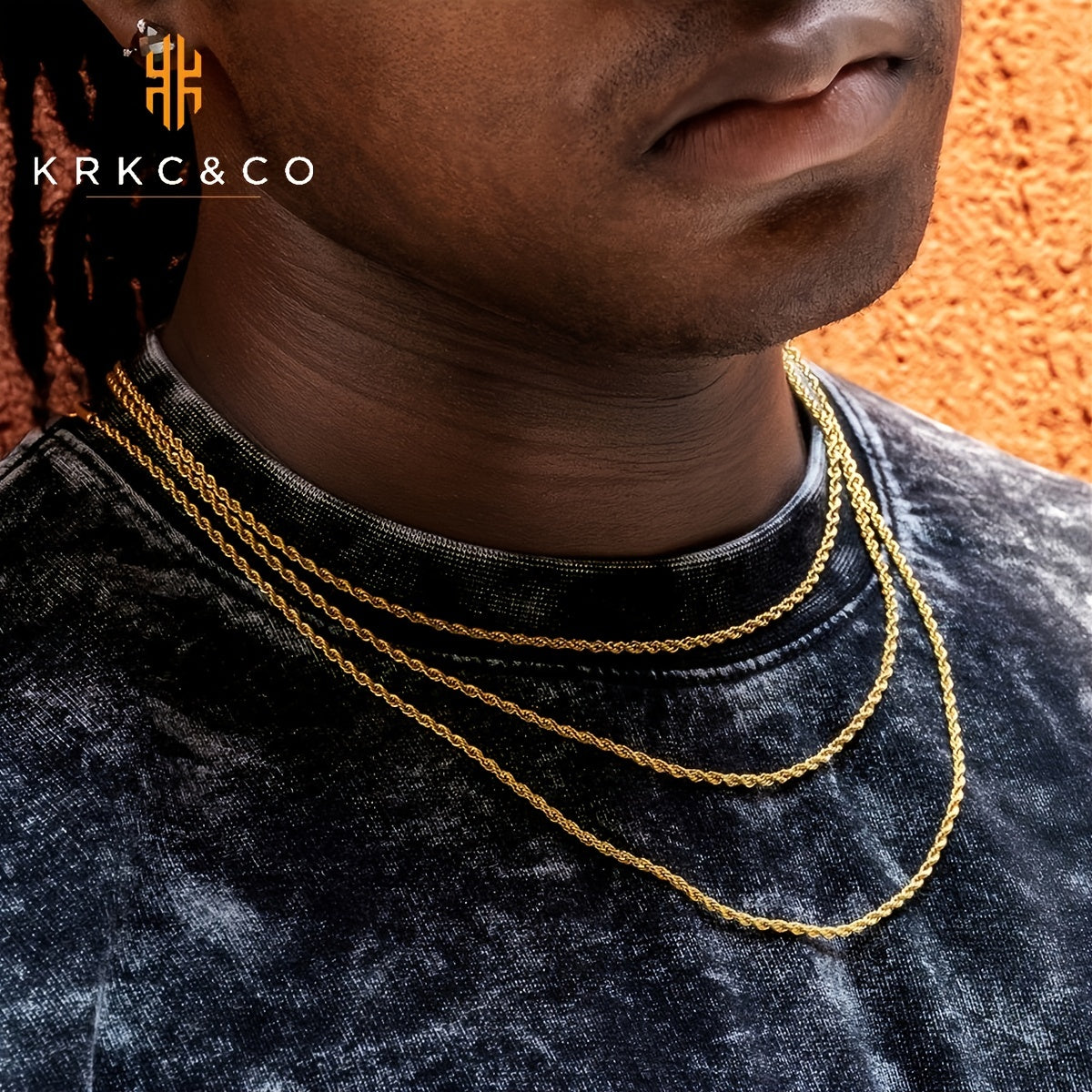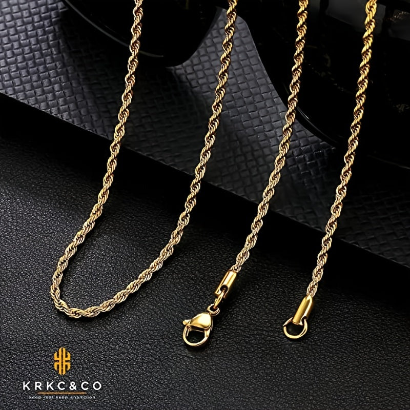 Elevate your style with this 3mm stainless steel filled rope chain by KRKC&CO. Crafted with precision and plated in 14K gold, this chain is a perfect accessory for men who appreciate quality and elegance.