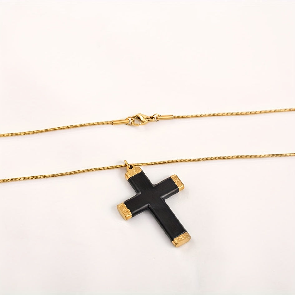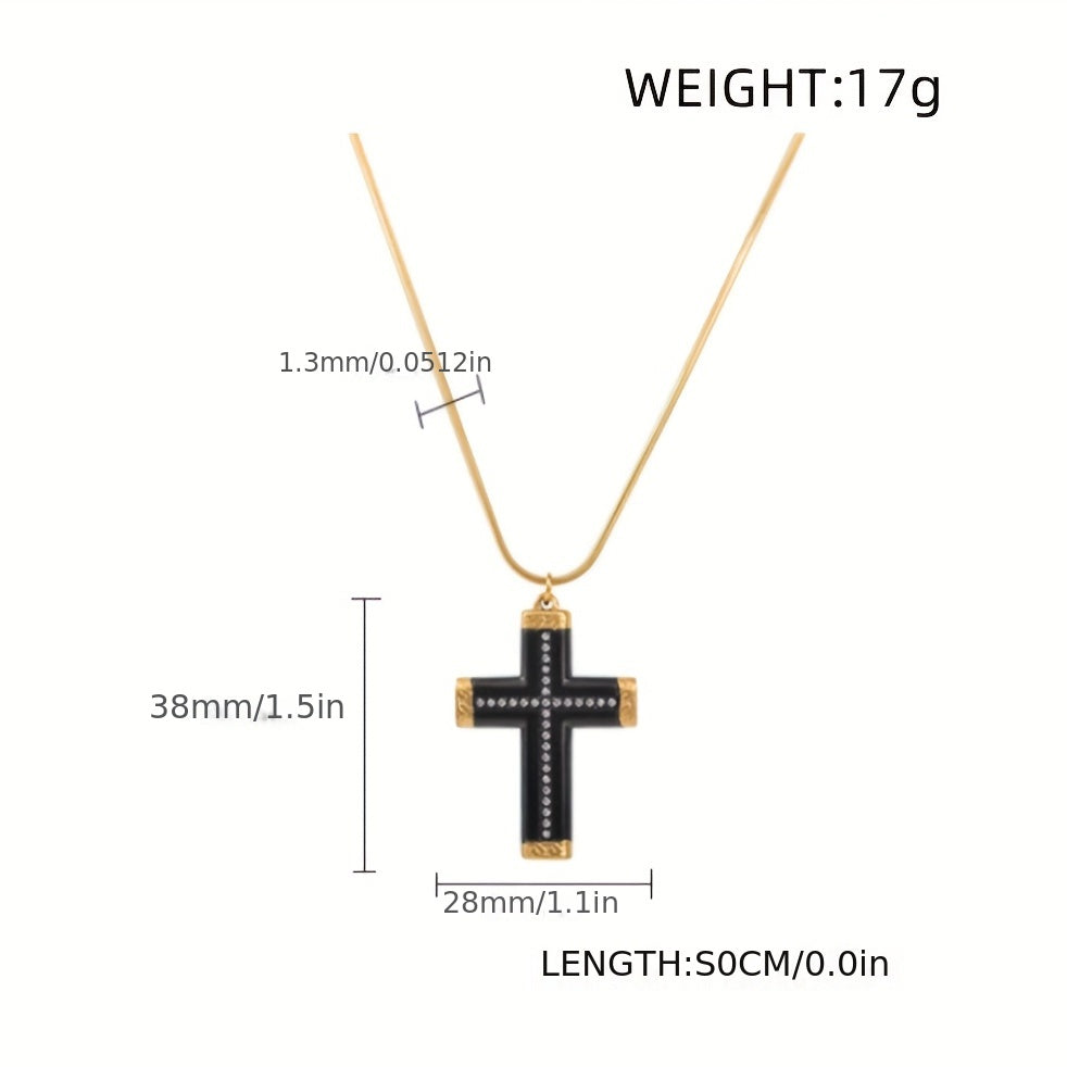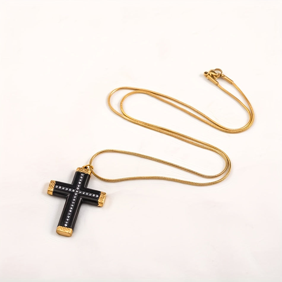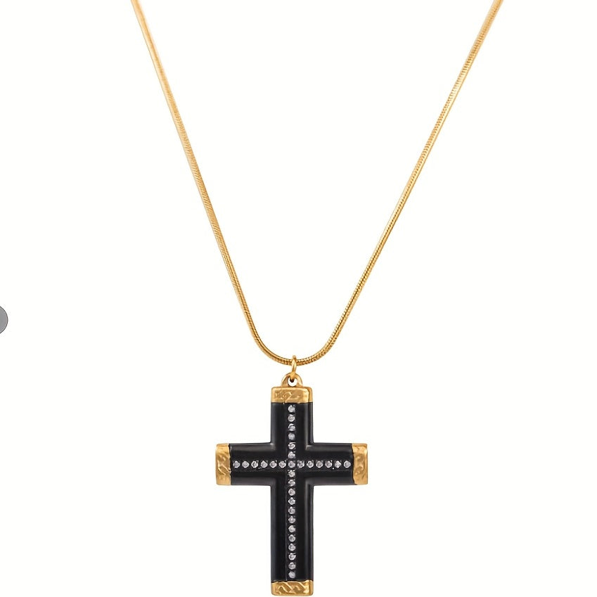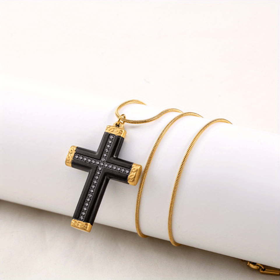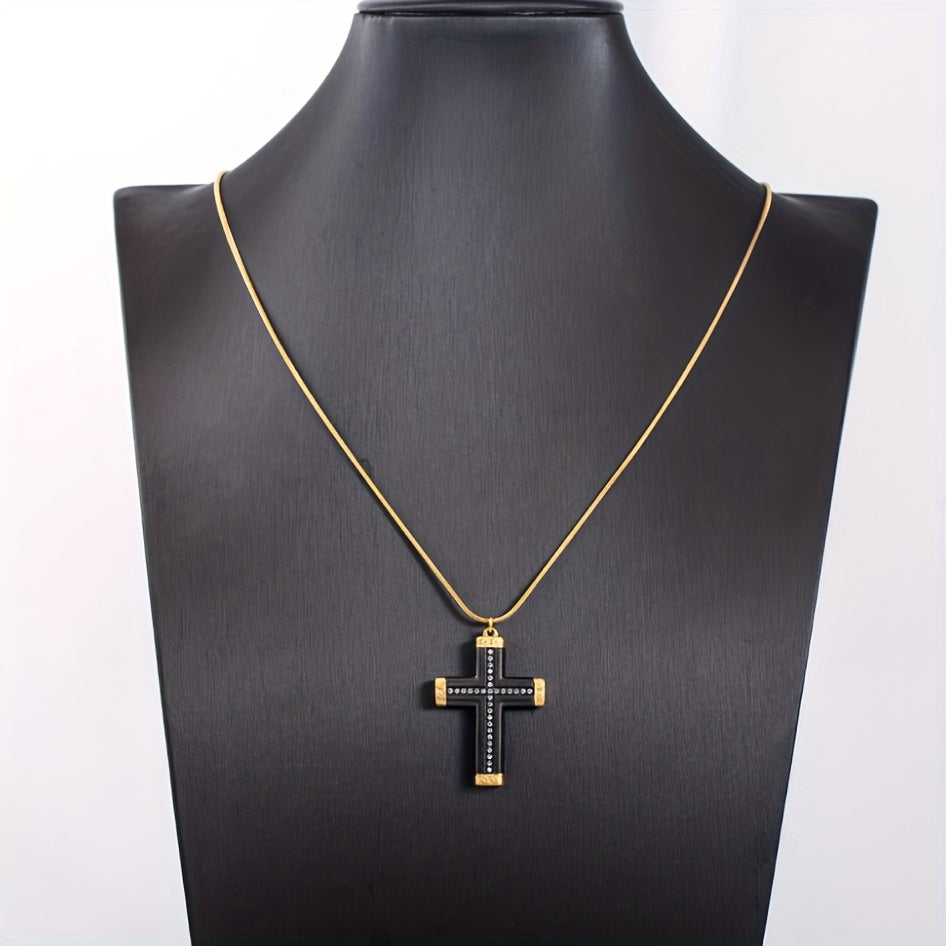 This stylish men's cross pendant necklace is made of titanium steel with a golden plated finish and rhinestone accents. It's the perfect accessory to complement your sweater chain look.