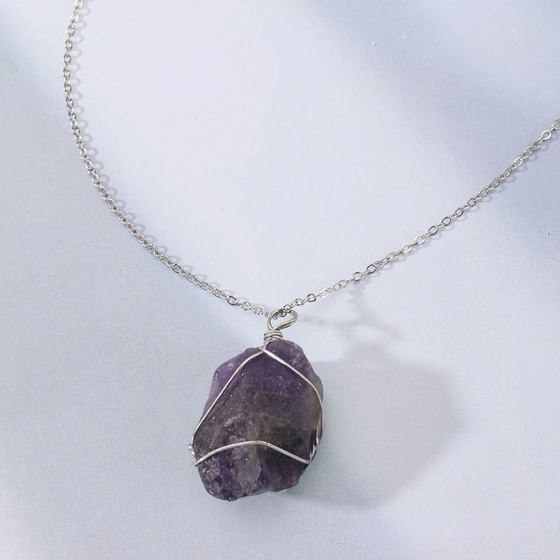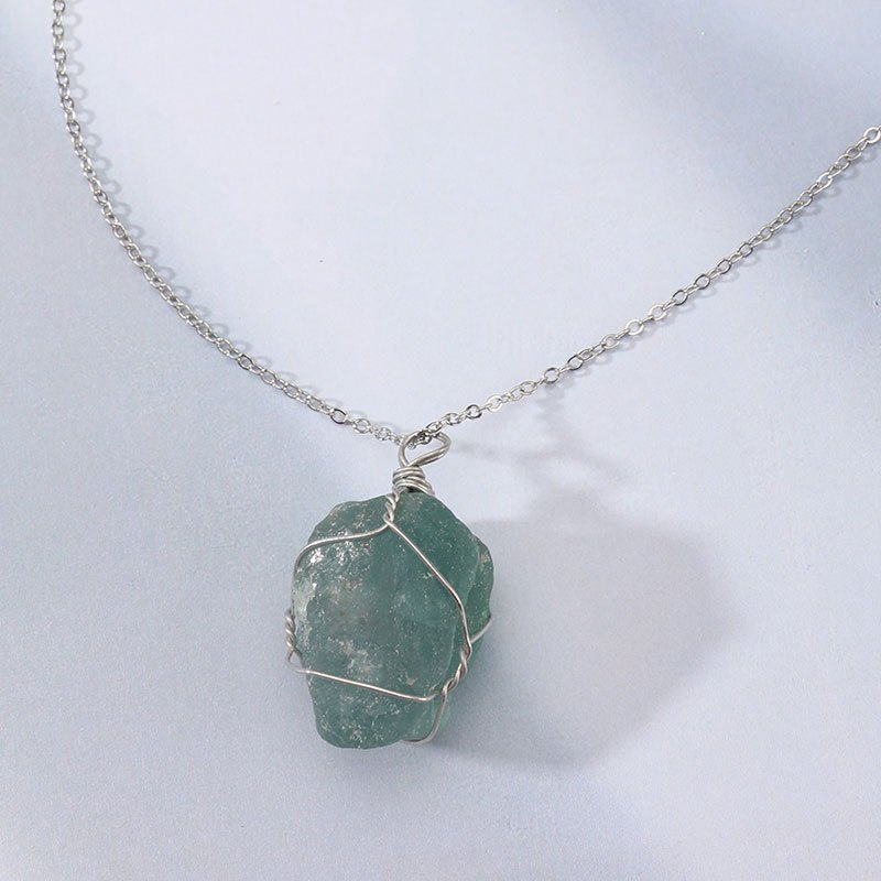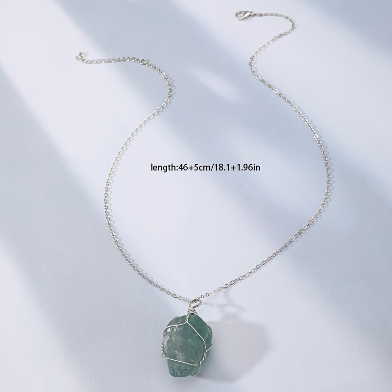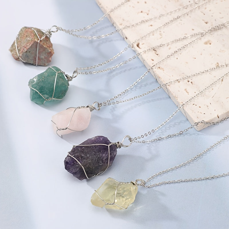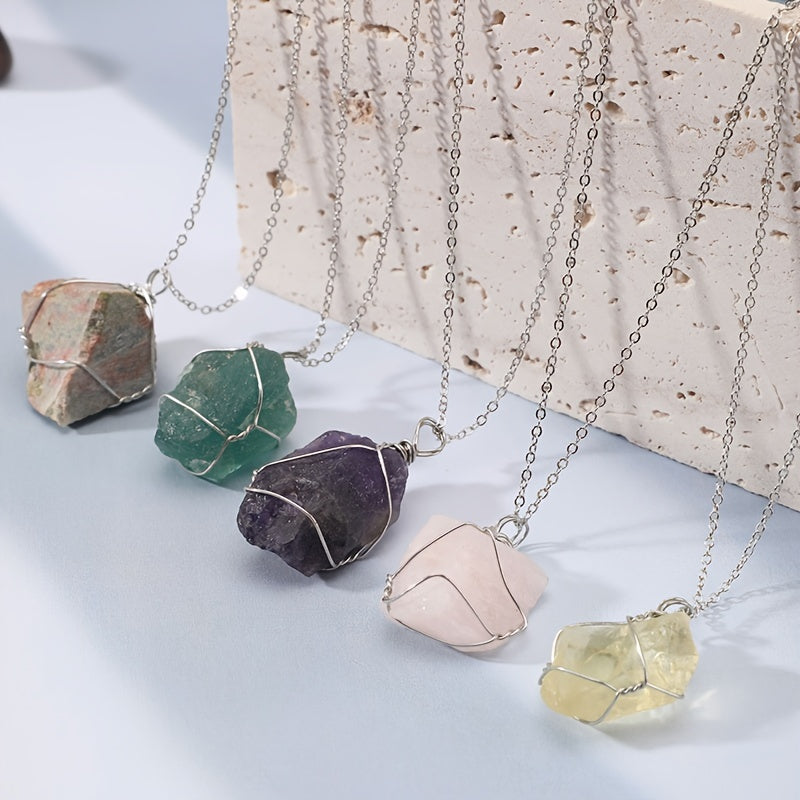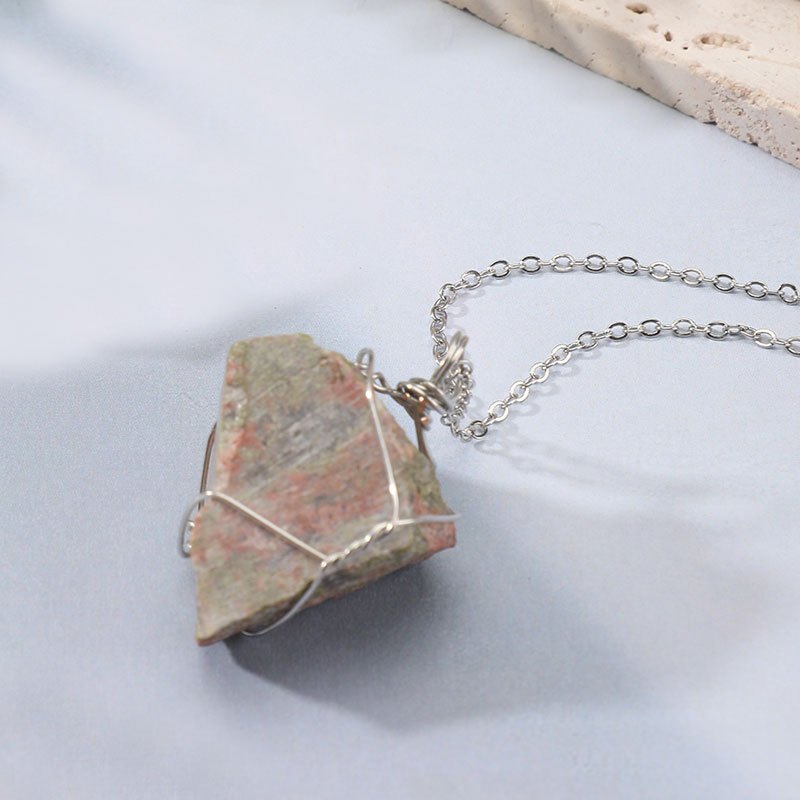 This unique necklace features irregular stones with a wire wound design, perfect for adding a rugged and stylish touch to your outfit.