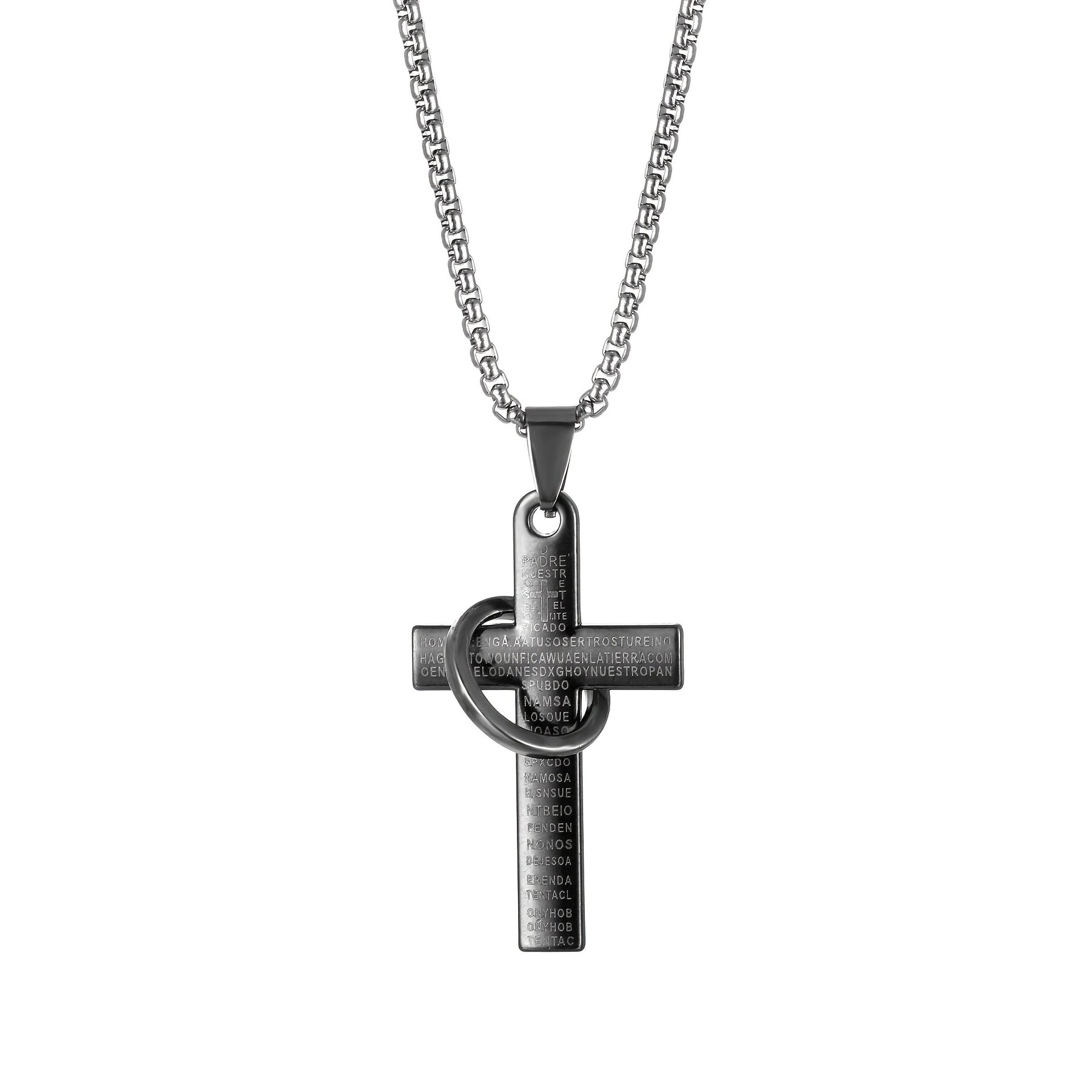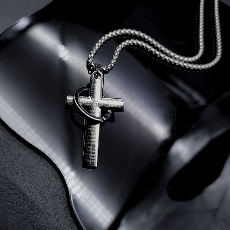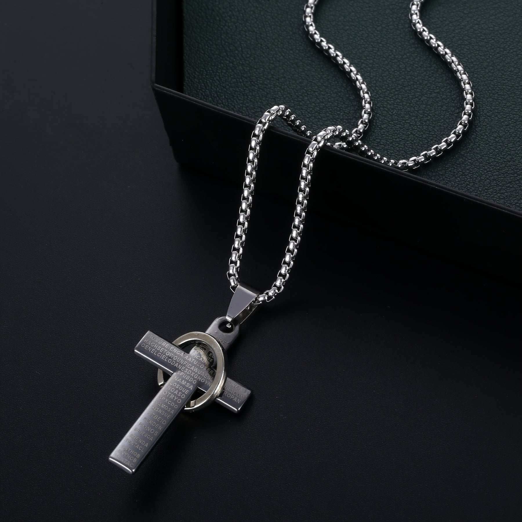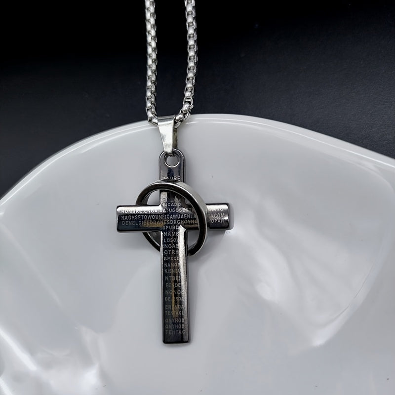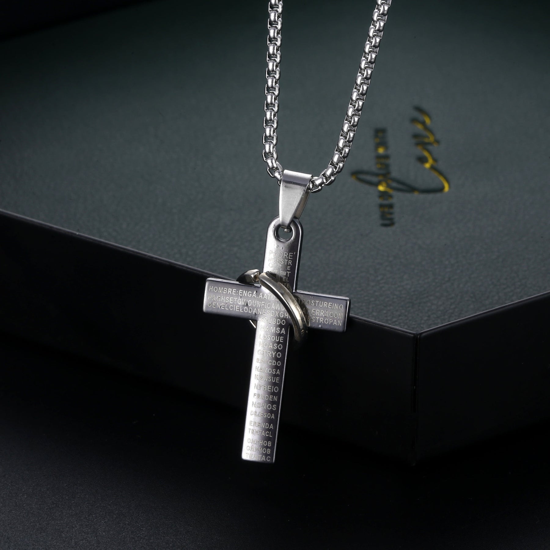 This necklace features a verse cross pendant with an artificial diamond, made of stainless steel, and comes with a long chain.