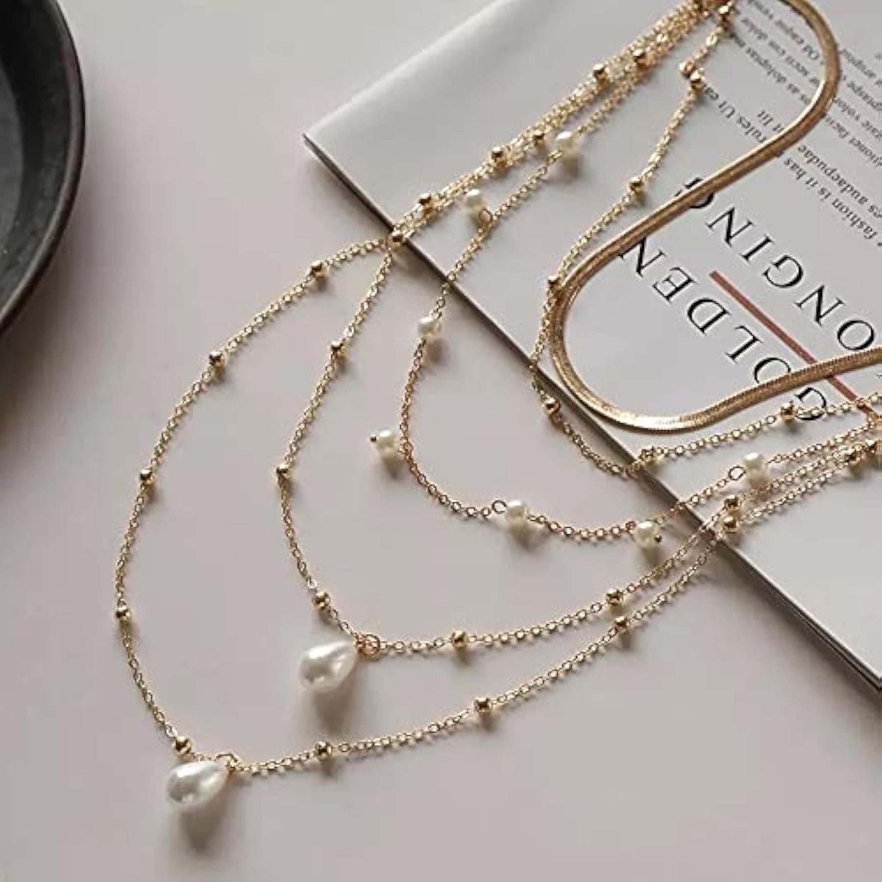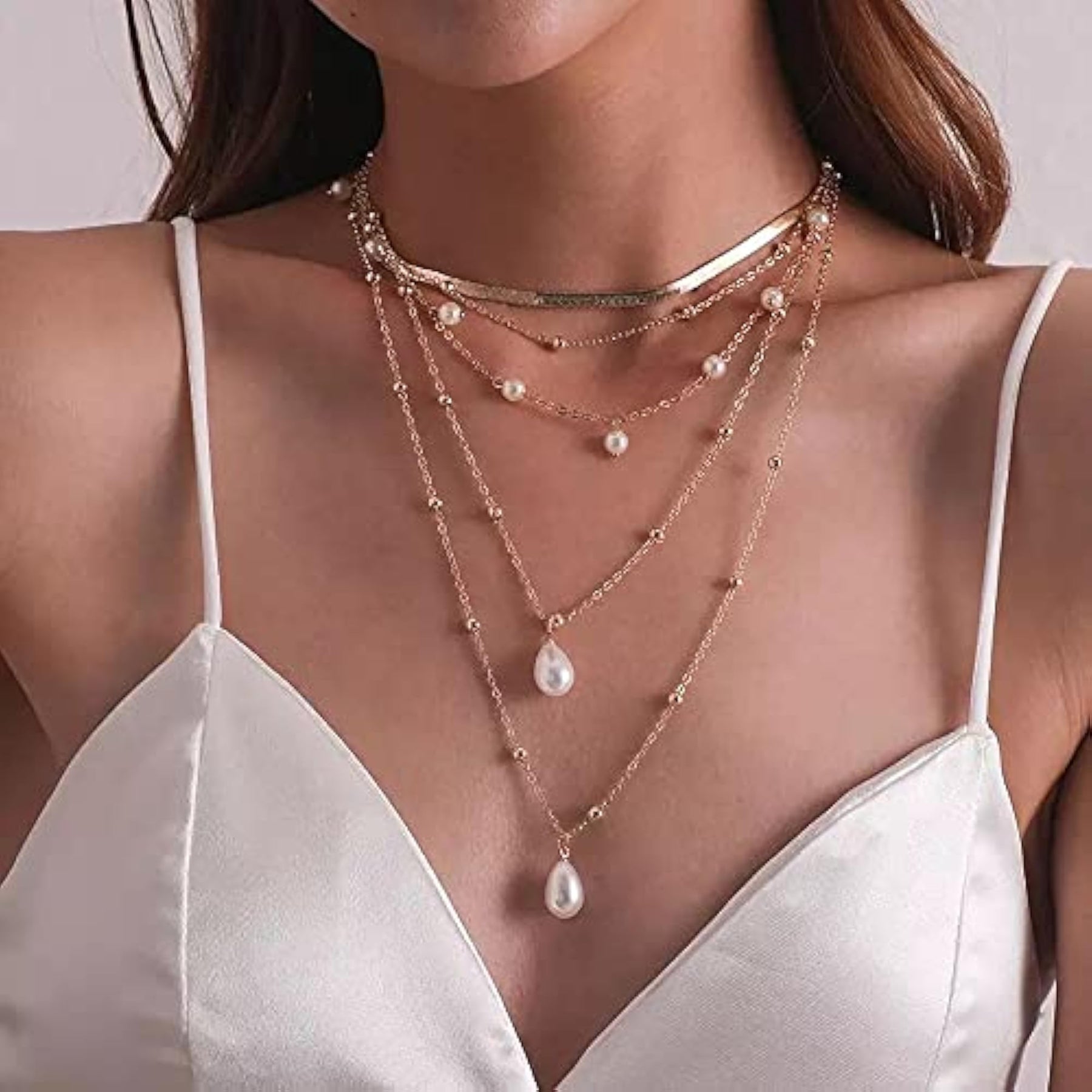 Add a touch of elegance to your look with this multilayer necklace that features metal chains and sparkly stones.