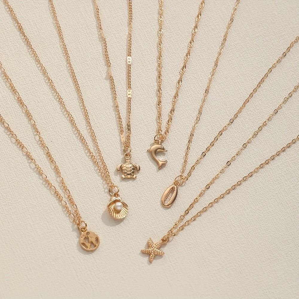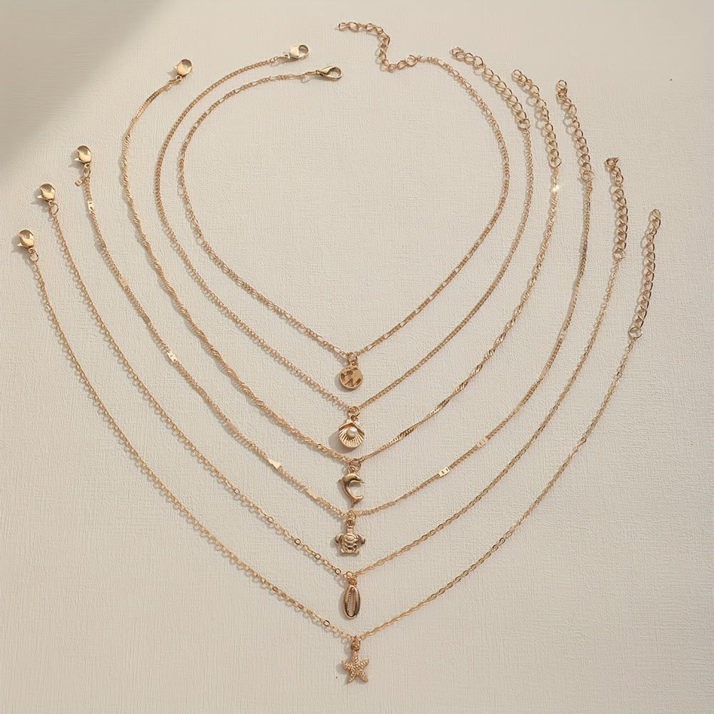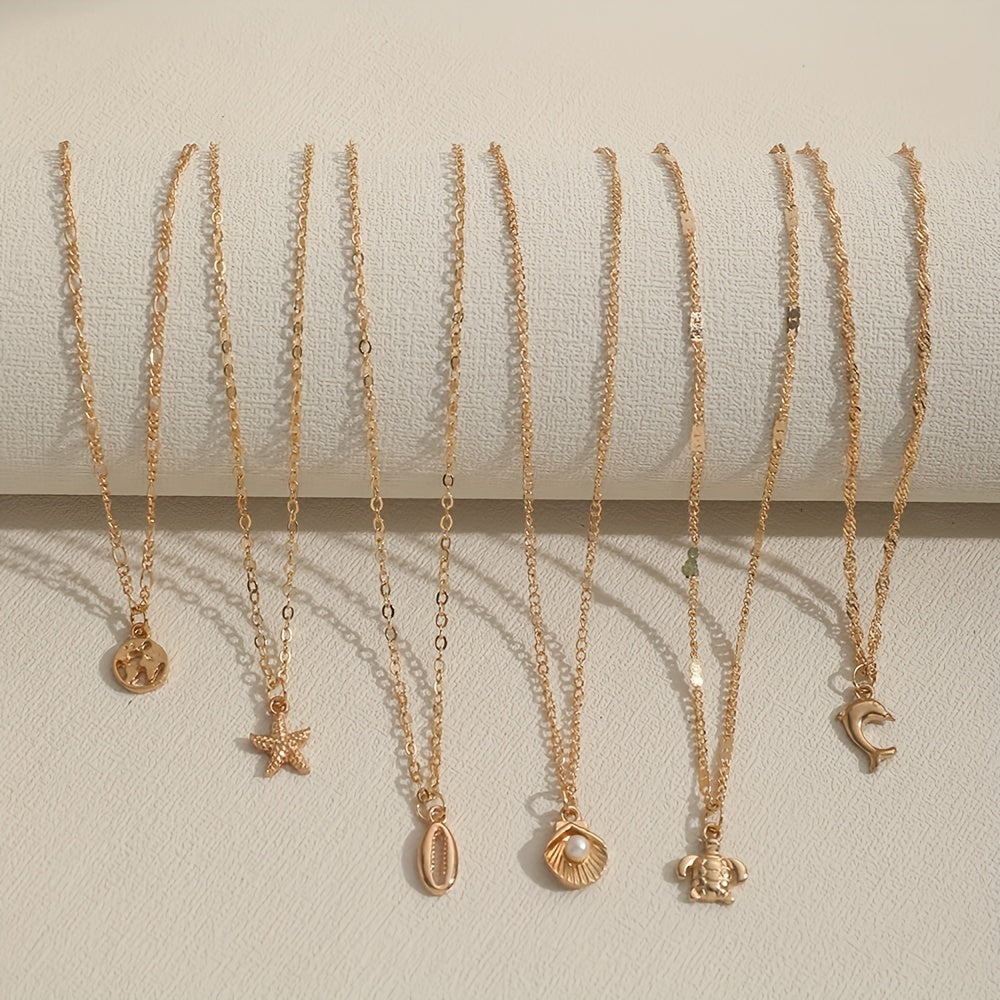 Embrace the vacation vibe with this set of 6 ocean-inspired necklaces featuring starfish, whale, faux pearl, shell, and turtle pendants.