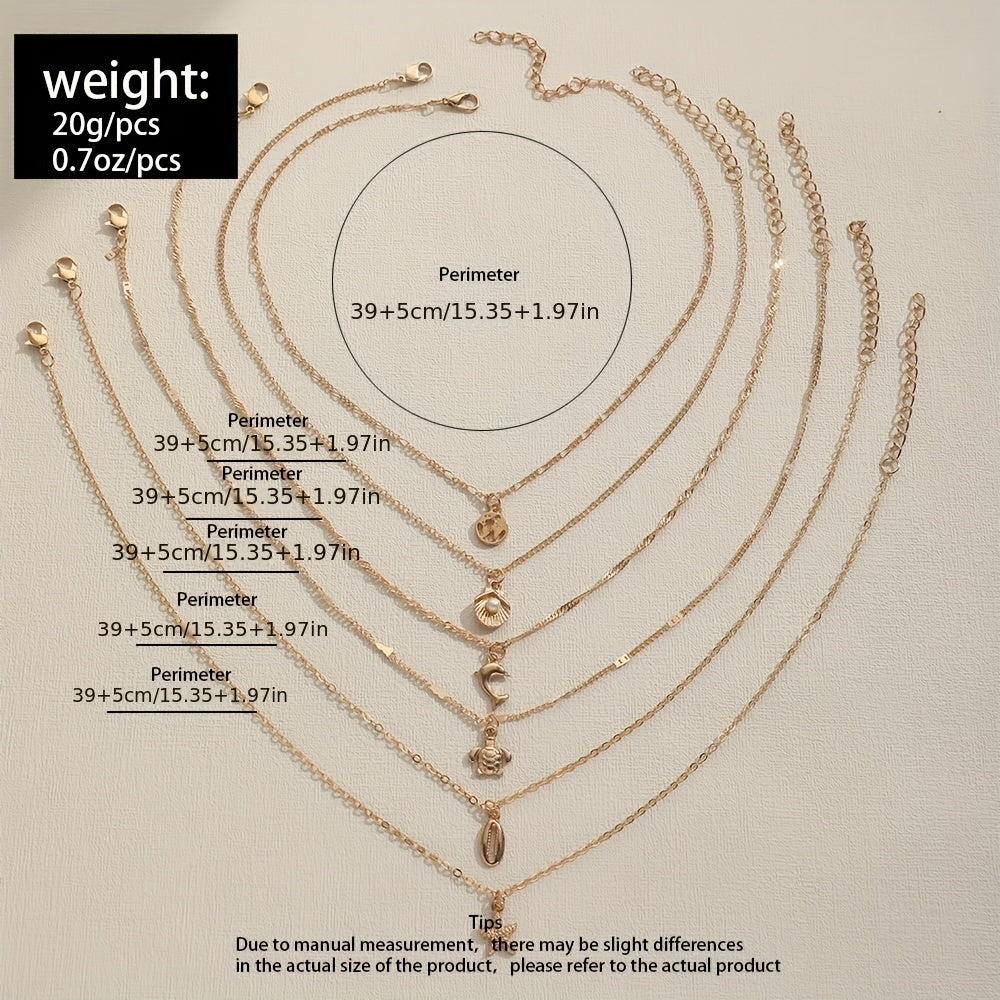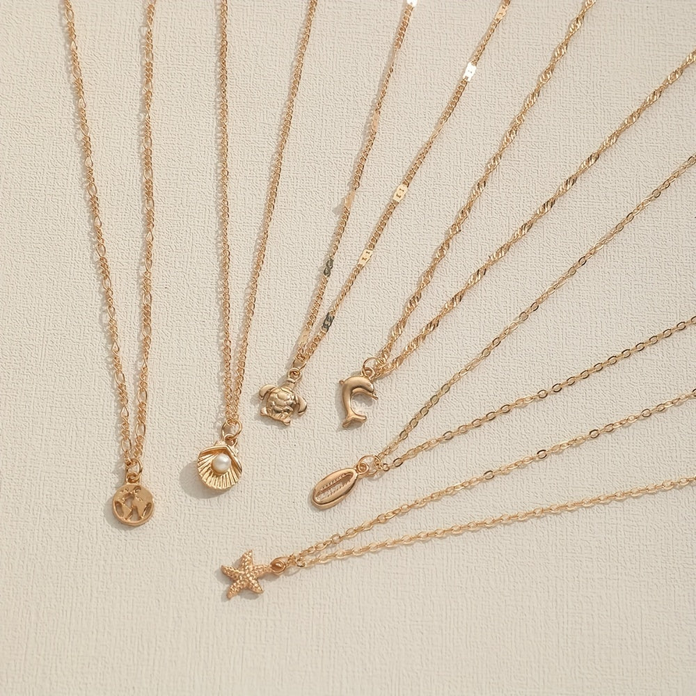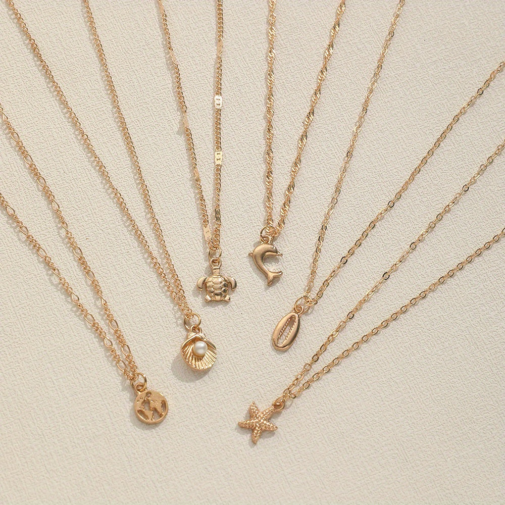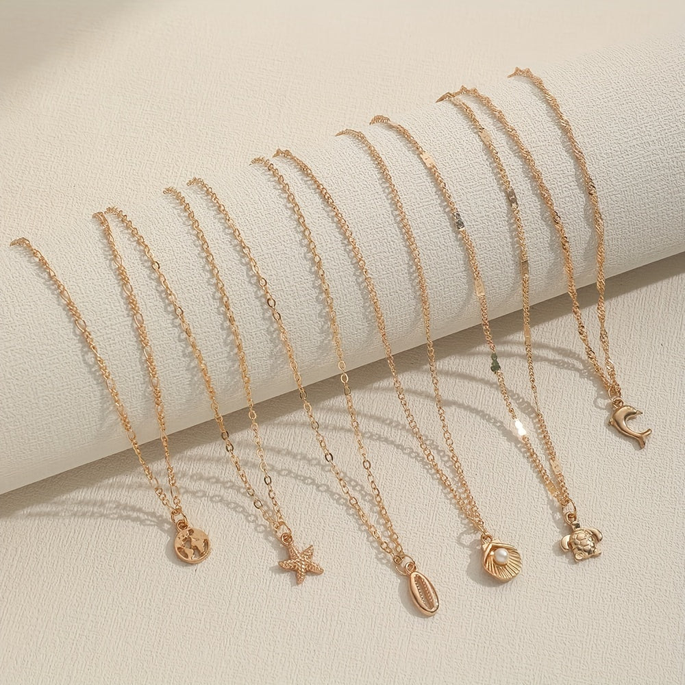 Embrace the vacation vibe with this set of 6 ocean-inspired necklaces featuring starfish, whale, faux pearl, shell, and turtle pendants.