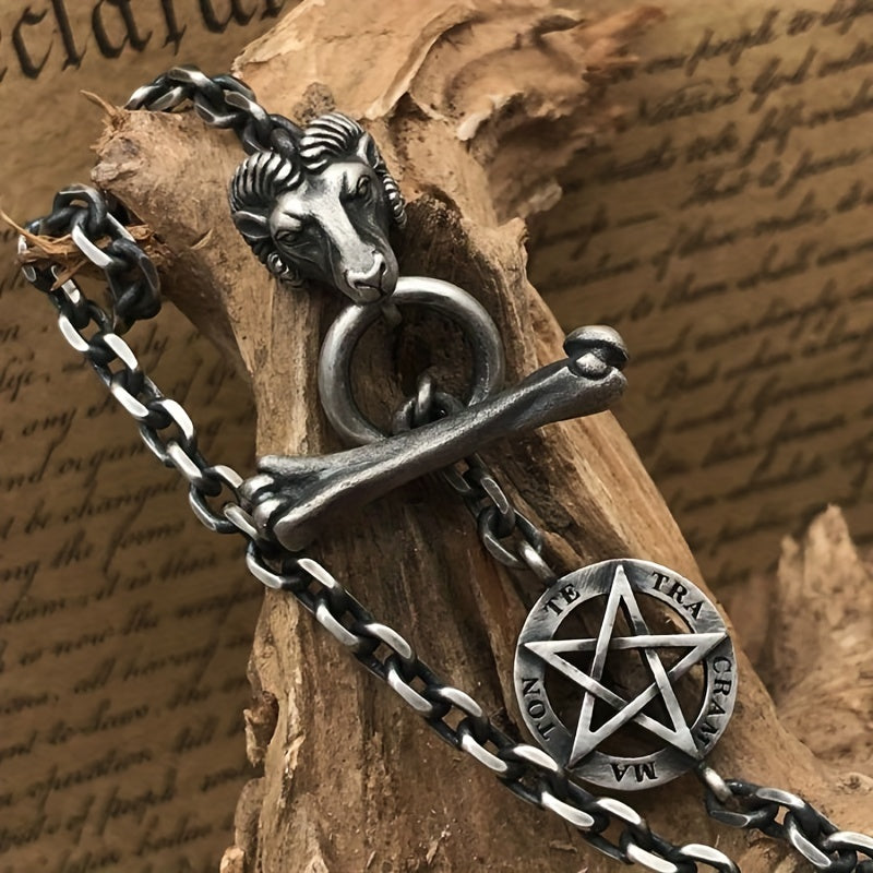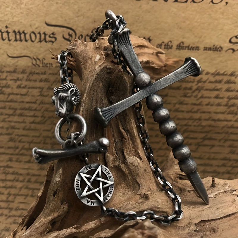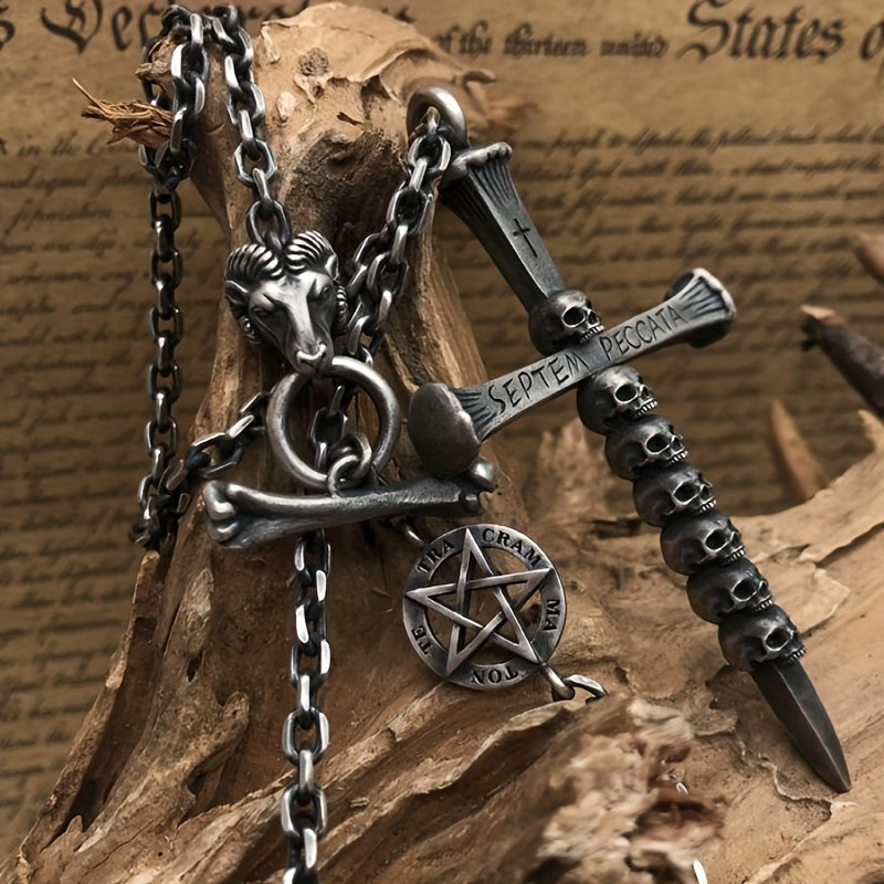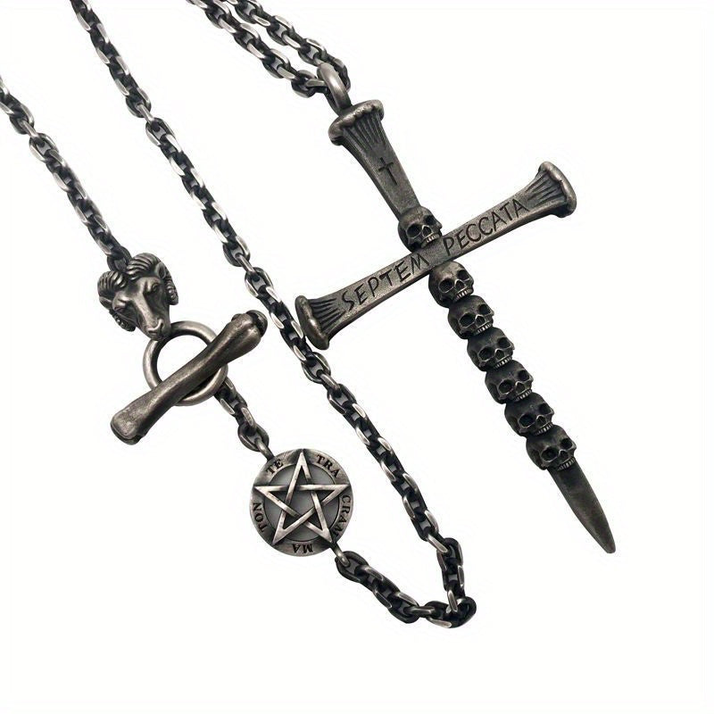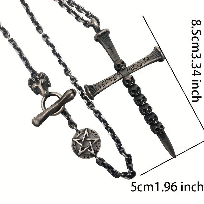 This necklace features a skeleton cross design with a retro punk hip hop style. It also includes a goat pentagram pendant for added edginess.