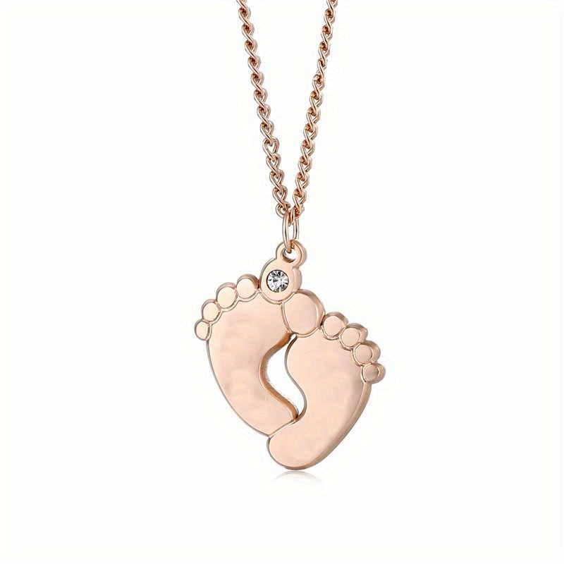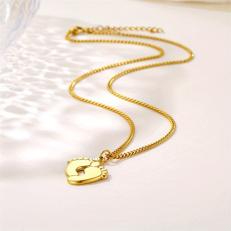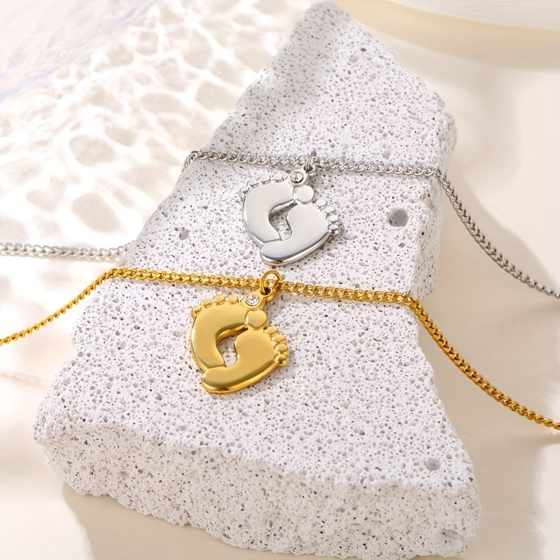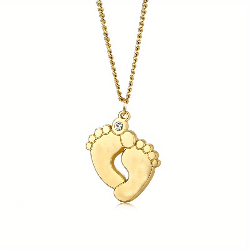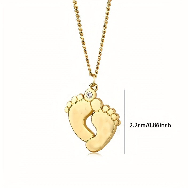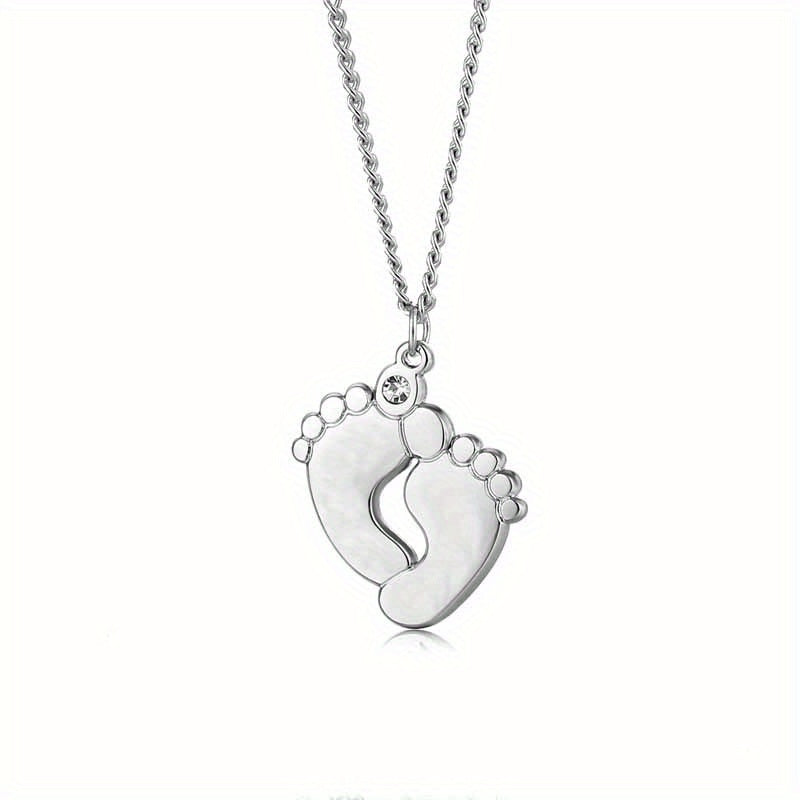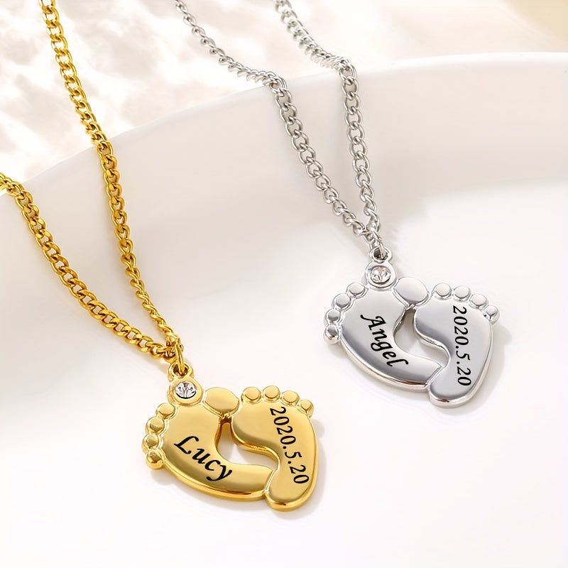 This stainless steel necklace features a baby foot design with zircon accent and can be customized with a name or date. Perfect for men's family necklace.