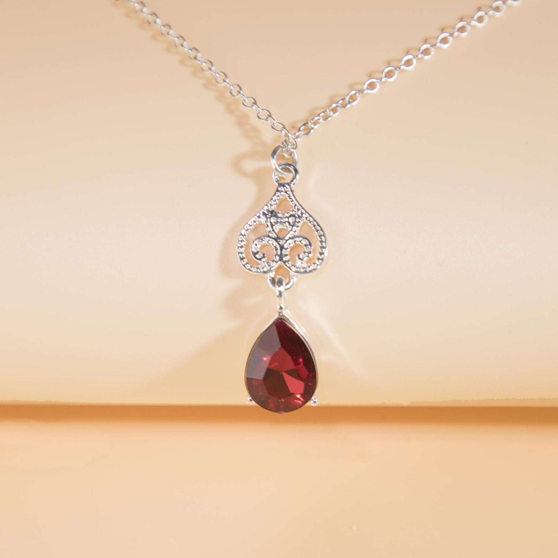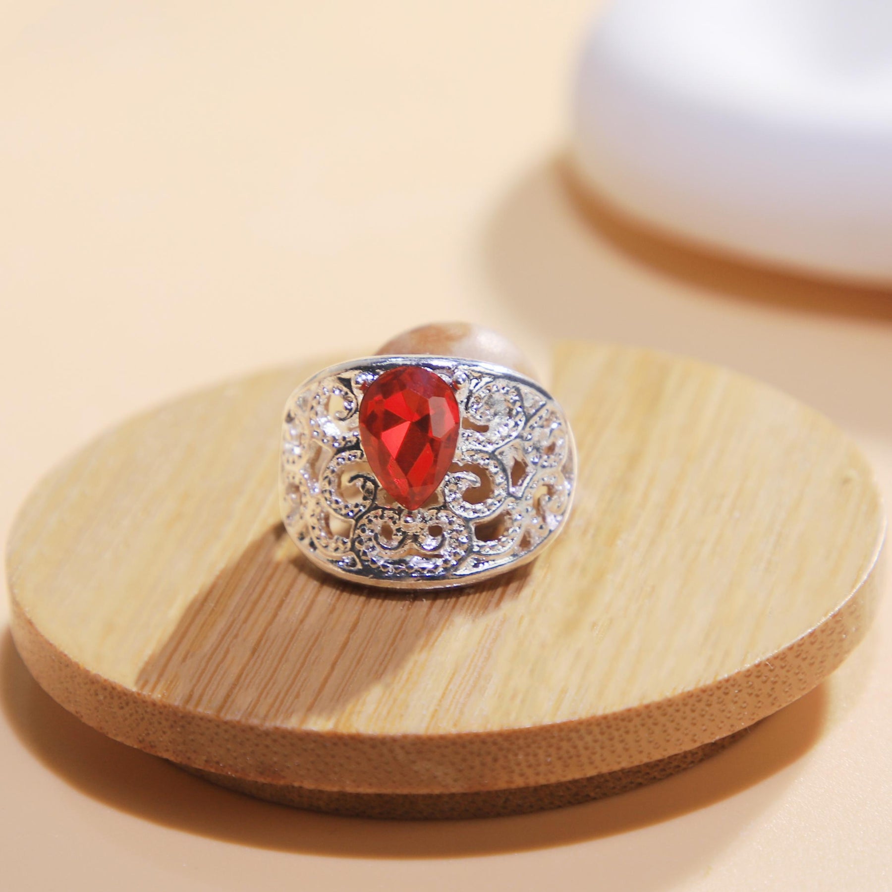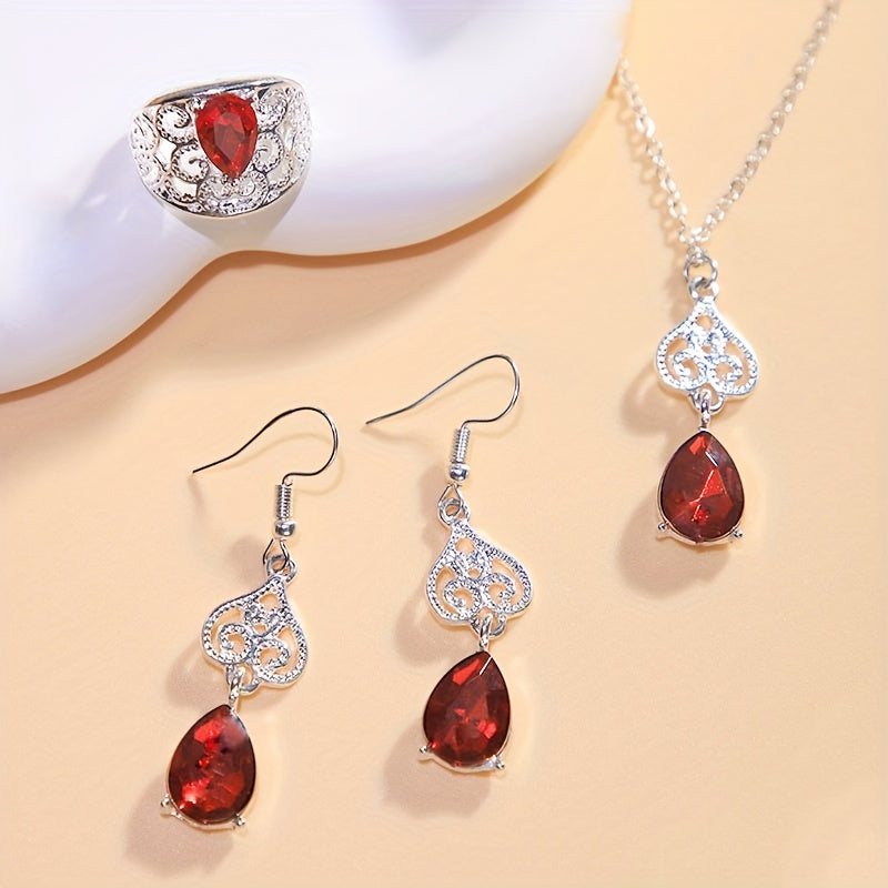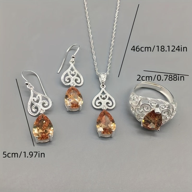 Complete your look with this elegant teardrop shape faux gemstone earrings, necklace, and ring set. Each piece is plated with 18K gold for a luxurious finish.