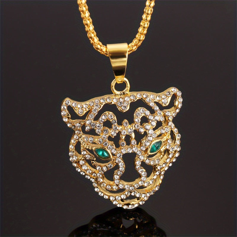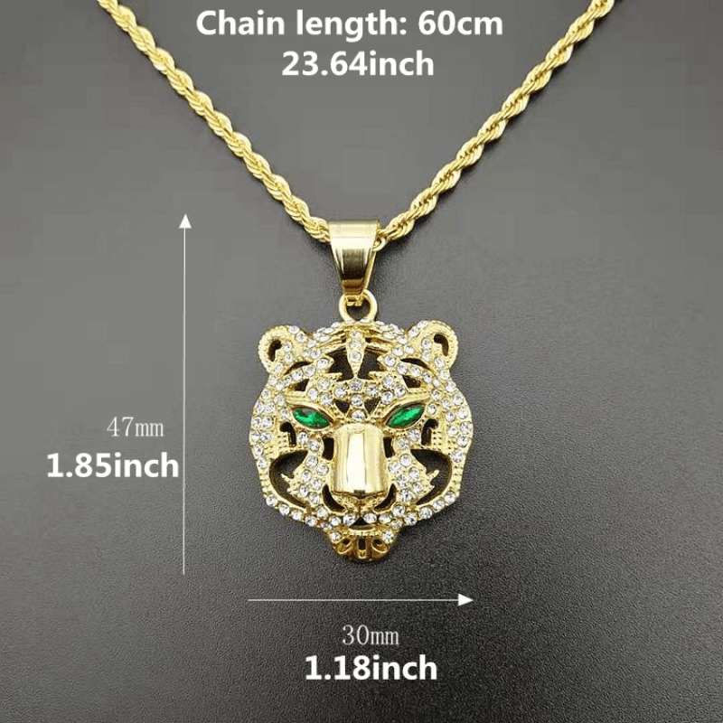 This hip hop jewelry features a tiger head pendant with sparkling cubic zirconia stones on a tennis chain. Perfect for both men and women.