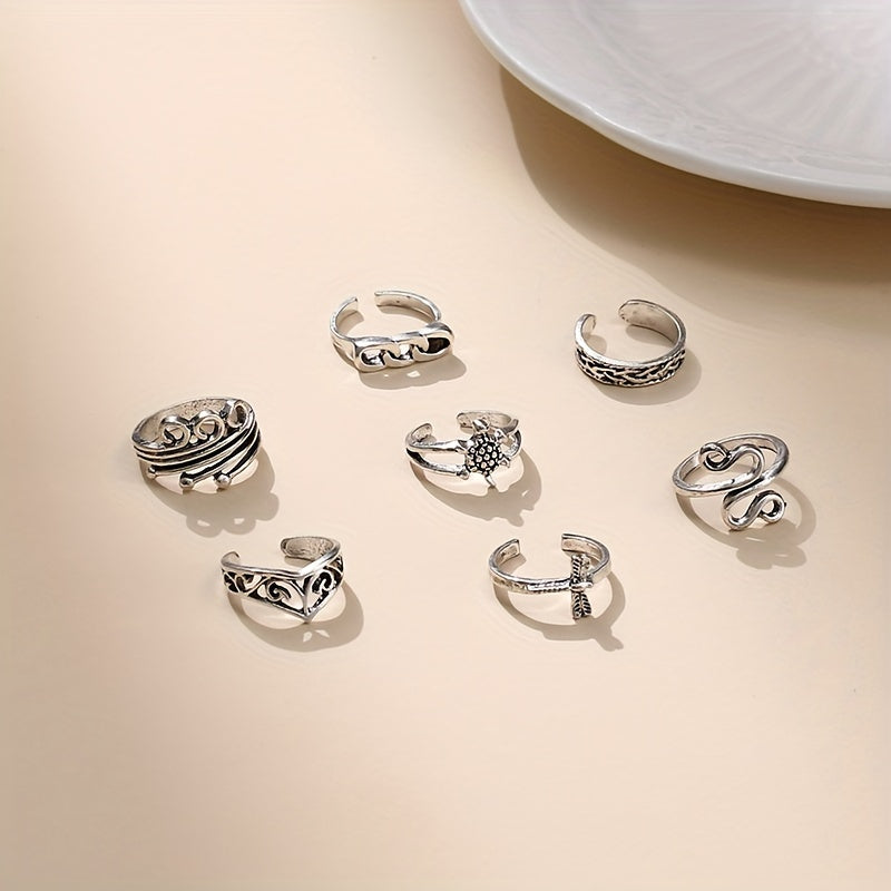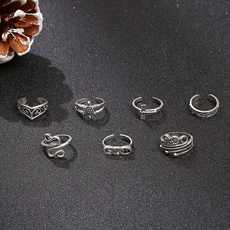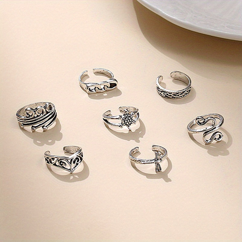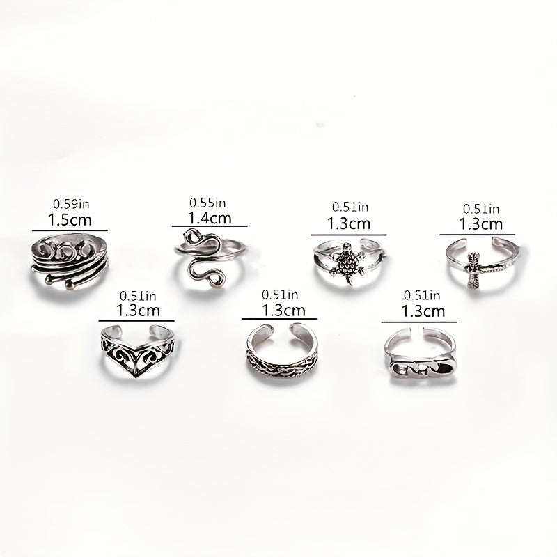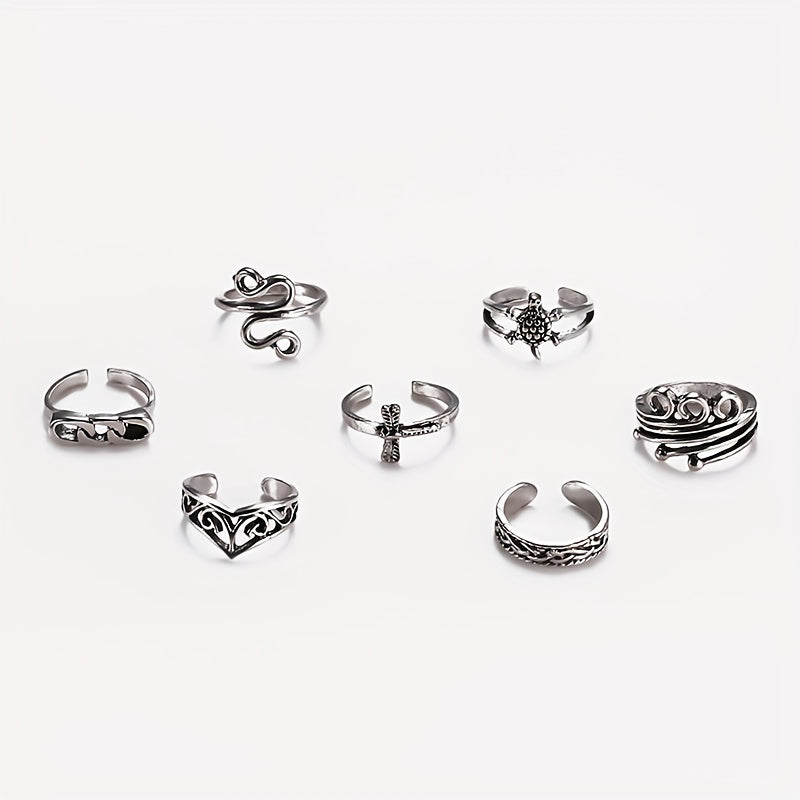 Elevate your style with this set of 7 chain foot rings featuring turtle, dragonfly, and snake designs. Each ring is adjustable for a comfortable fit.