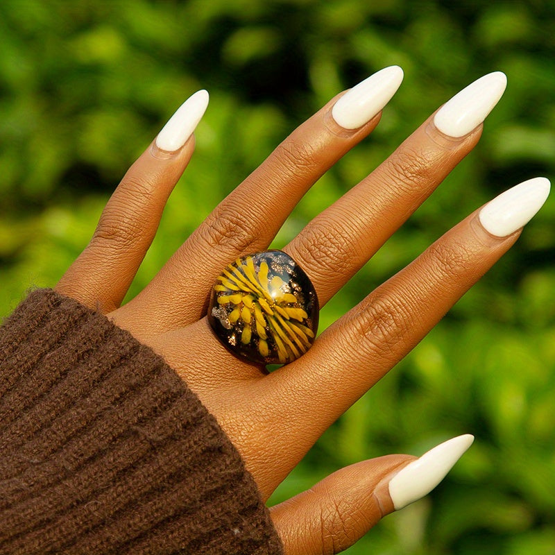 Add a touch of boho style to your daily outfits with this wide ring featuring a flower pattern and sparkling powder. The perfect accessory for your summer vacation look.