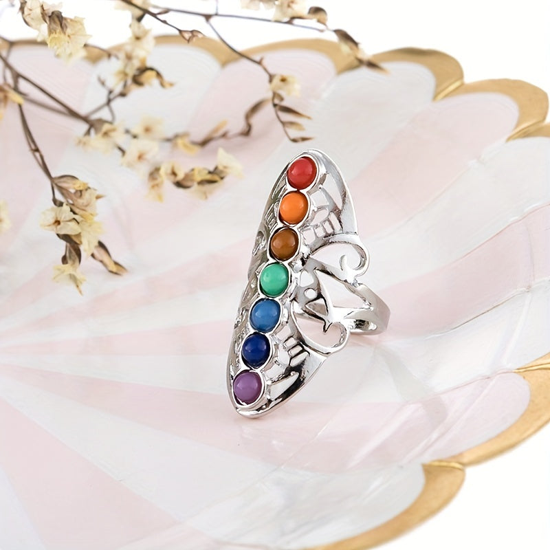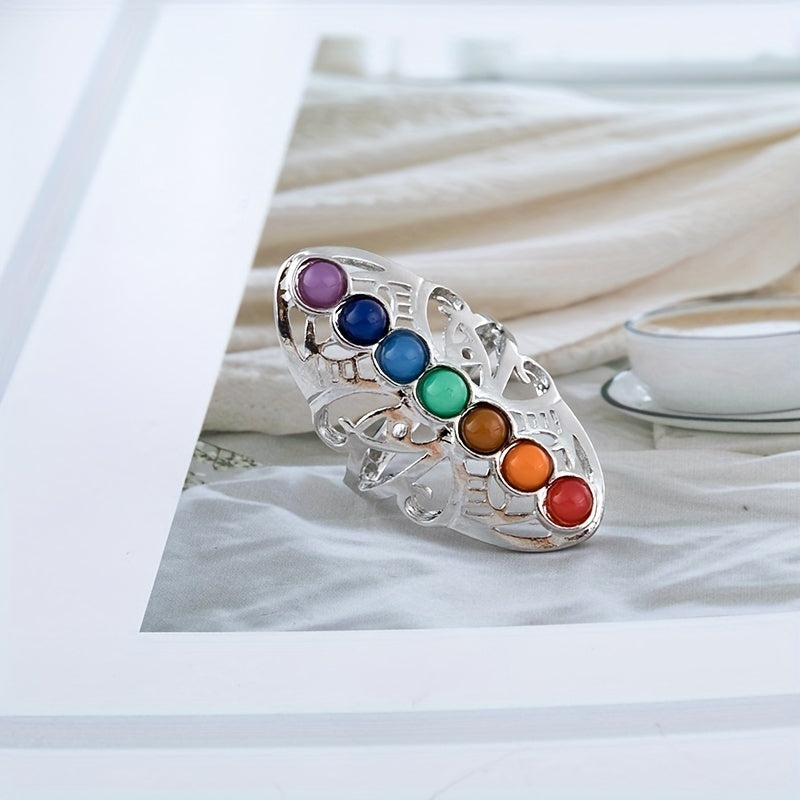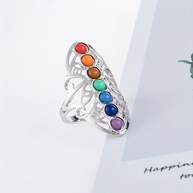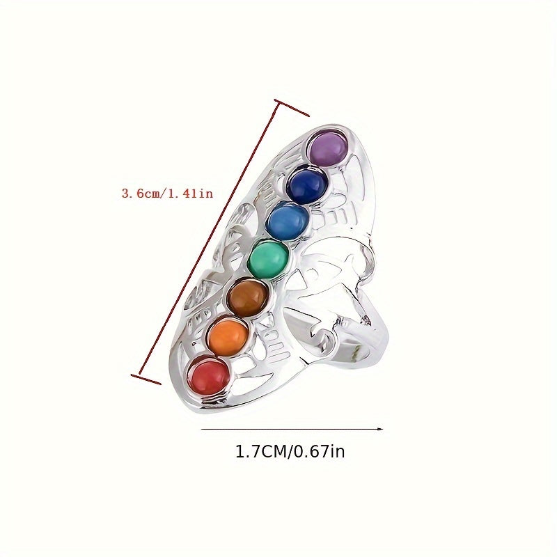 Enhance your style with this multicolor seven chakra gemstone ring featuring a silver plated finish. Perfect for adding a touch of spiritual elegance to your look.