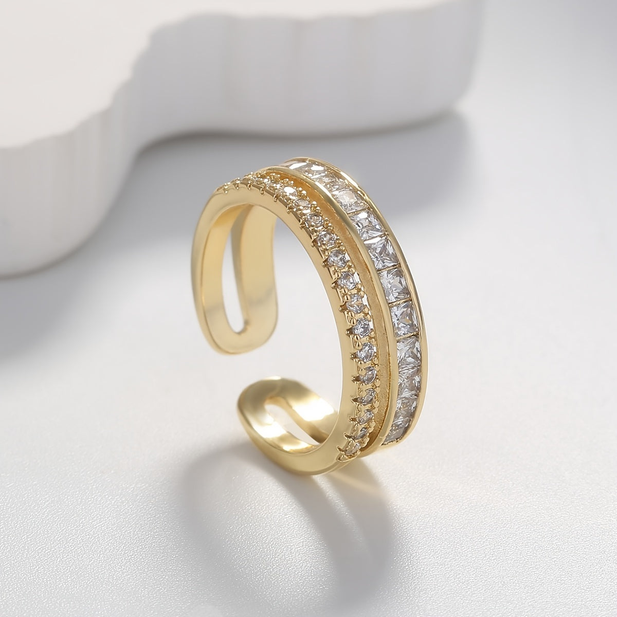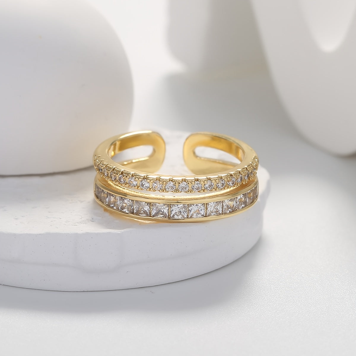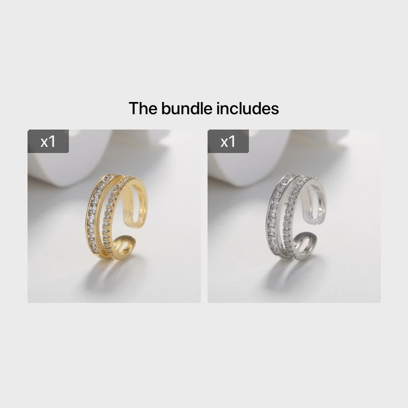 Add a touch of elegance to your outfit with this European light style double ring featuring zircon stones. This adjustable ring is plated with 14K gold, making it a perfect jewelry accessory for women.