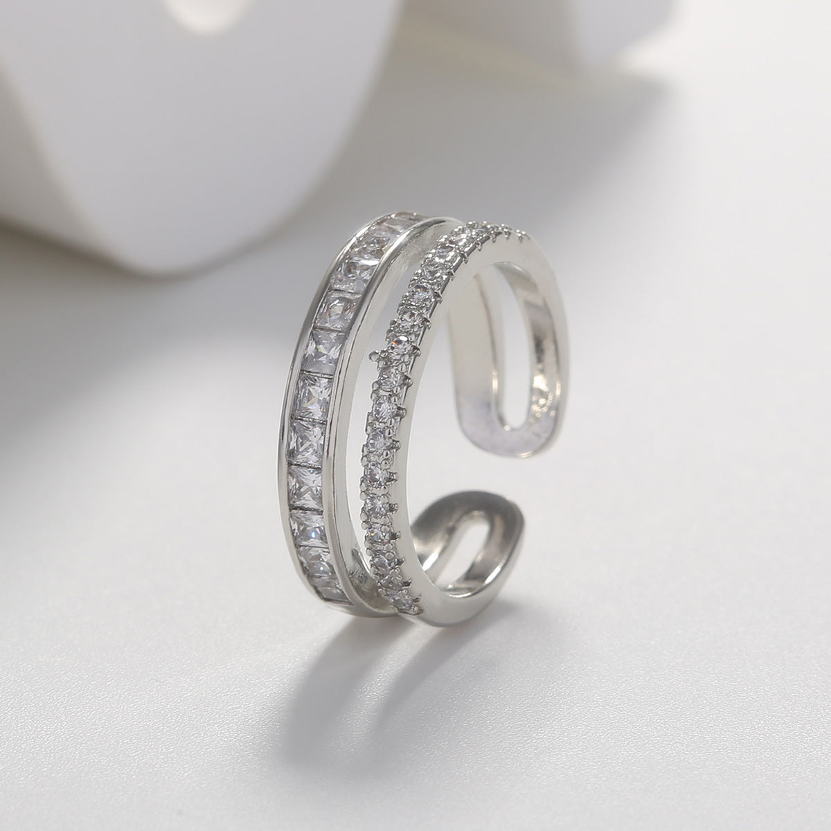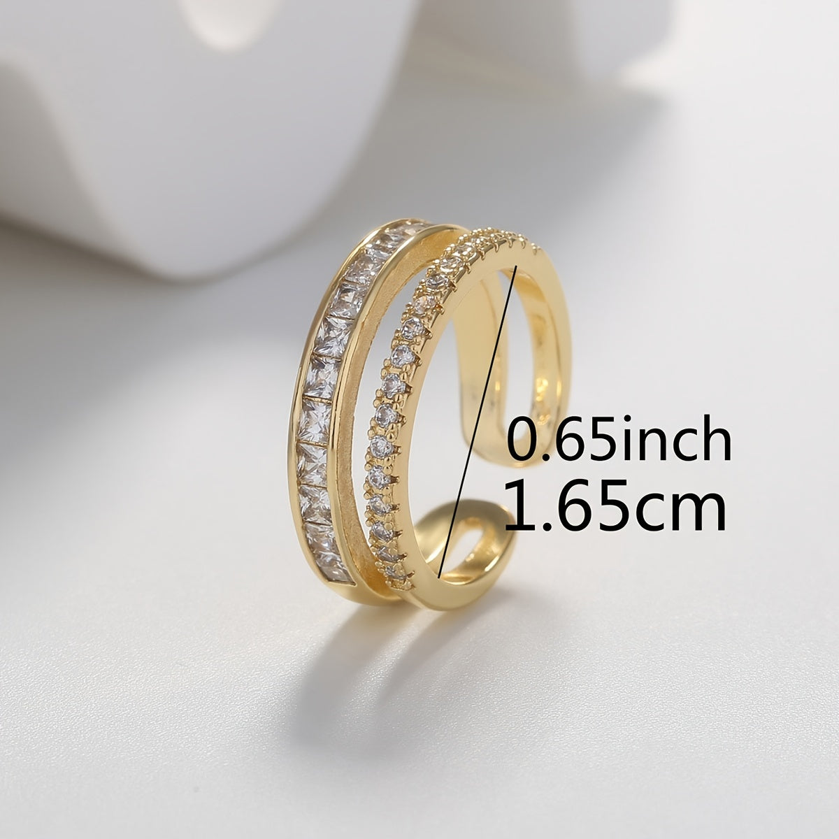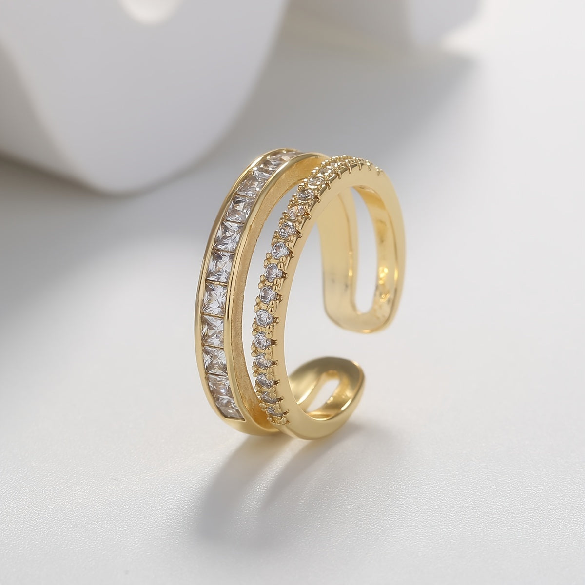 Add a touch of elegance to your outfit with this European light style double ring featuring zircon stones. This adjustable ring is plated with 14K gold, making it a perfect jewelry accessory for women.