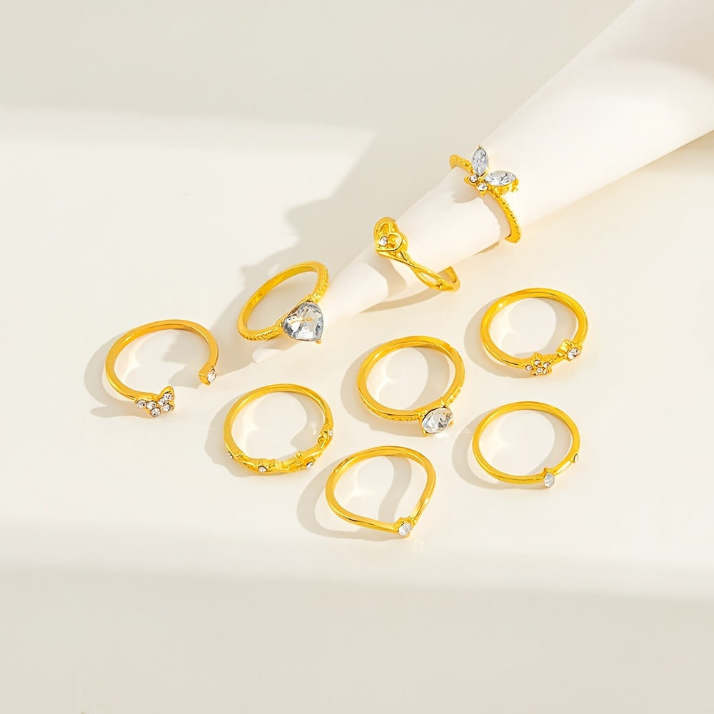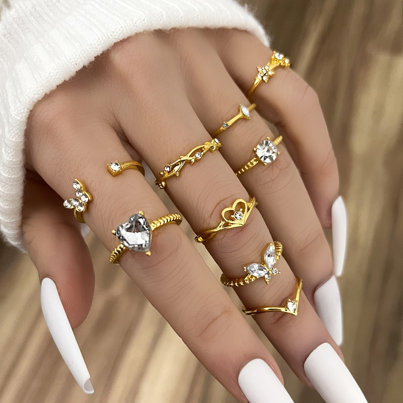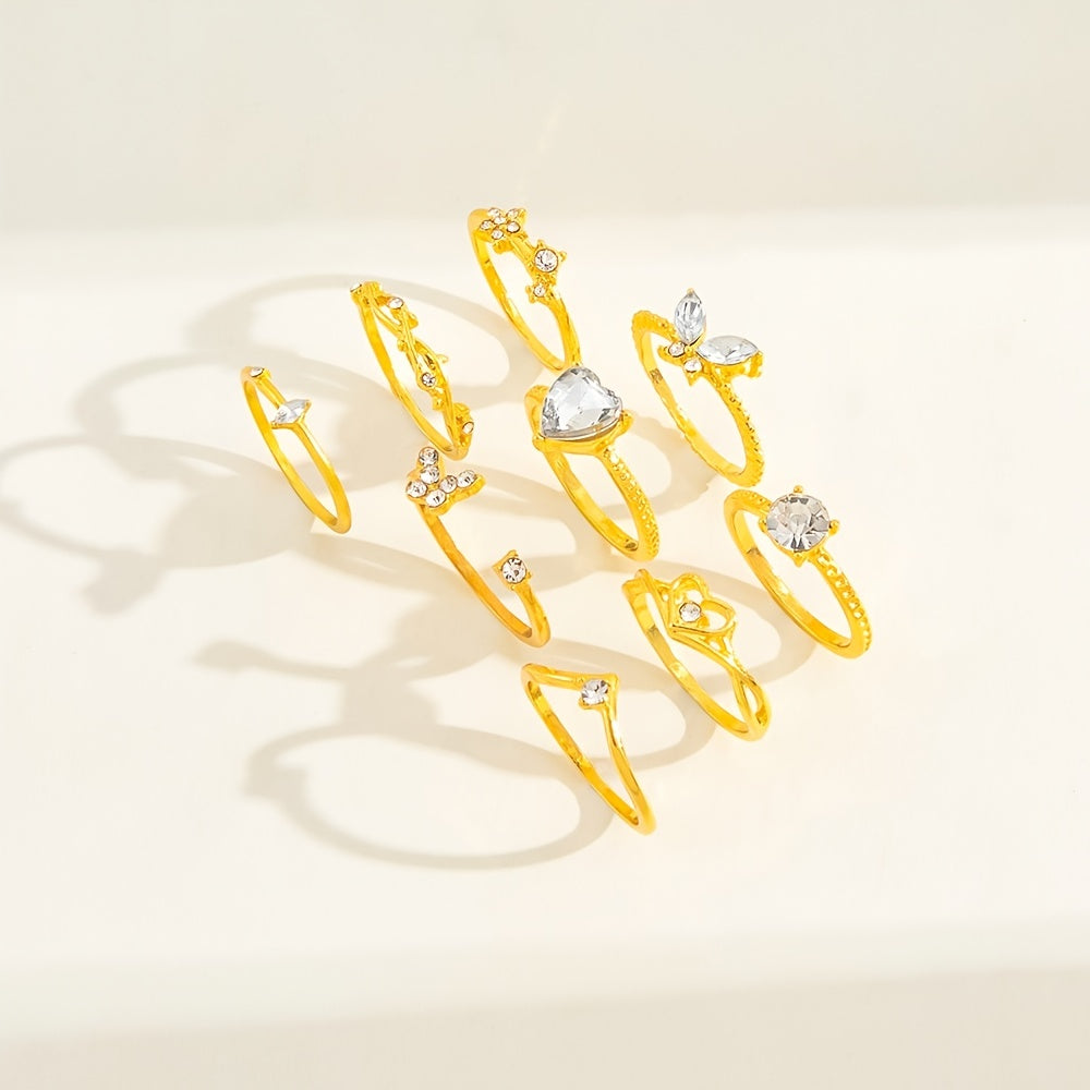 Elevate your look with this stunning 9-piece ring set featuring a mix of butterfly, heart, and branch designs. Each ring is adorned with full rhinestones for a luxurious and versatile style.