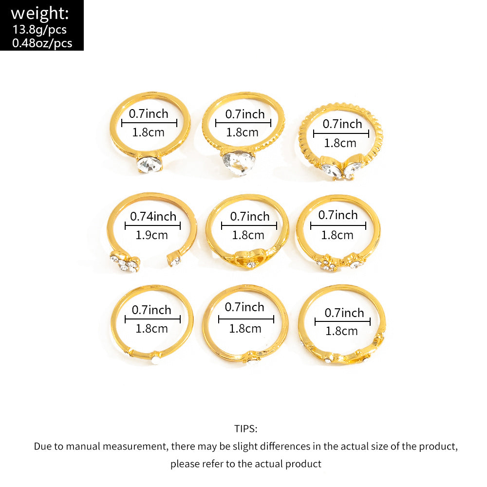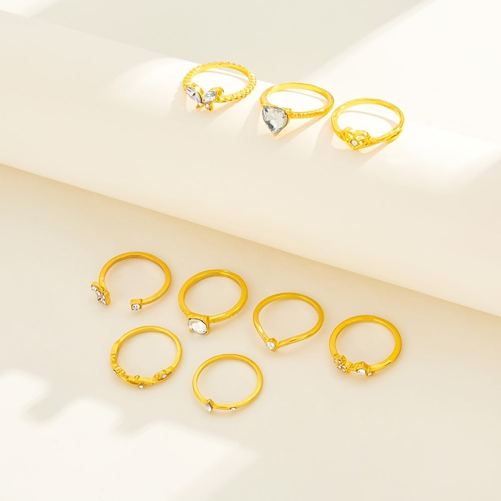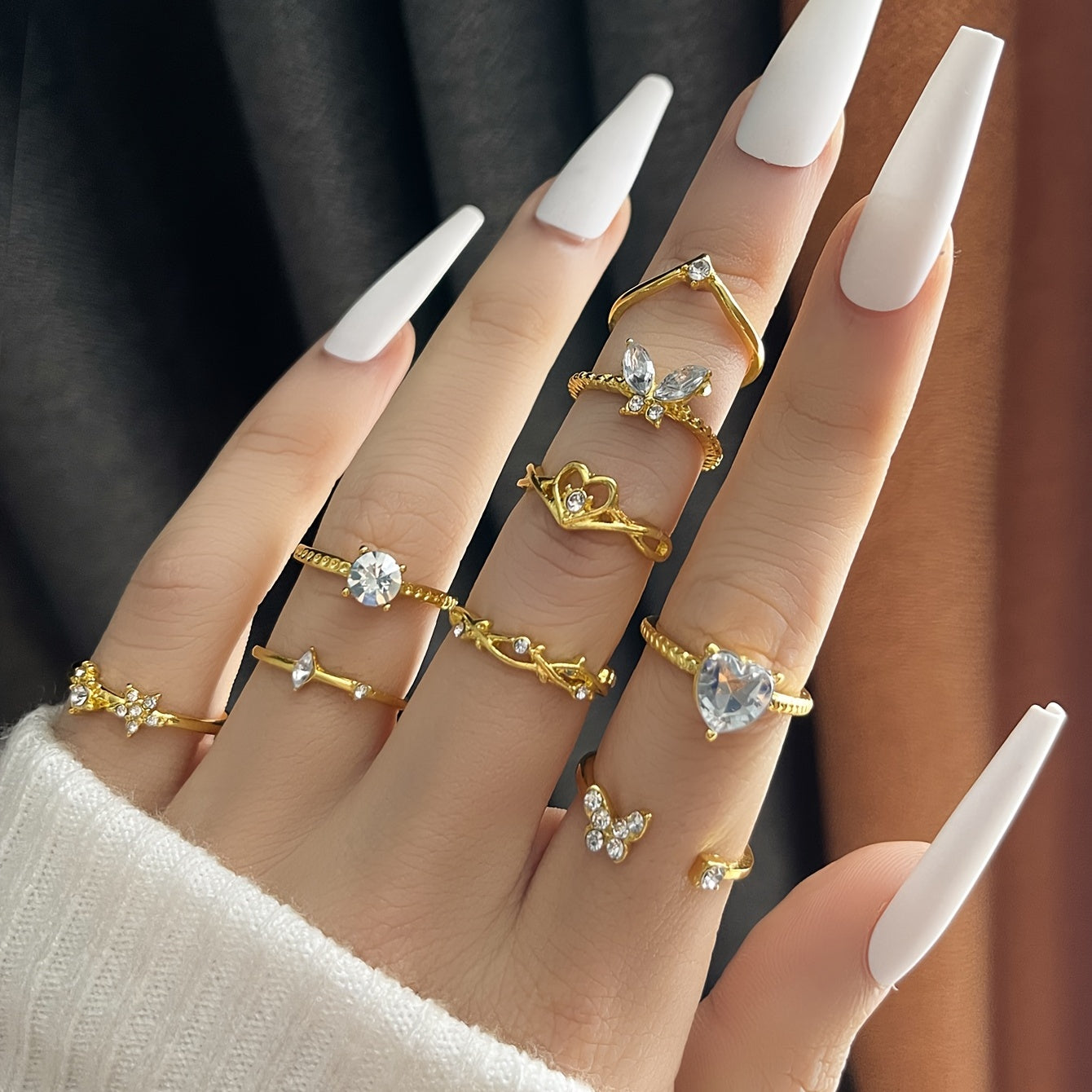 Elevate your look with this stunning 9-piece ring set featuring a mix of butterfly, heart, and branch designs. Each ring is adorned with full rhinestones for a luxurious and versatile style.