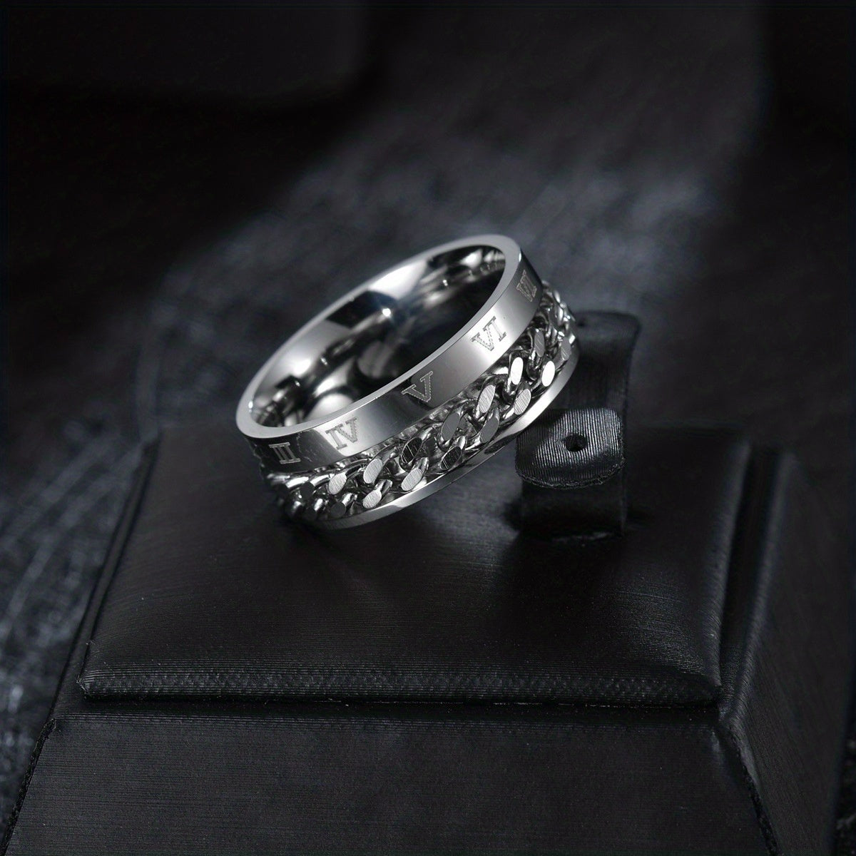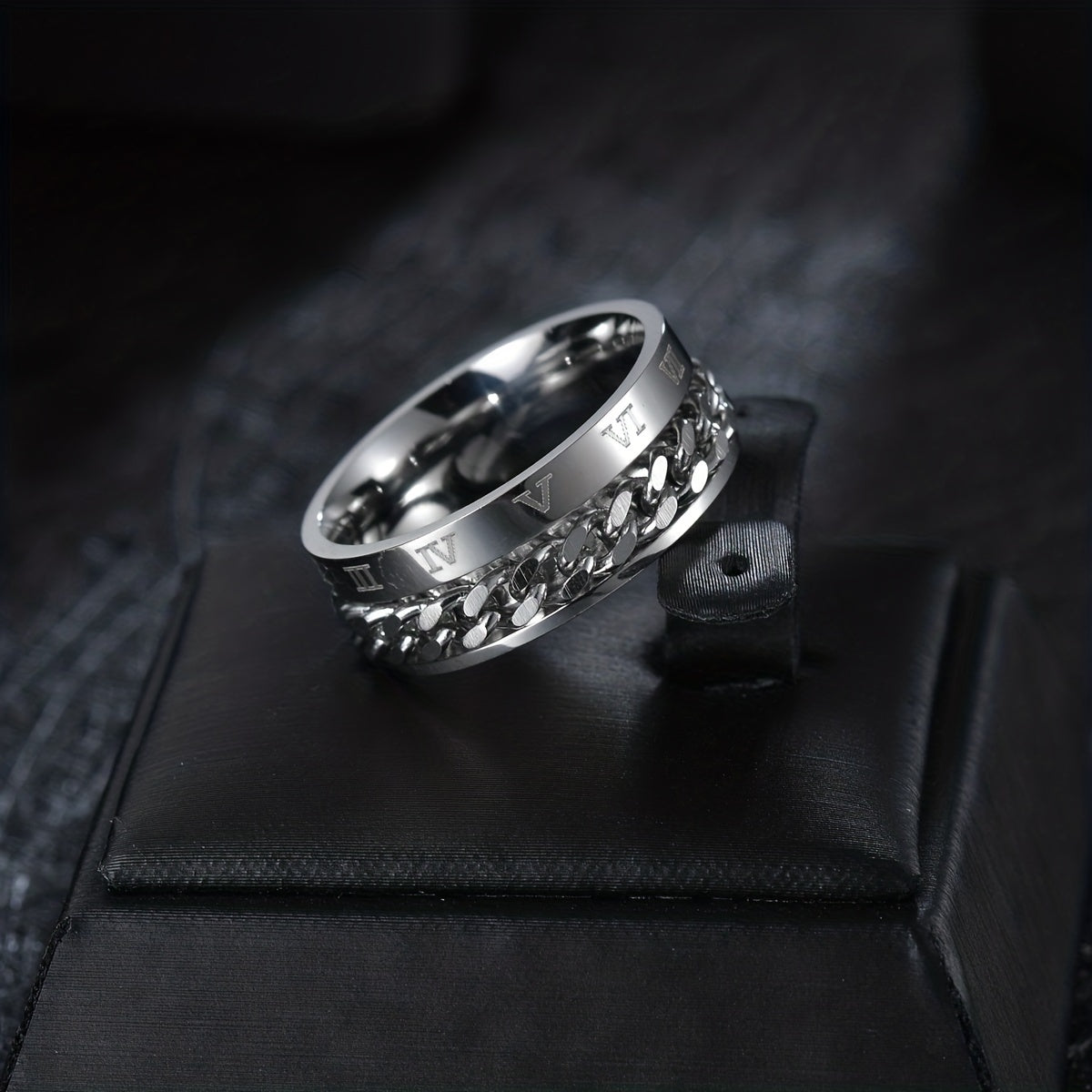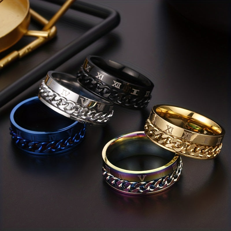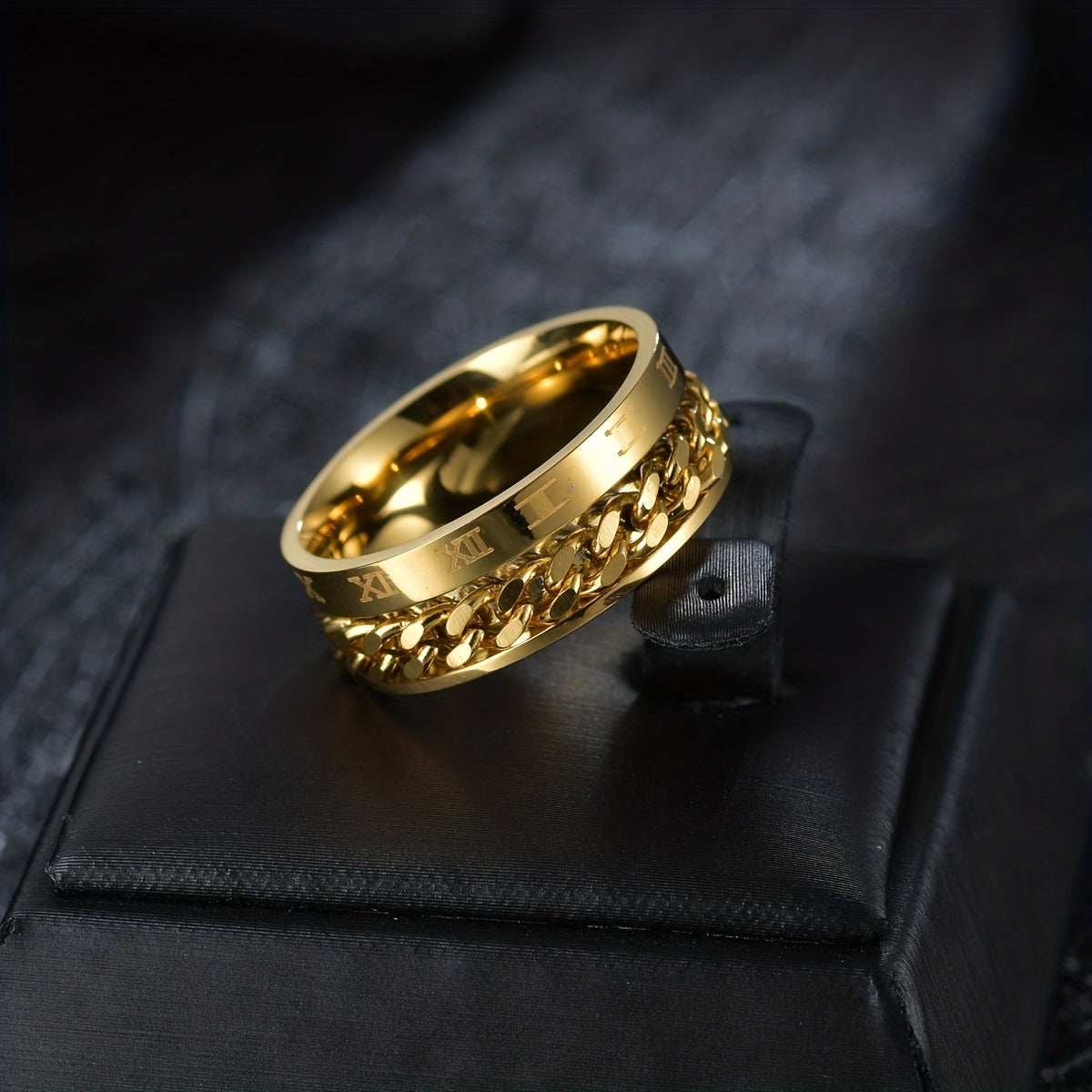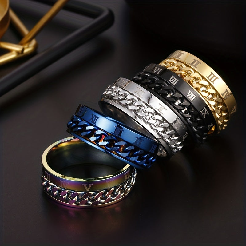 This stainless steel ring features a golden color with numerals design. The spinner chain adds a unique touch to the ring.