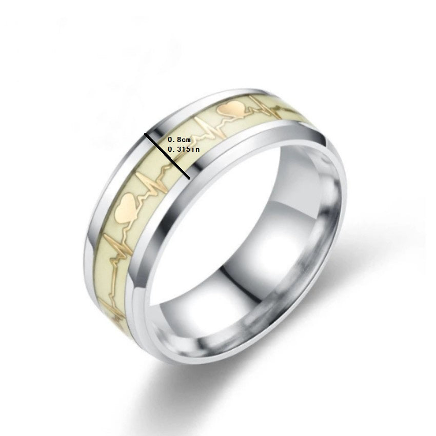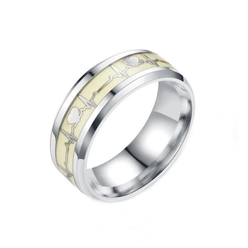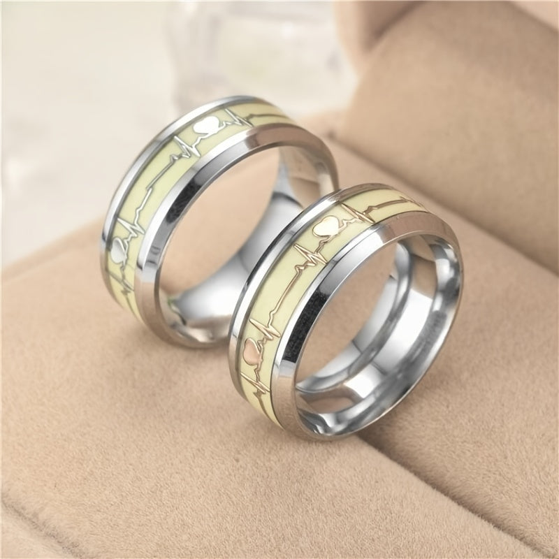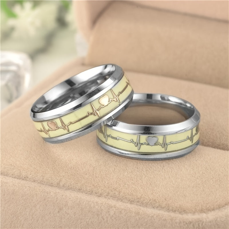 This luminous ring features an EKG heartbeat design that glows in the dark. Made from durable stainless steel, this couple ring is a perfect symbol of love and connection.