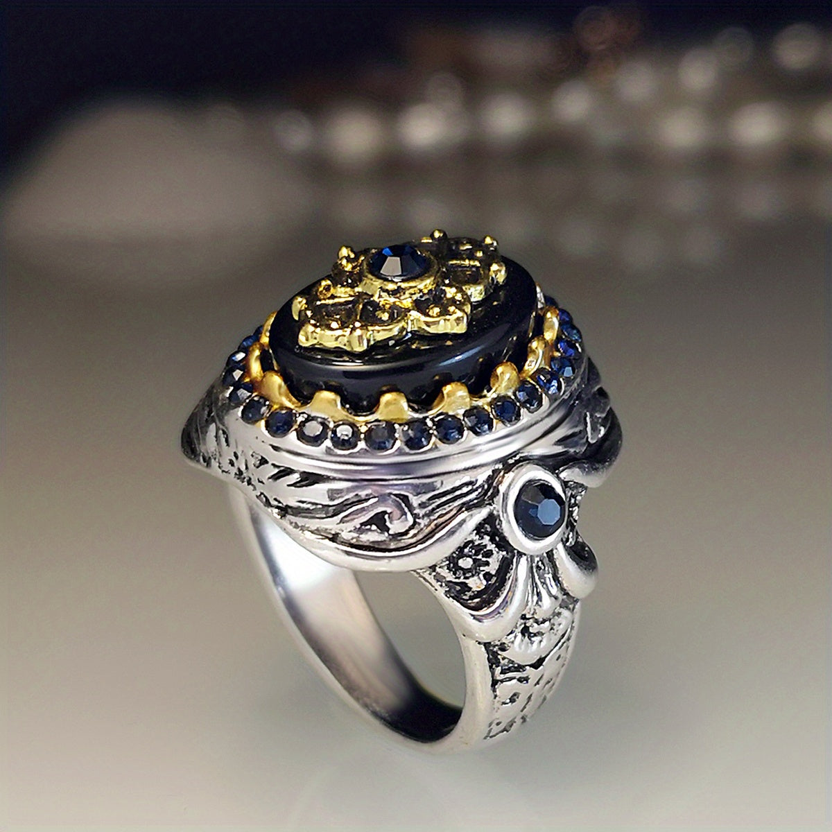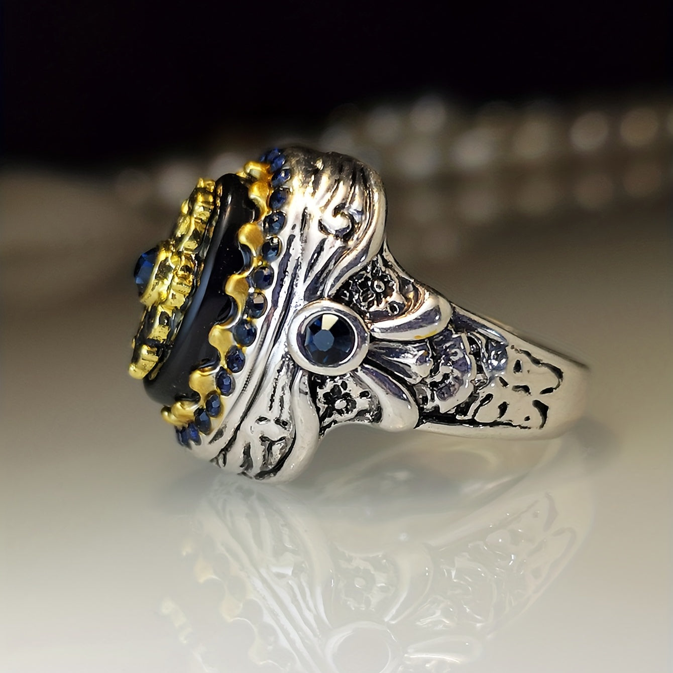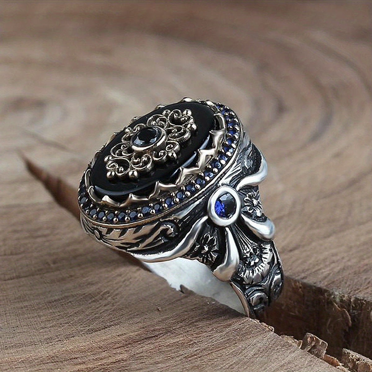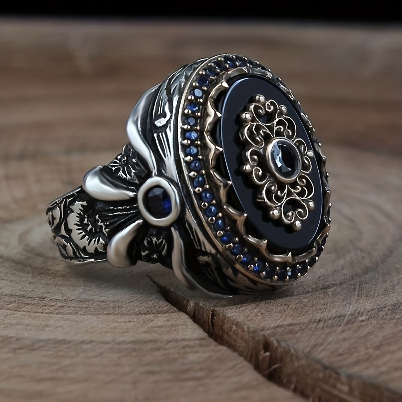 Add a touch of retro style to your look with this unique agate ring featuring intricate carvings, a sparkling rhinestone, and a striking sapphire accent.