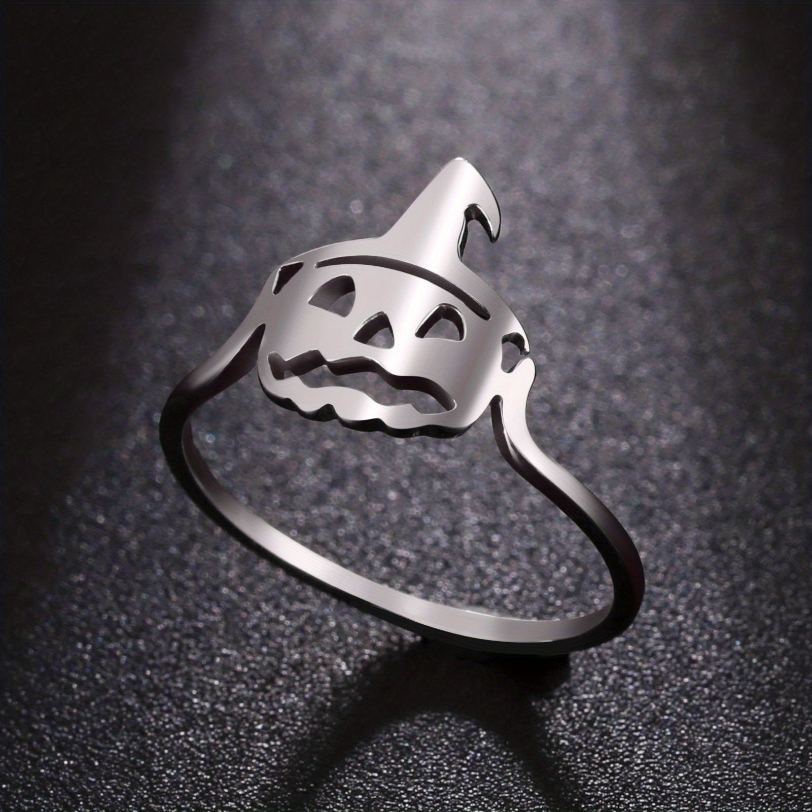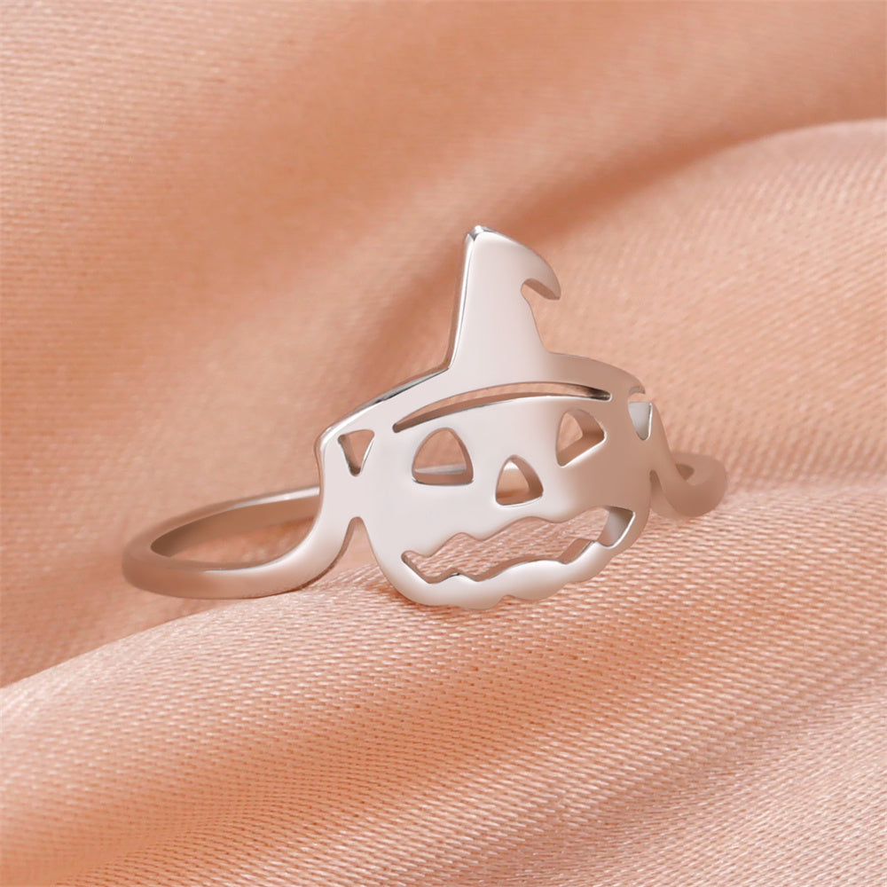 Get into the Halloween spirit with this stylish open ring featuring a ghost witch design. The adjustable finger ring includes fun elements like a pumpkin, hat, moon, and bat.
