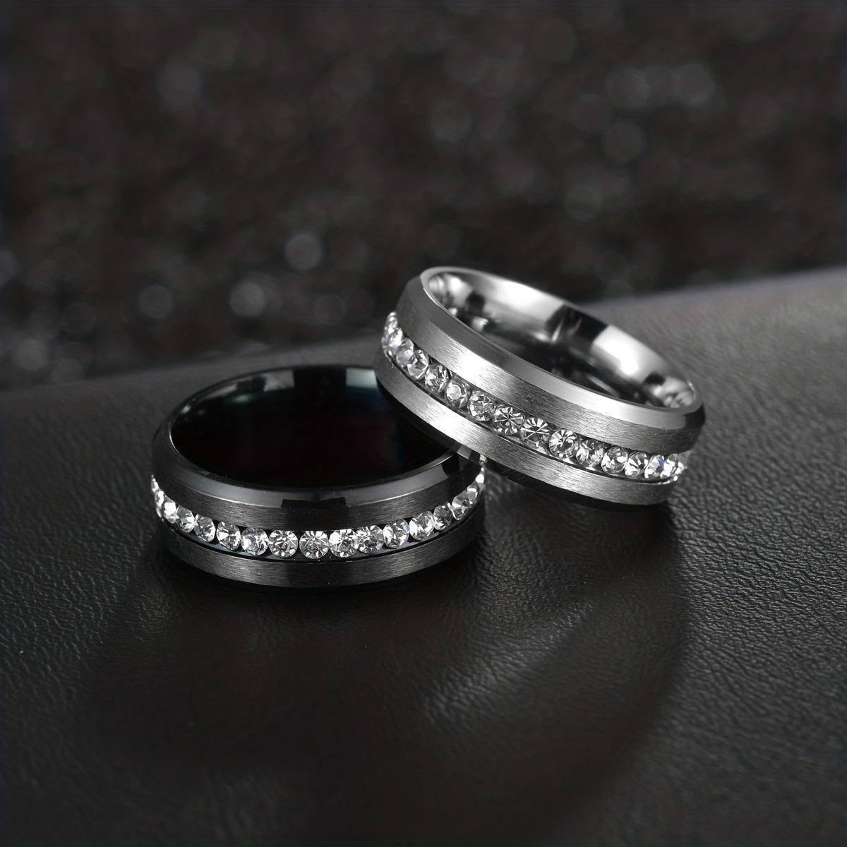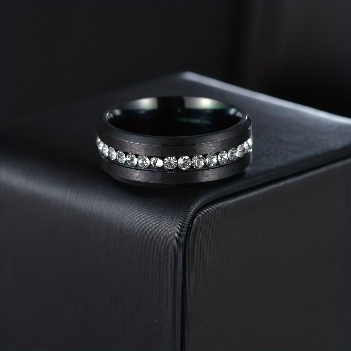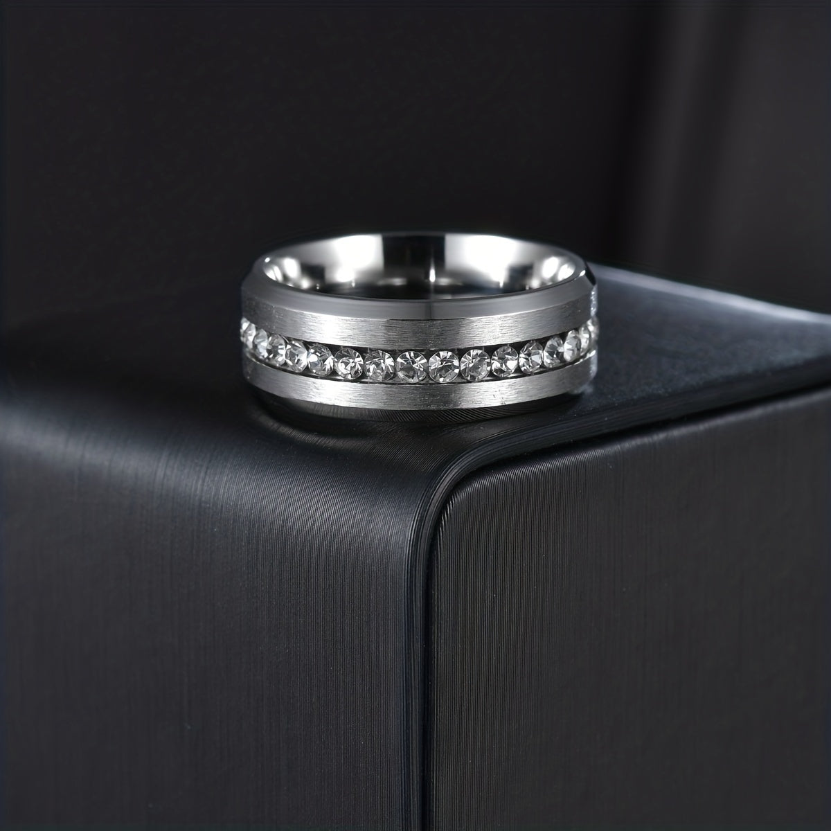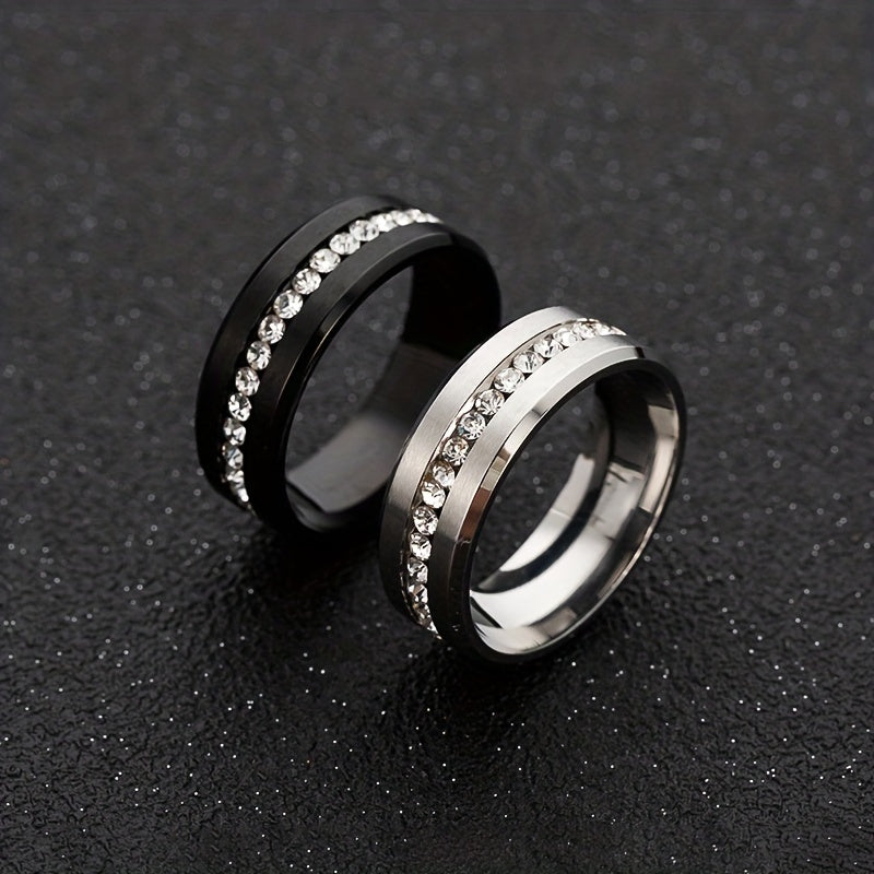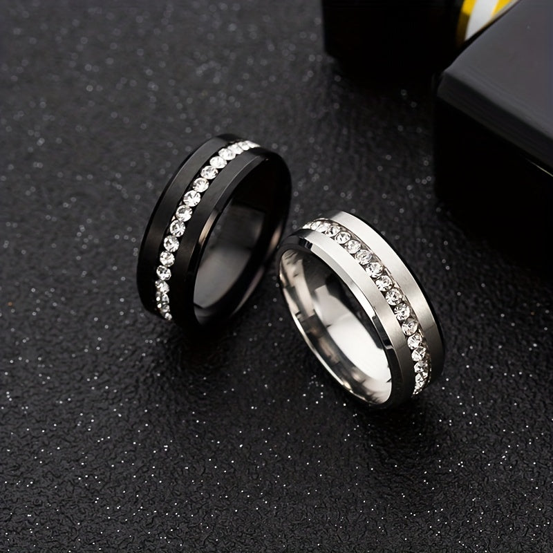 This men's ring features a single row of faux diamonds zircons on an 8MM wide band. Electroplated stainless steel for durability and style.