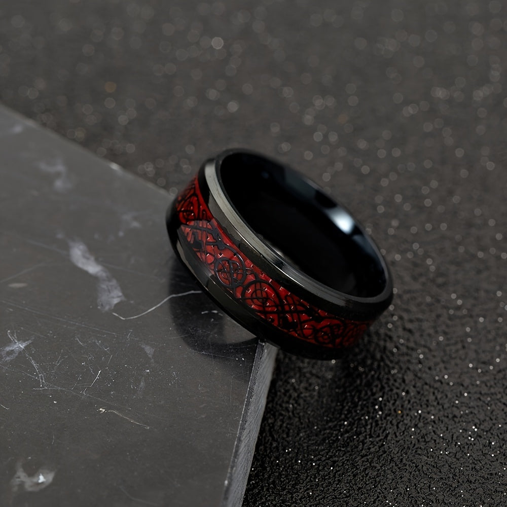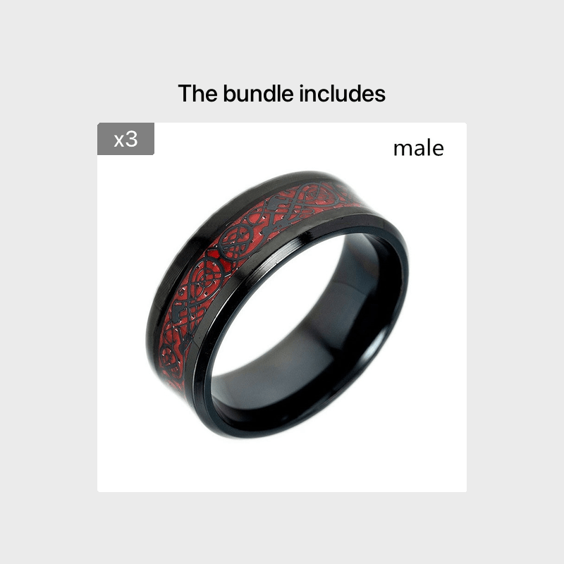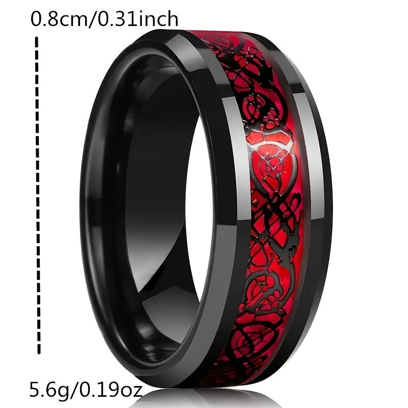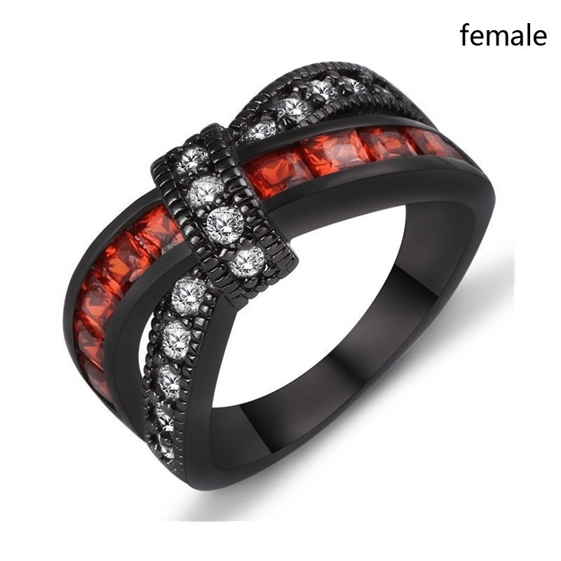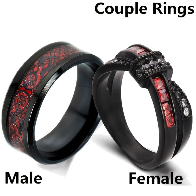 This couple ring set includes a men's stainless steel carbon fiber ring and a women's ruby garnet engagement ring. Perfect for matching and symbolizing your love.