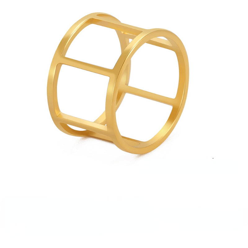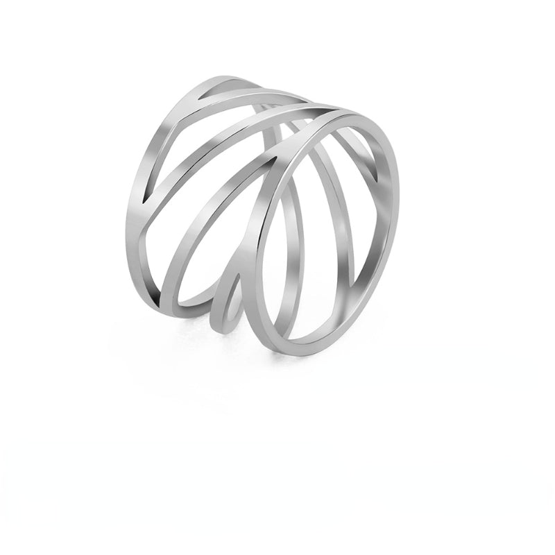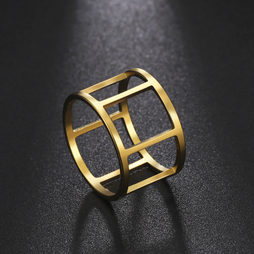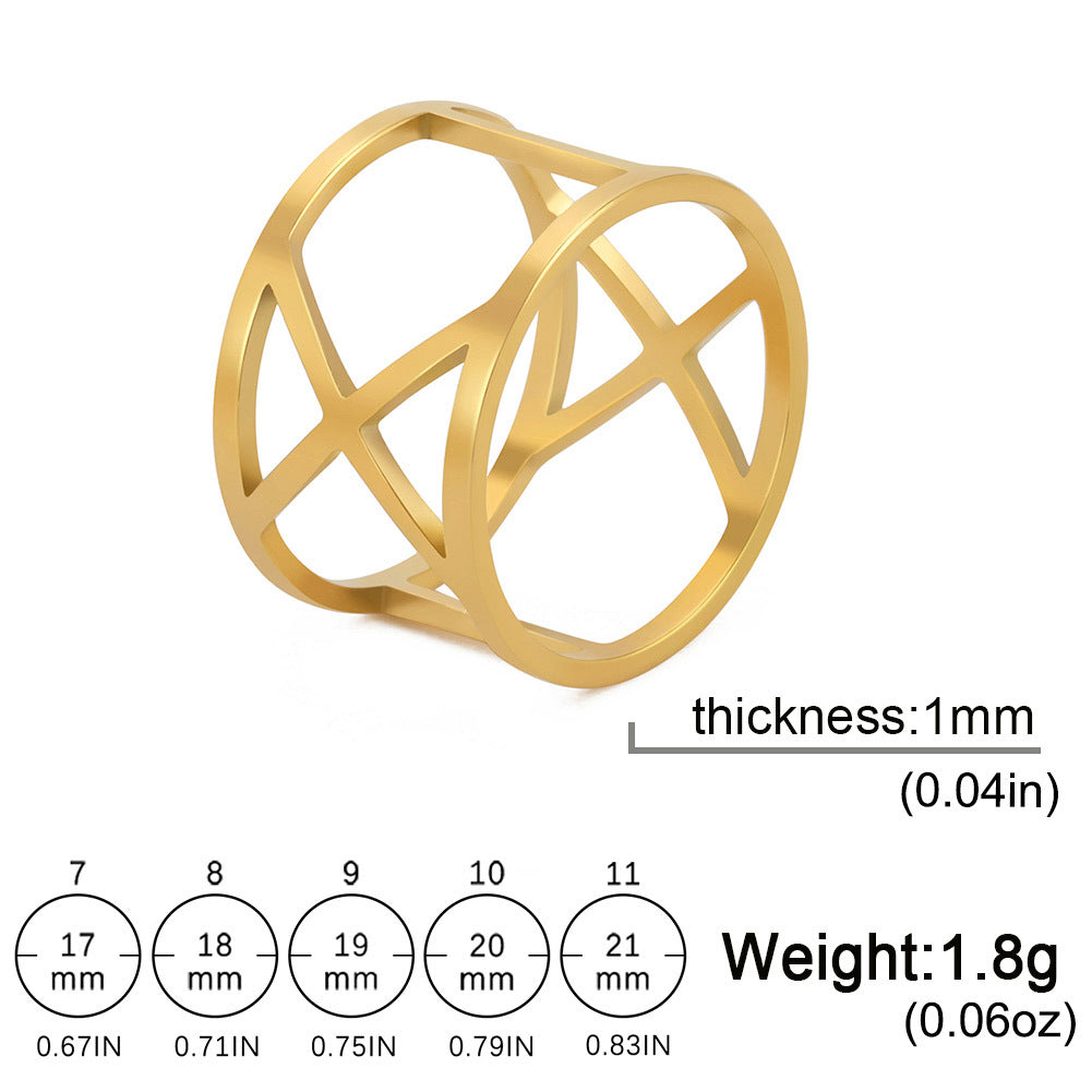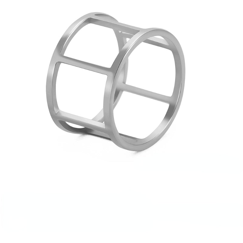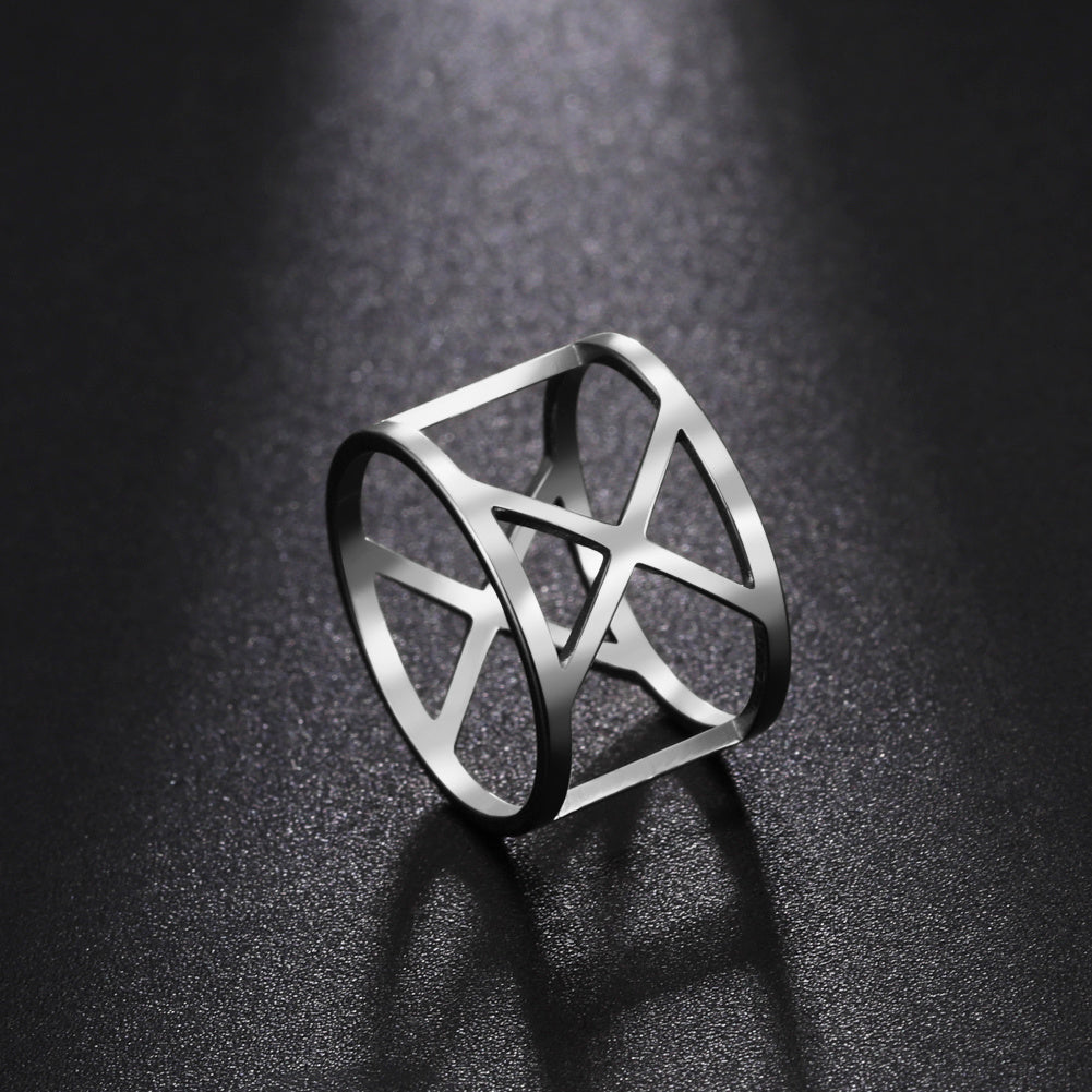 This geometric hollowed ring features a wide cut out cross design, made of silver stainless steel, perfect for men's finger.