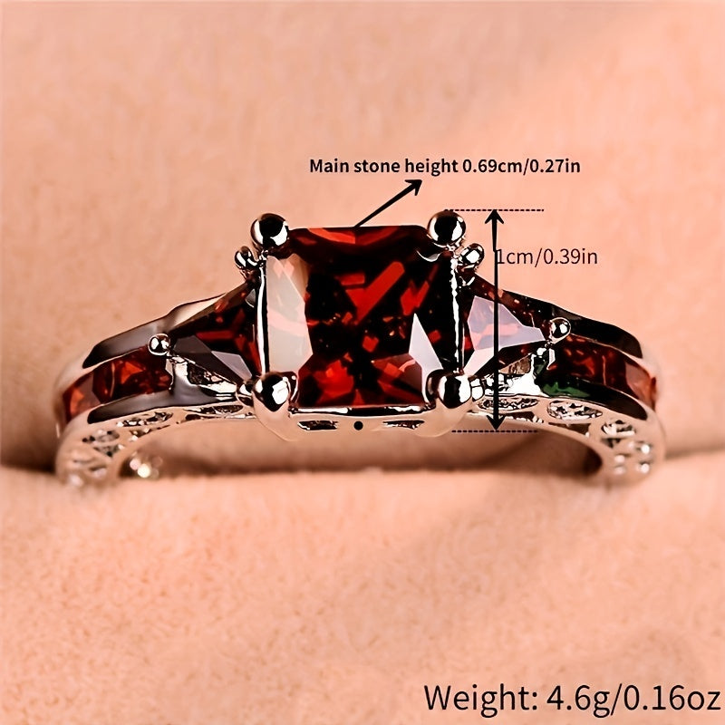 This classic men's ring features a stunning princess square cut red garnet, perfect for engagement or wedding. The zircon accents add a touch of elegance.