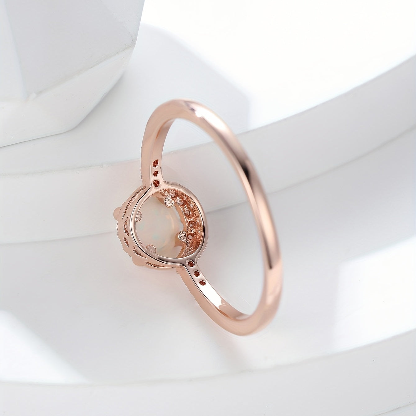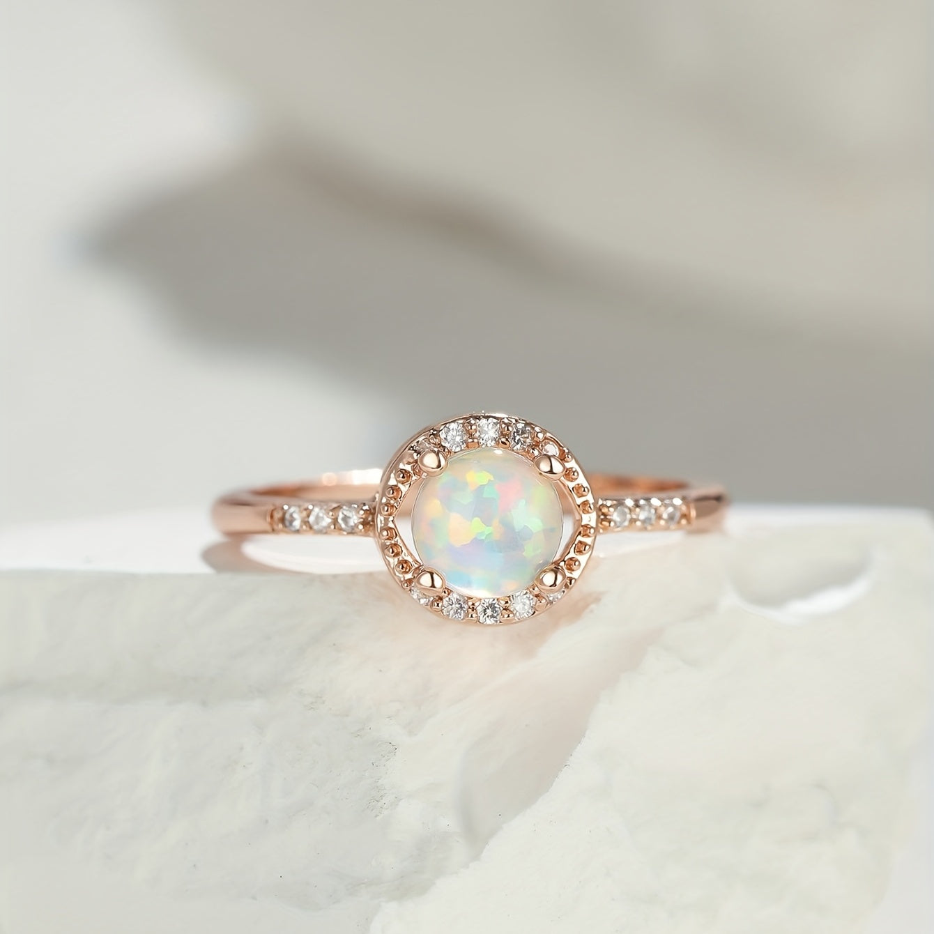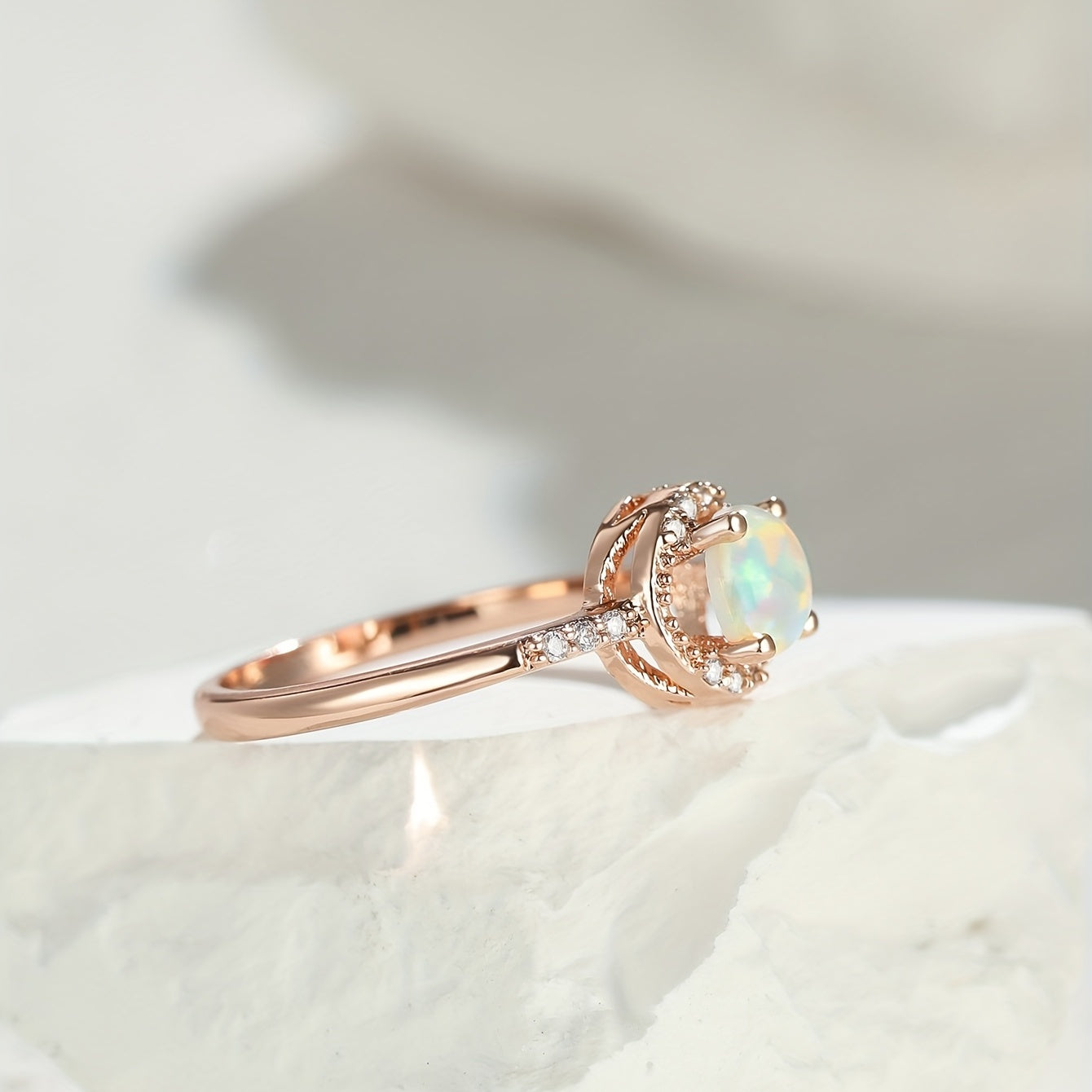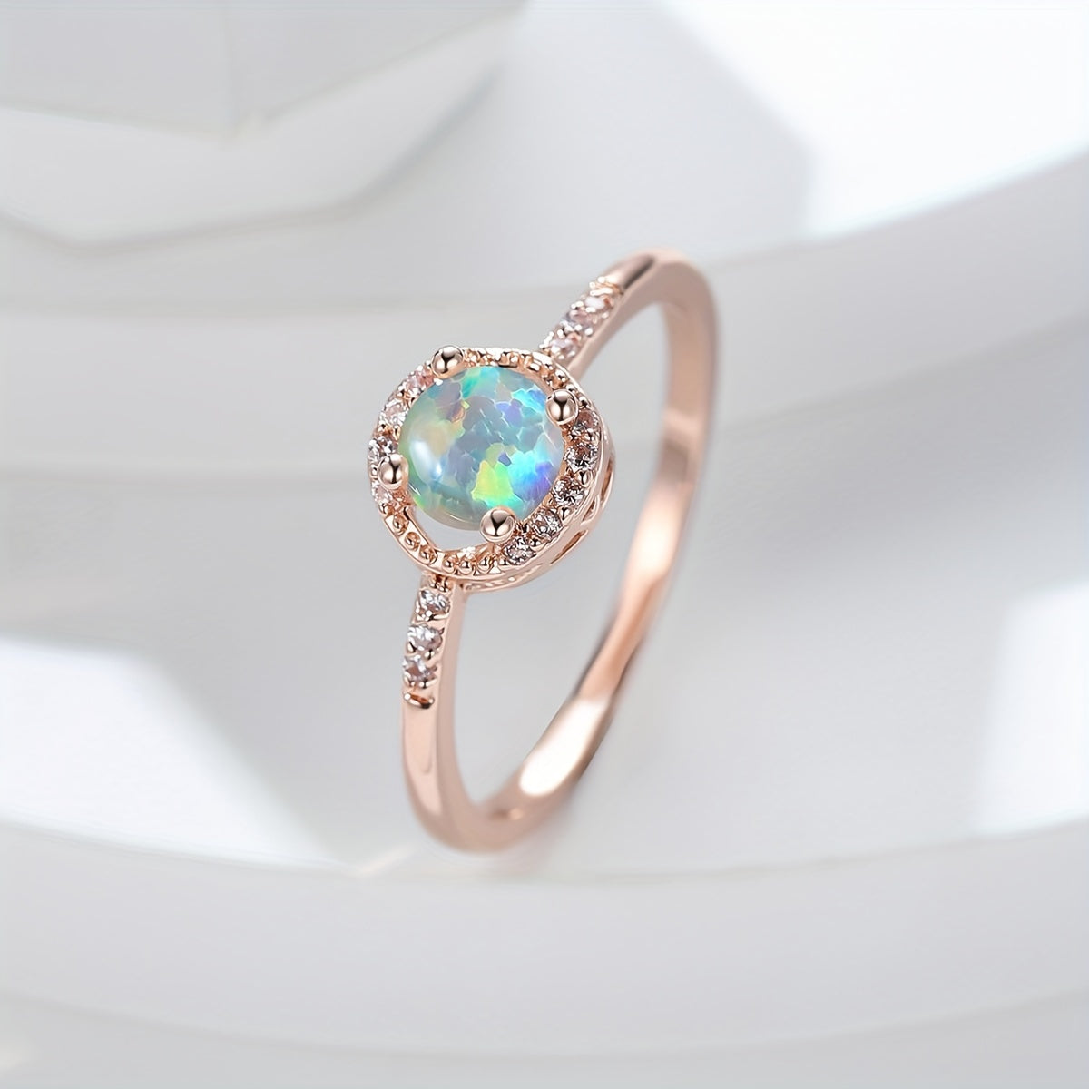 Enhance your style with this inlaid round cut opal finger ring. It features 18K plated copper, perfect for adding elegance to your hand jewelry collection.