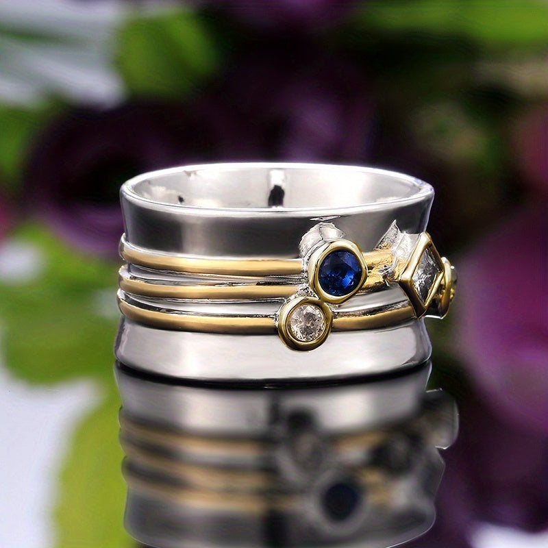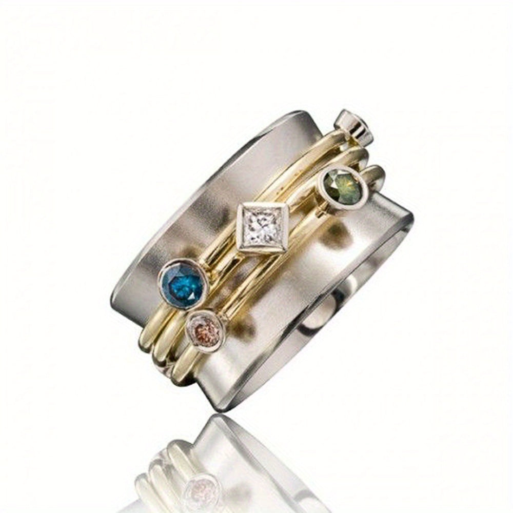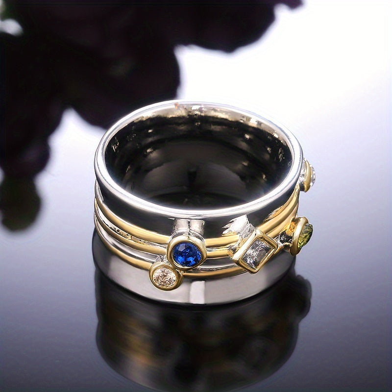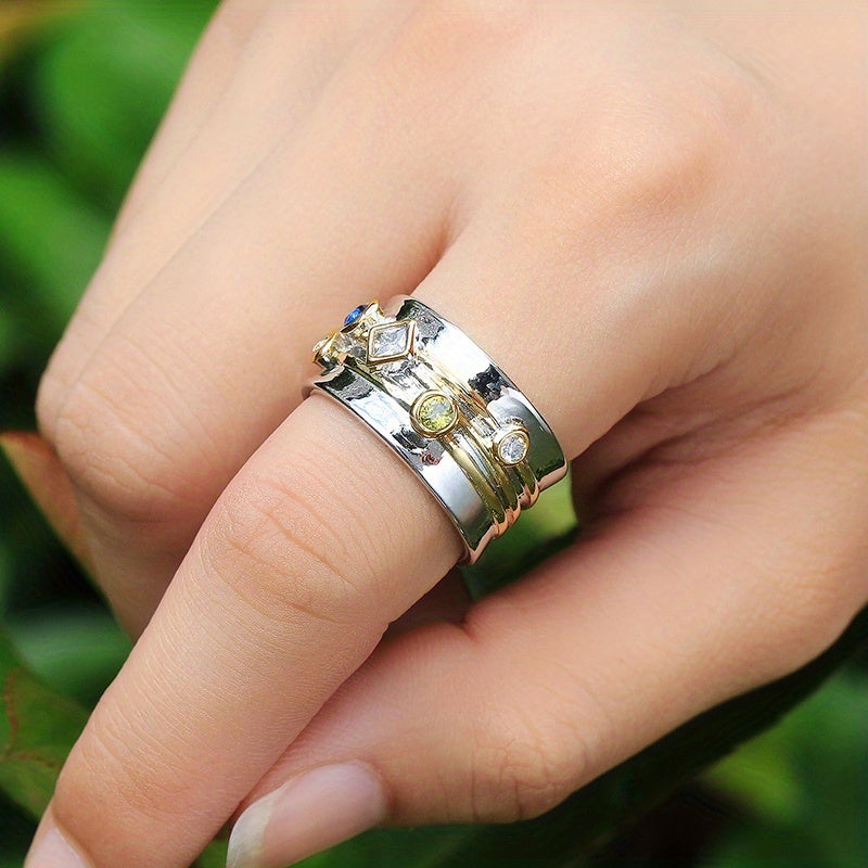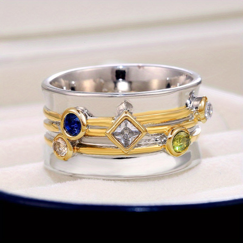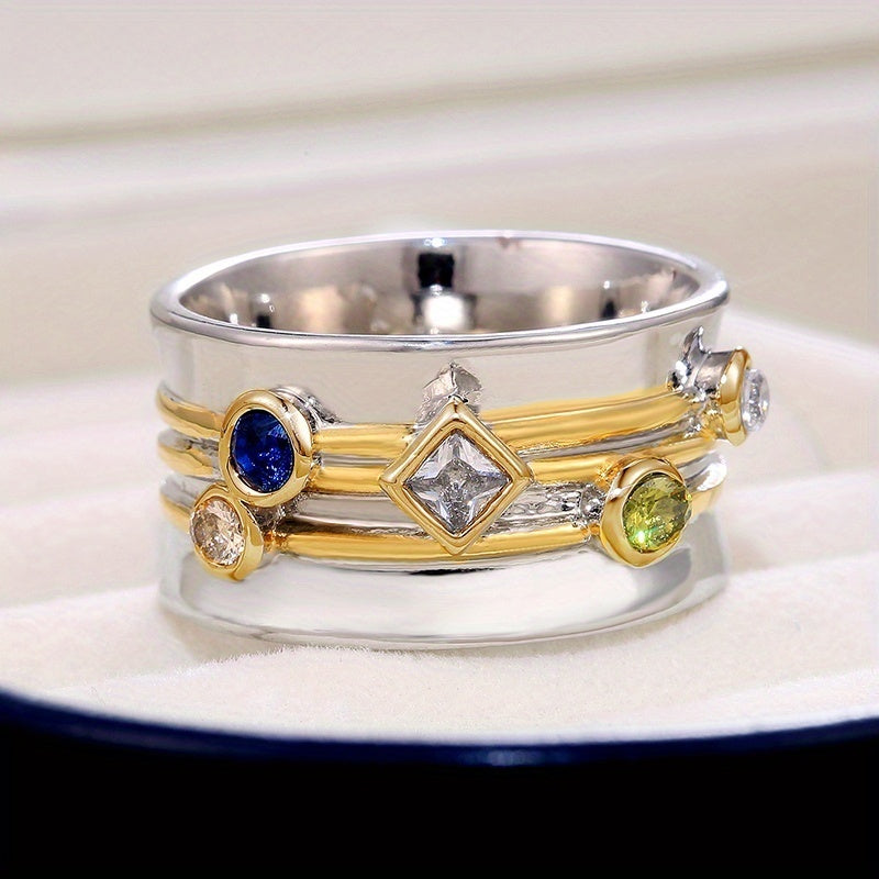 This stunning wide band ring is silver plated with zircon stones, perfect for an engagement, bridal, wedding, or anniversary gift.
