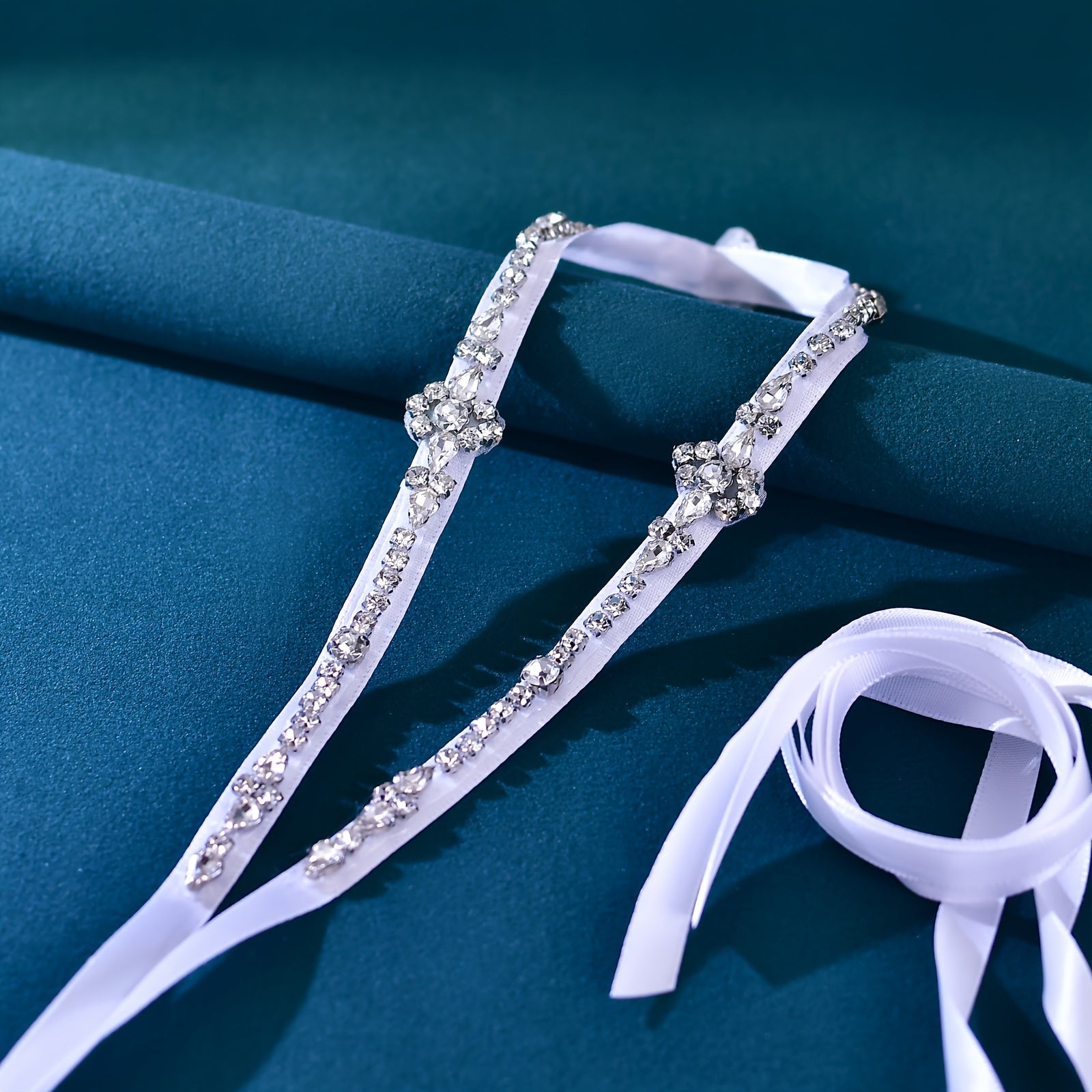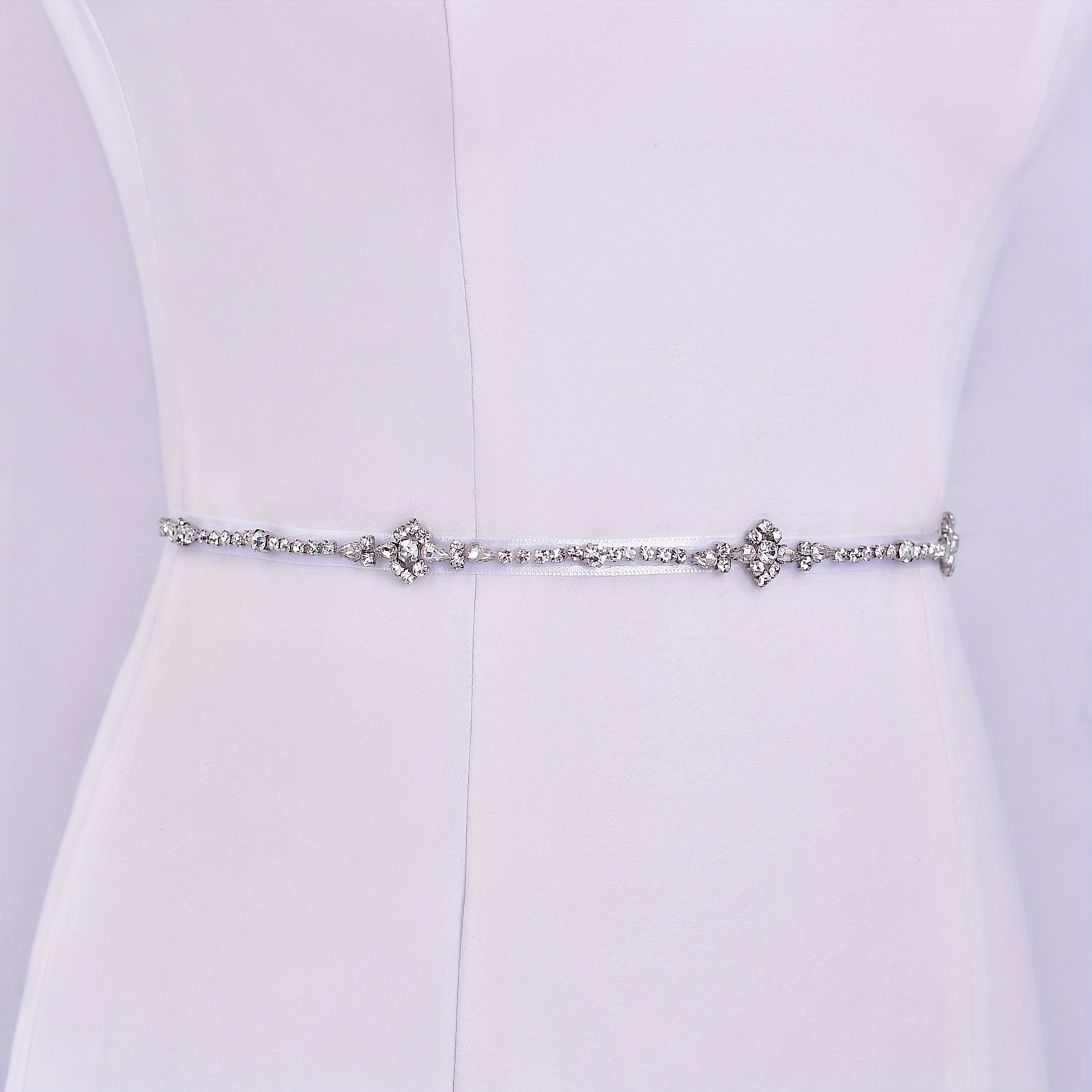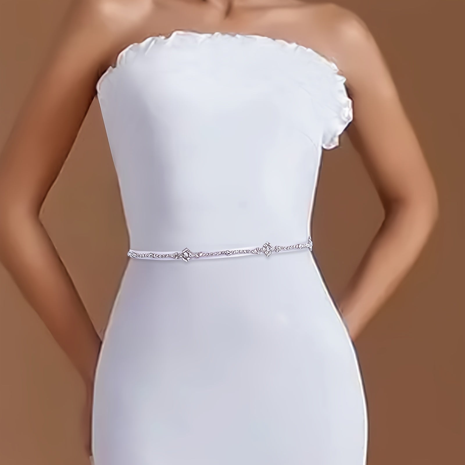 Erhöhen Sie Ihren Look mit diesem Hochzeitskleid im böhmischen Hochzeitsfeier mit einem mit Strasssteinen geschmückten Taillengürtel. Dieses Kleid ist für große Größen ausgelegt und besteht aus nicht-textilen Materialien ohne Federn und umfasst eine Taillenkette.