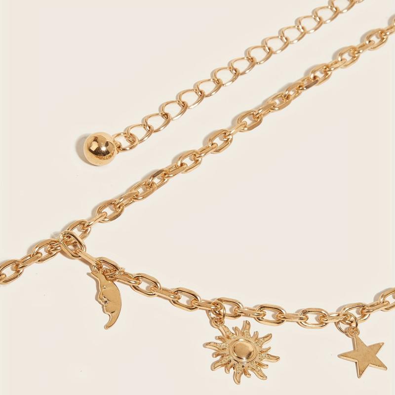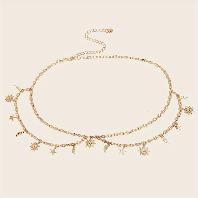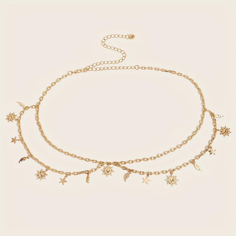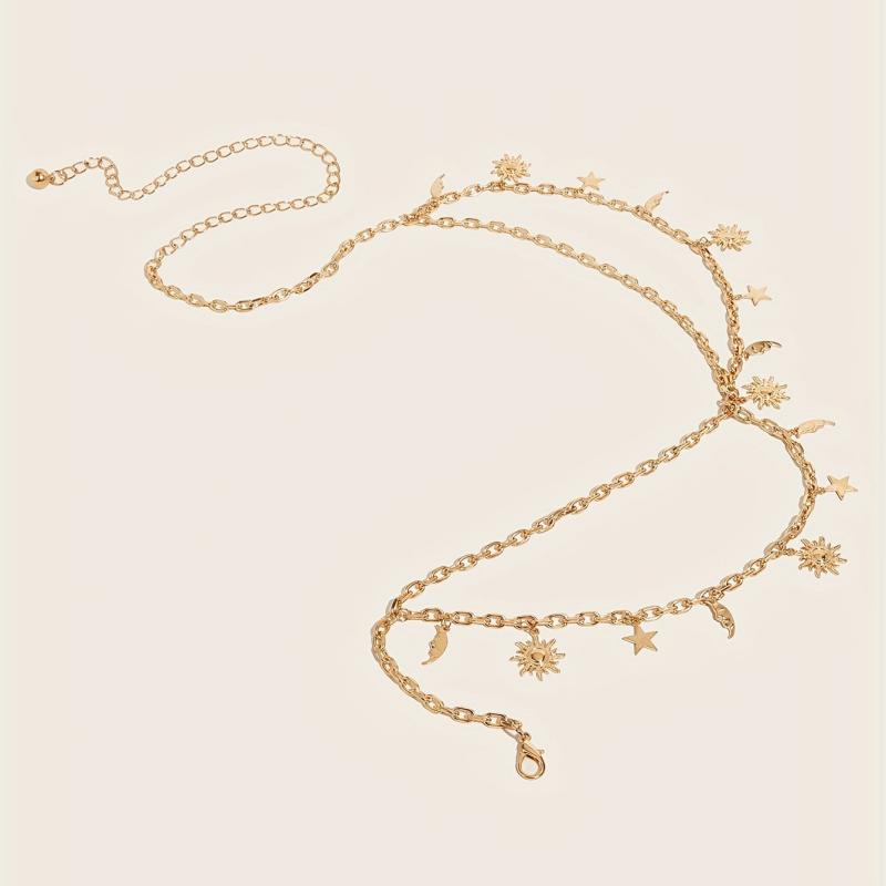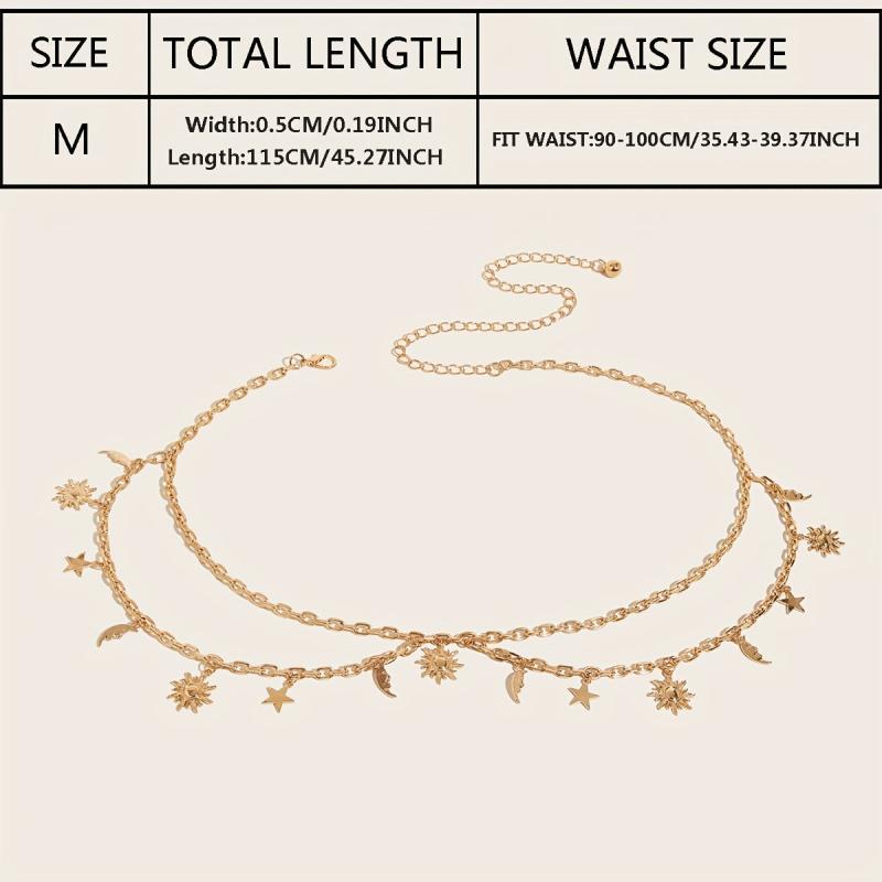 Fügen Sie Ihrem Strand -Look einen Hauch von Glamour mit dieser atemberaubenden Taillenkette hinzu, die mit Sonne, Stern und Mondanhängern verziert ist. Das Doppelschicht -Metallketten -Design verleiht Ihrem Bikini -Outfit eine trendige und schicke Stimmung.