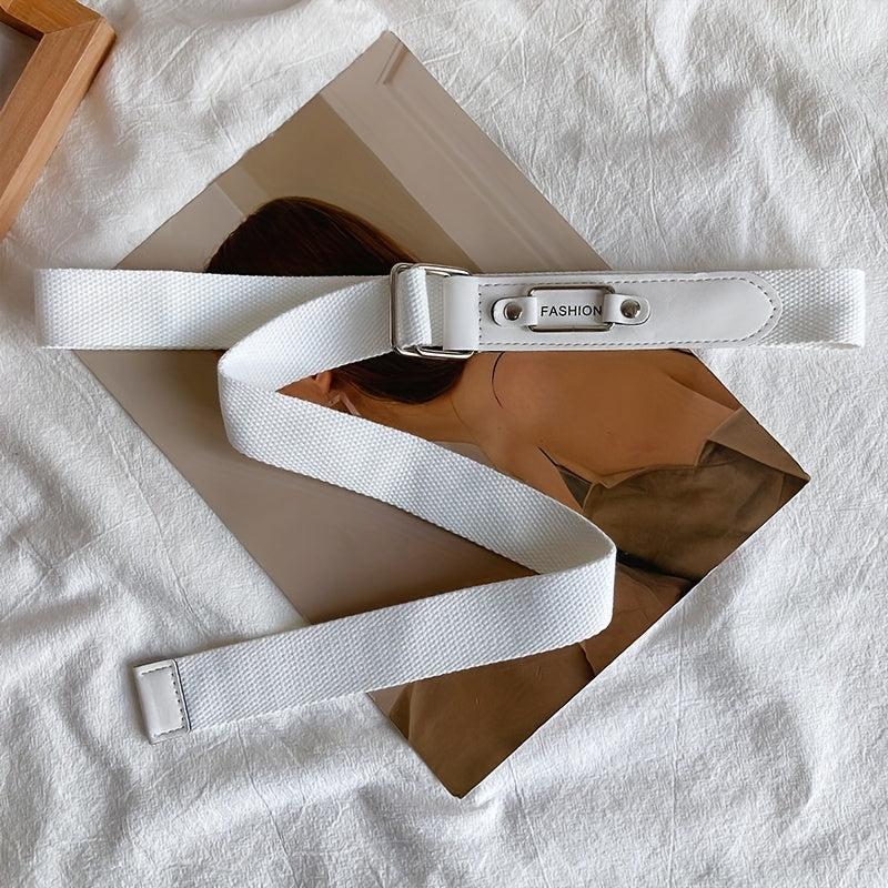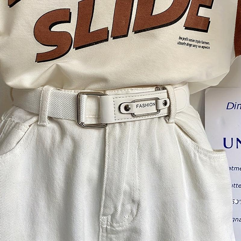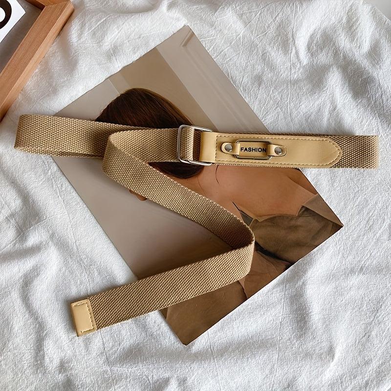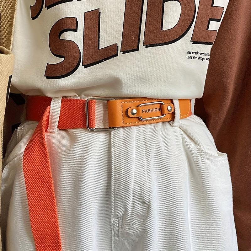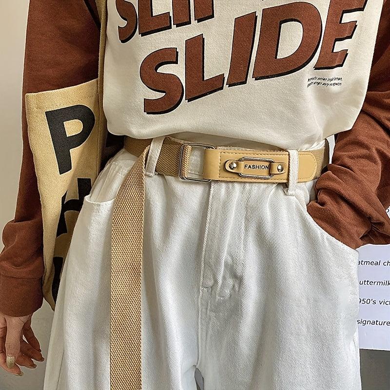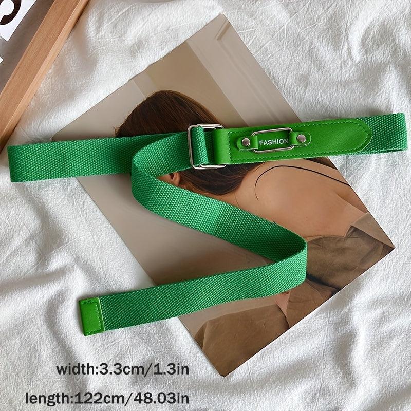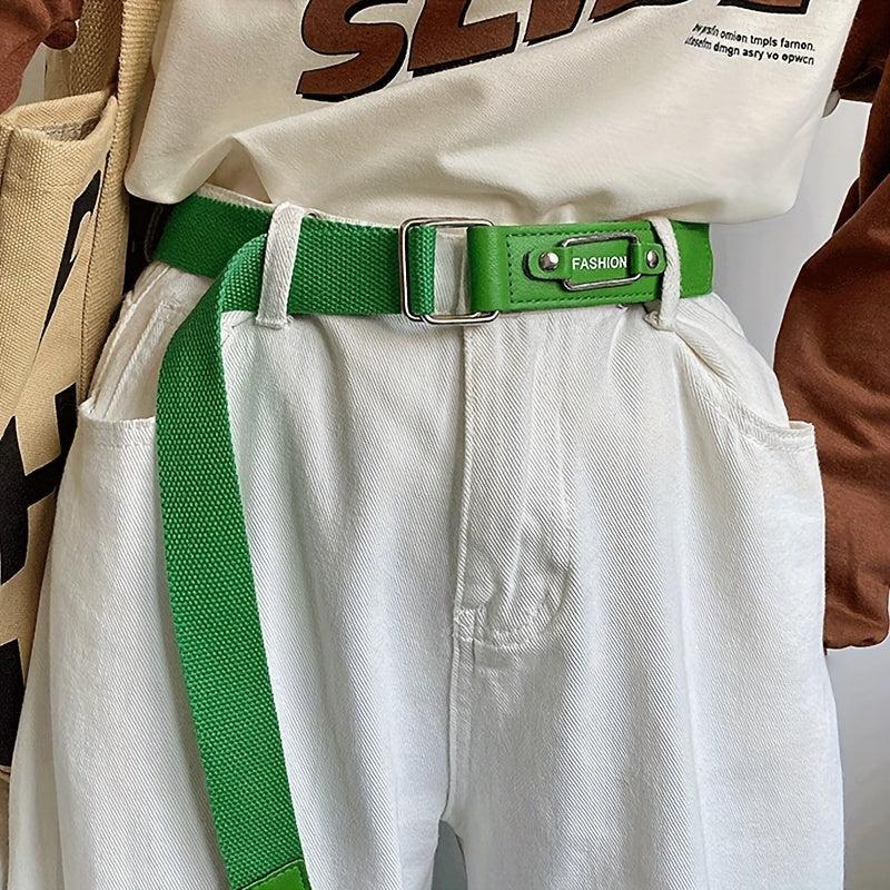 Elevate your everyday outfits with this vibrant green canvas belt featuring a stylish lettered slogan. Perfect for jeans and adding a pop of color to your look.