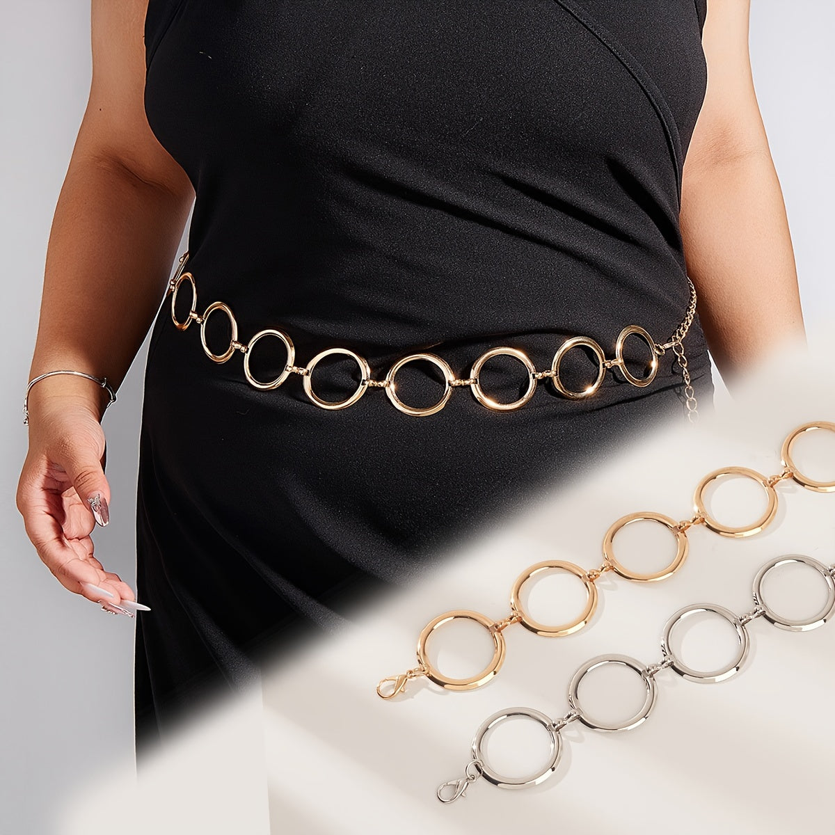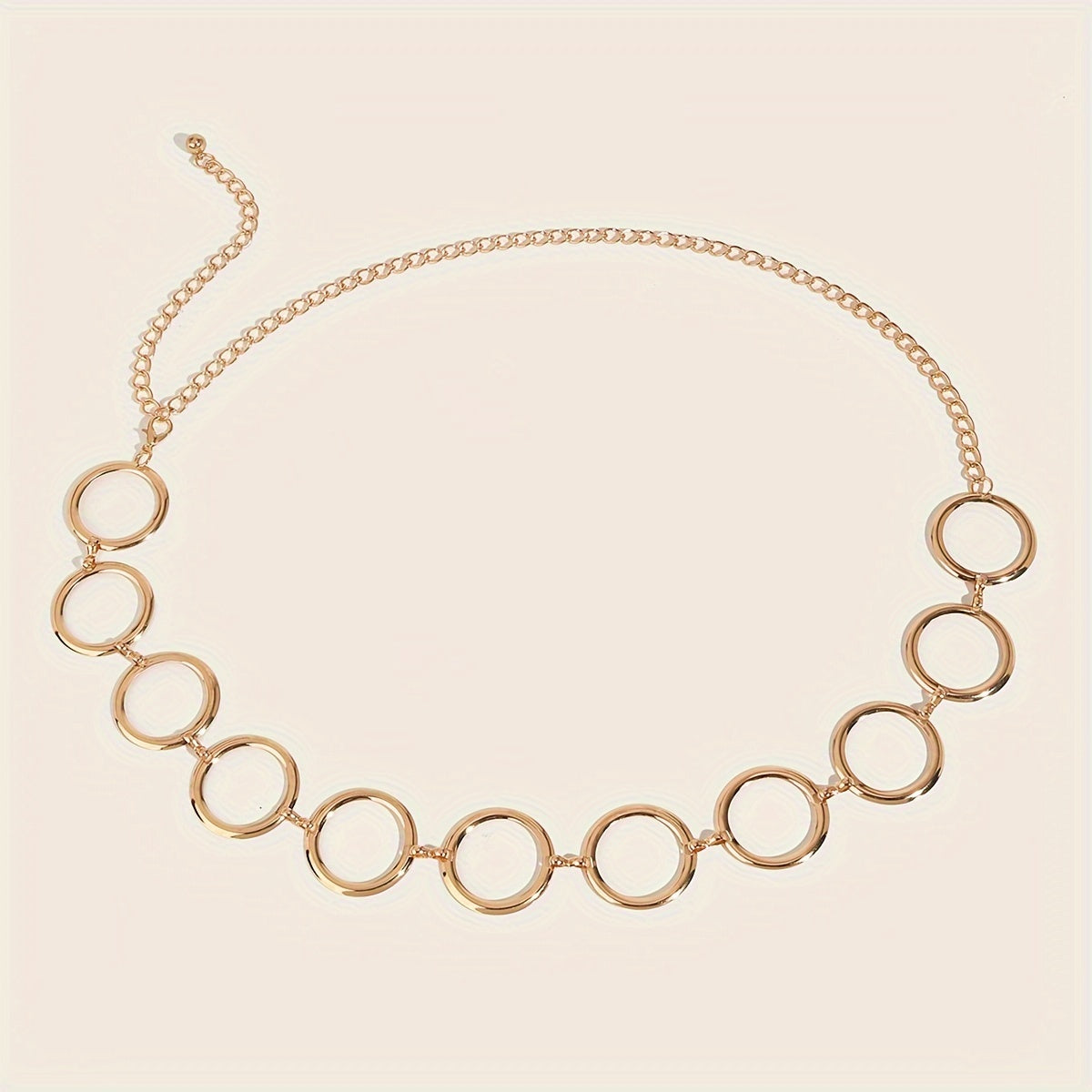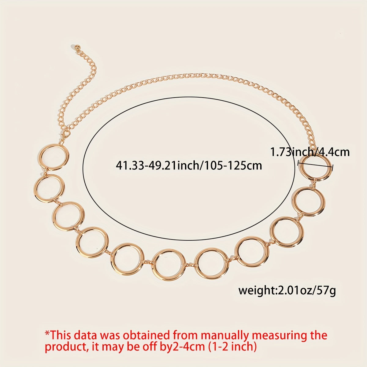 Verbessern Sie Ihr Outfit mit diesem vielseitigen goldenen Kettengürtel mit Hohlkreis -Design. Perfekt für Freizeitausflüge, Hochzeiten, Partys und mehr.