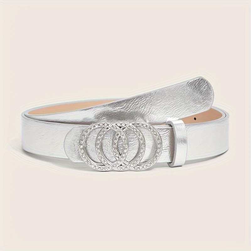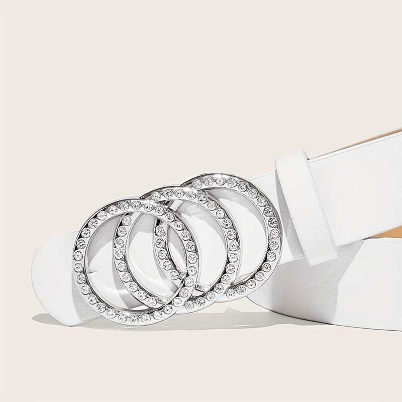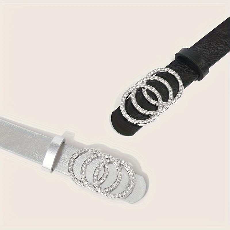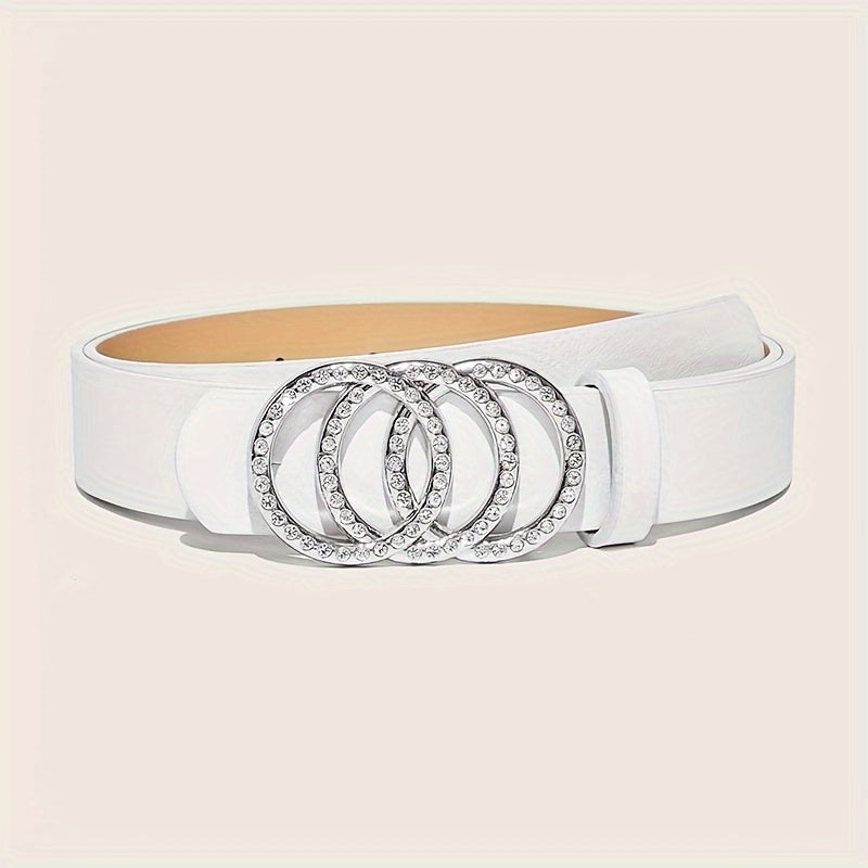 Gürtel mit dreifacher Ringschnalle und Strasssteinen, klassischer, einfarbiger PU-Bund für Damen