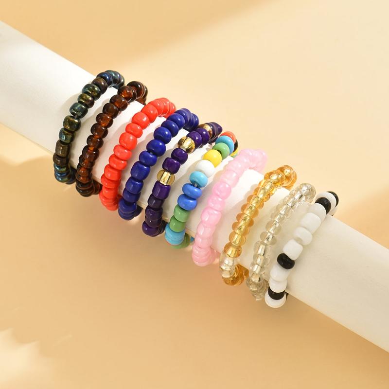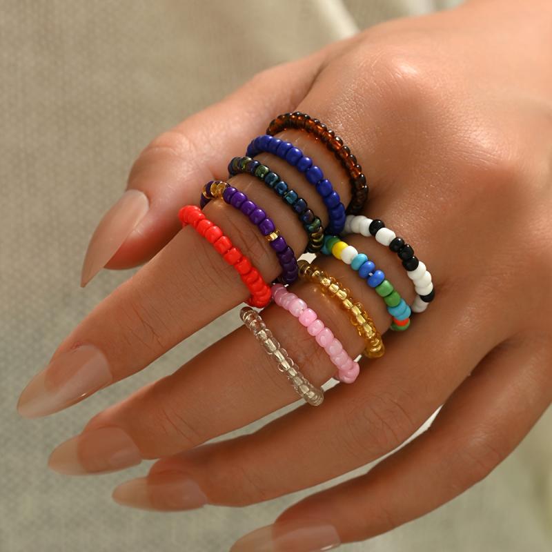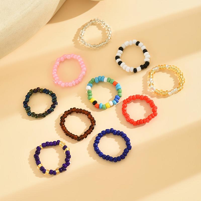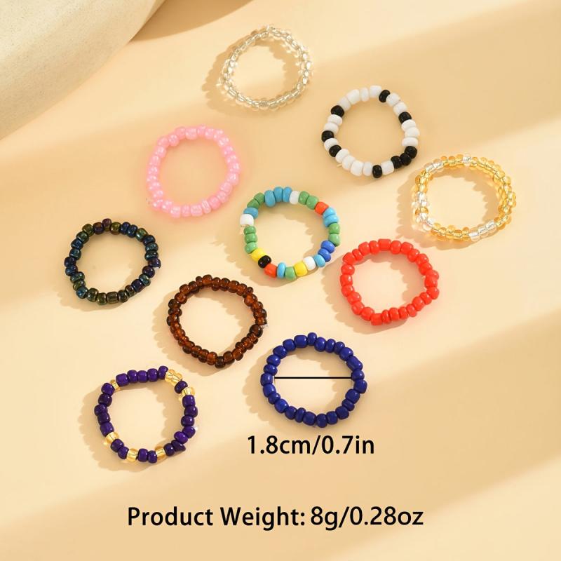Elevate your summer look with this 10-piece set of bohemian style colorful beaded stretch rings. Featuring glass seed beads and elastic rope, these rings are perfect for summer beach vacations and casual attire.