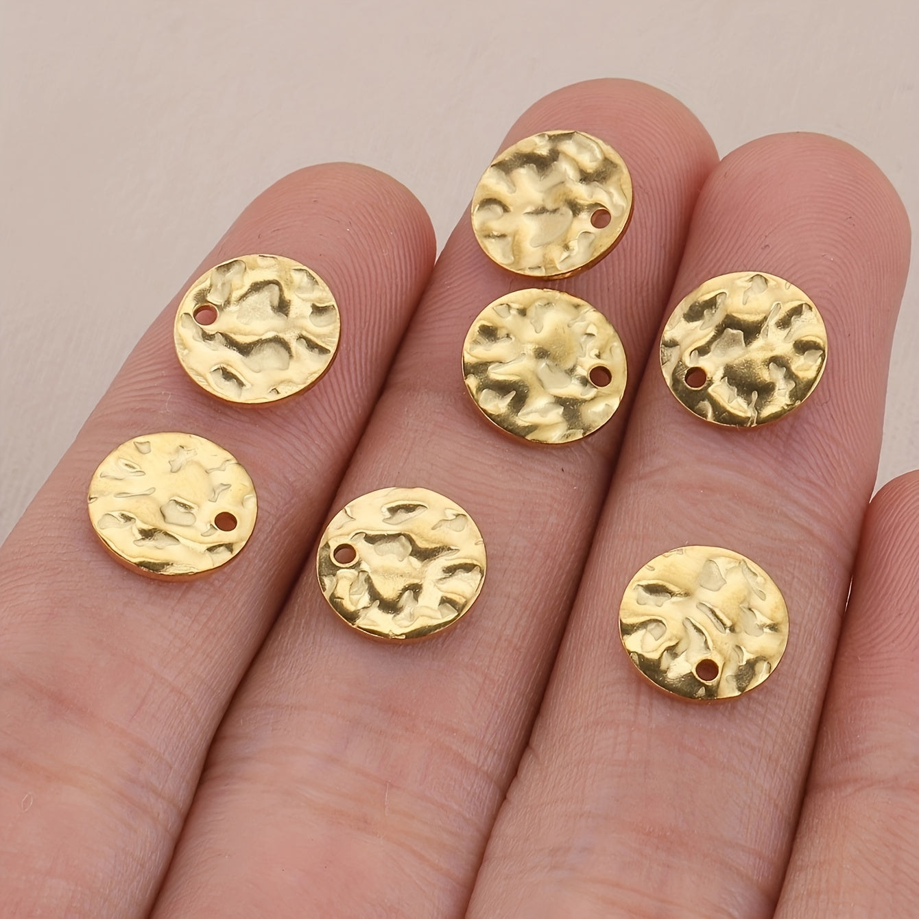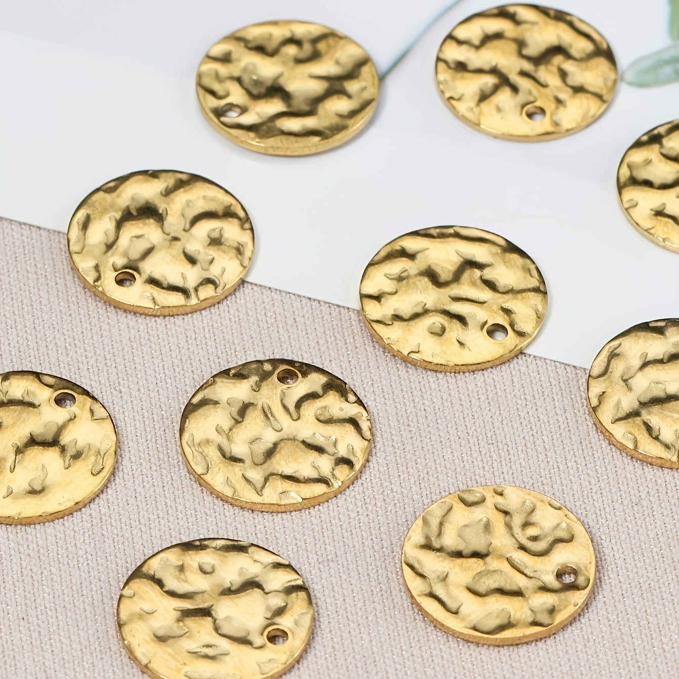 Create stunning DIY earrings with these golden stainless steel round hammered charms. The perfect jewelry components for crafting unique pieces.