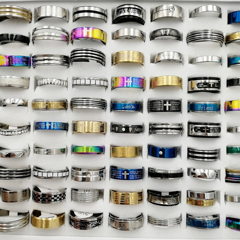 This set includes 10 stainless steel rings in assorted styles, perfect for men. Ideal for wedding bands or everyday wear. Sizes range from 7 to 11.