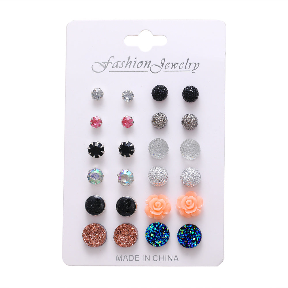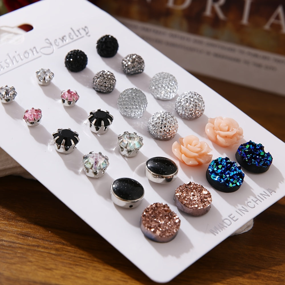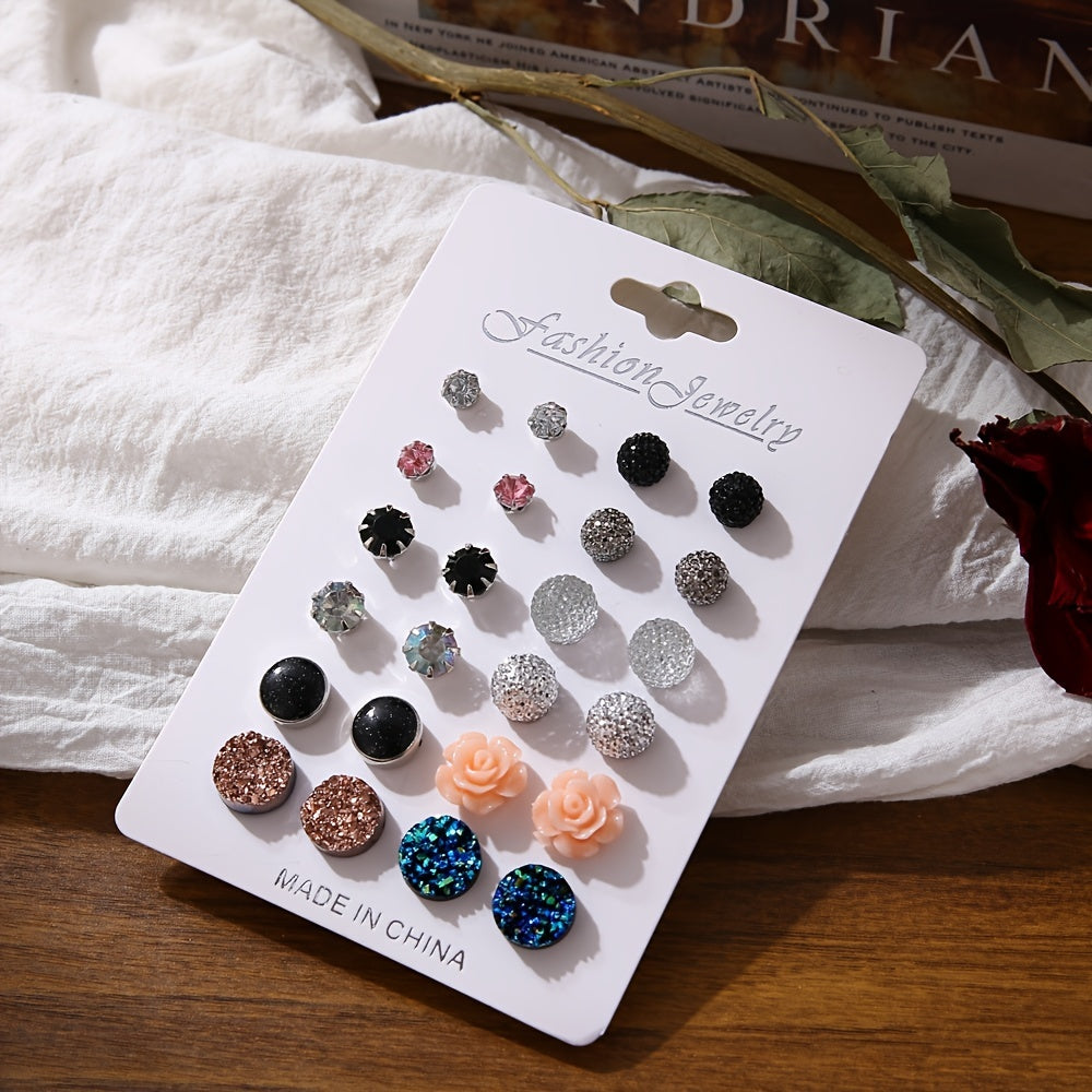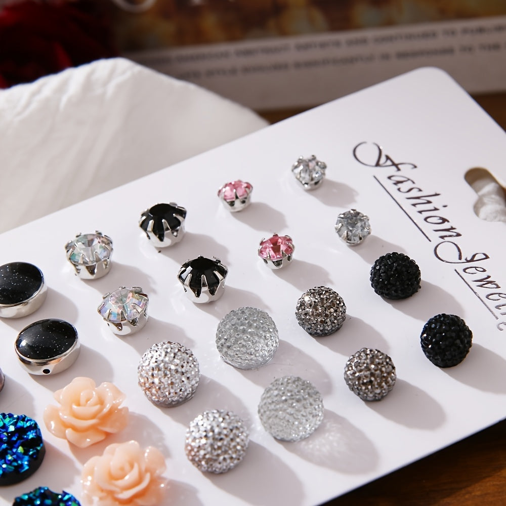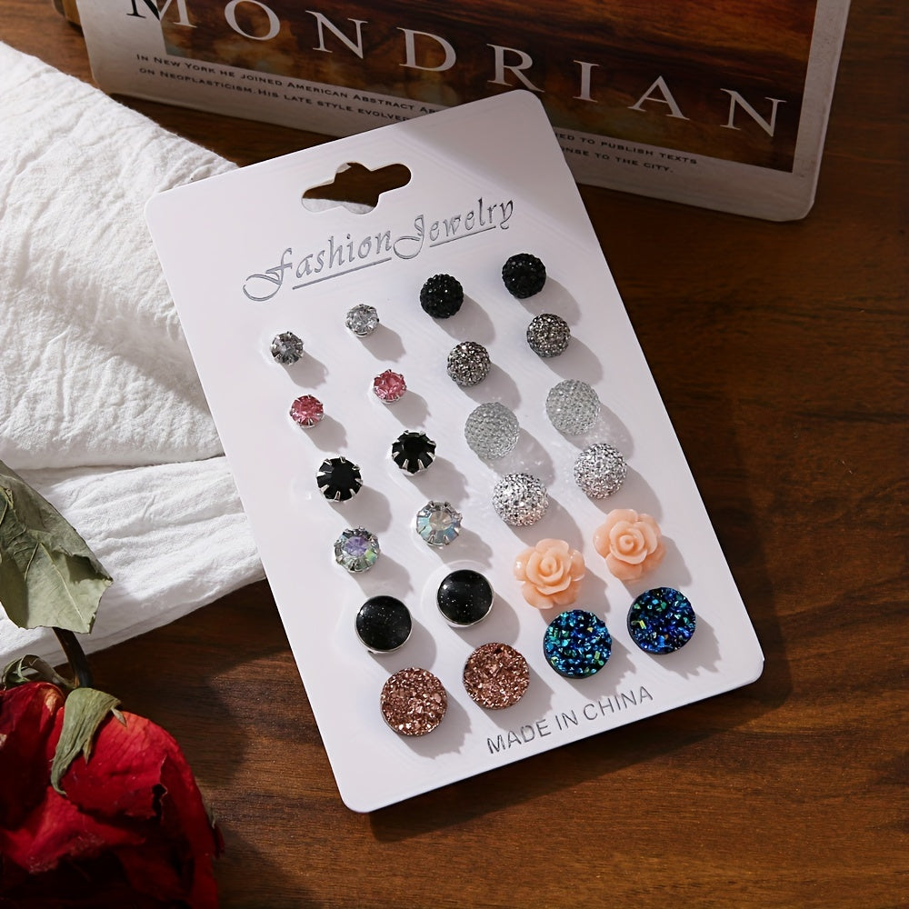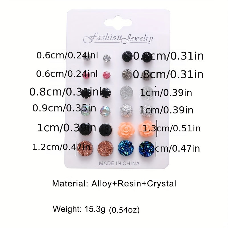 This set includes 12 pairs of stud earrings featuring colorful crystal balls and rose flowers. Perfect for adding a touch of elegance to your outfits.