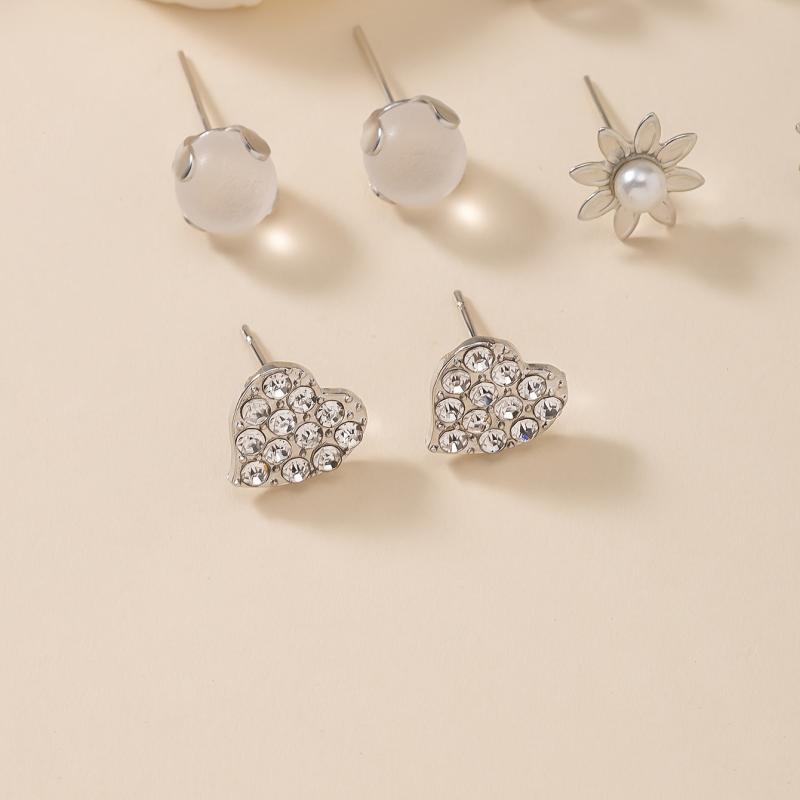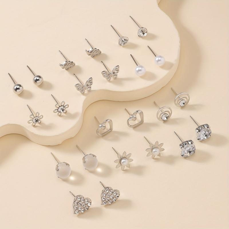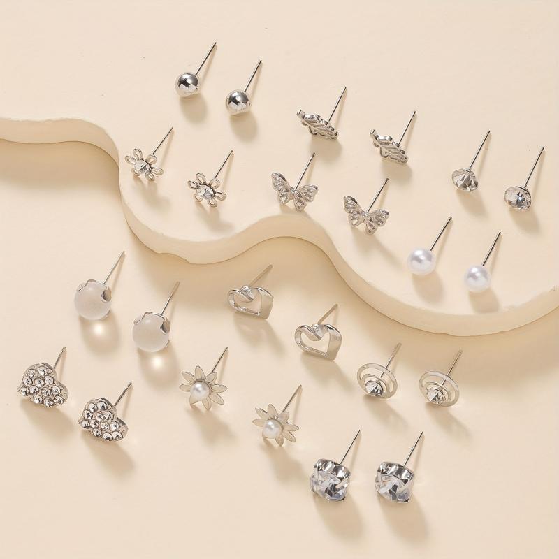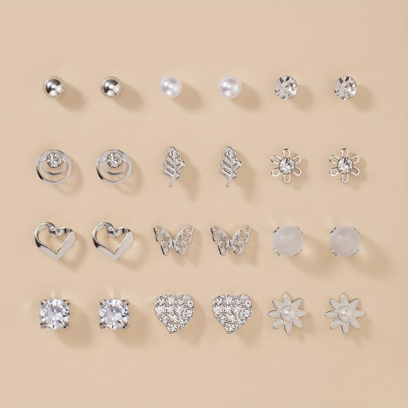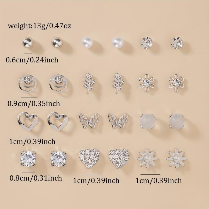 Add a touch of elegance to your outfit with this set of 12 metal dangle earrings featuring rhinestones, pearls, hearts, and butterflies. Perfect for all occasions.