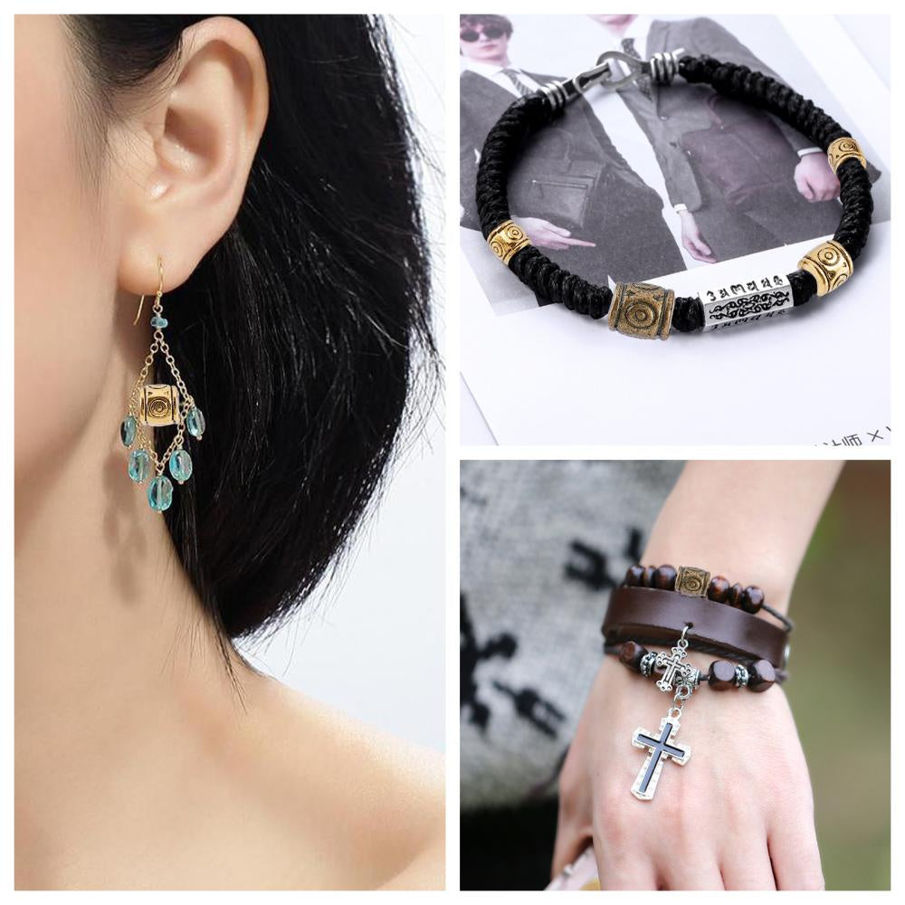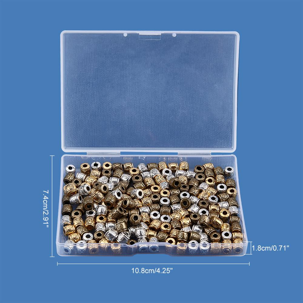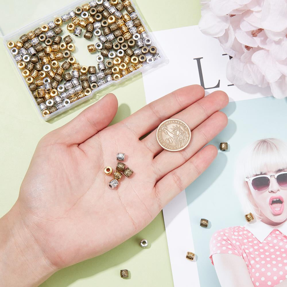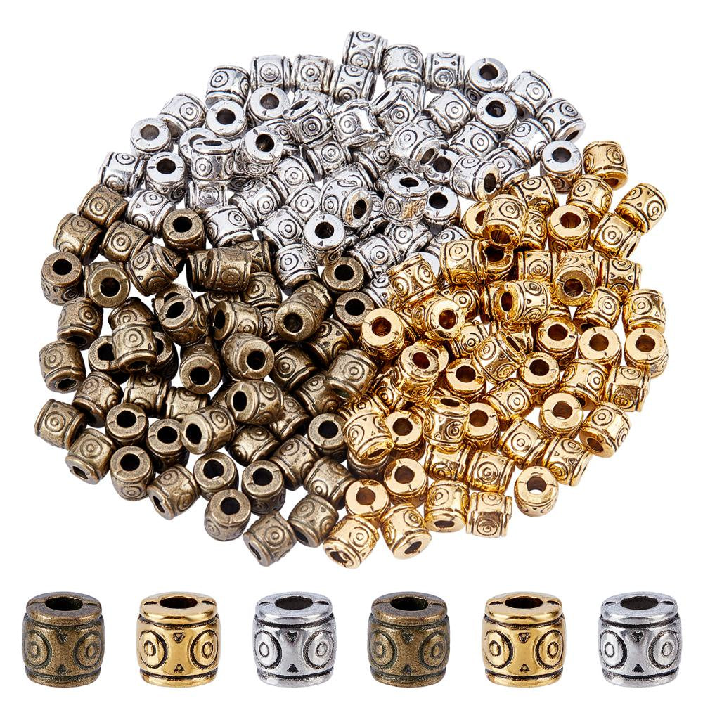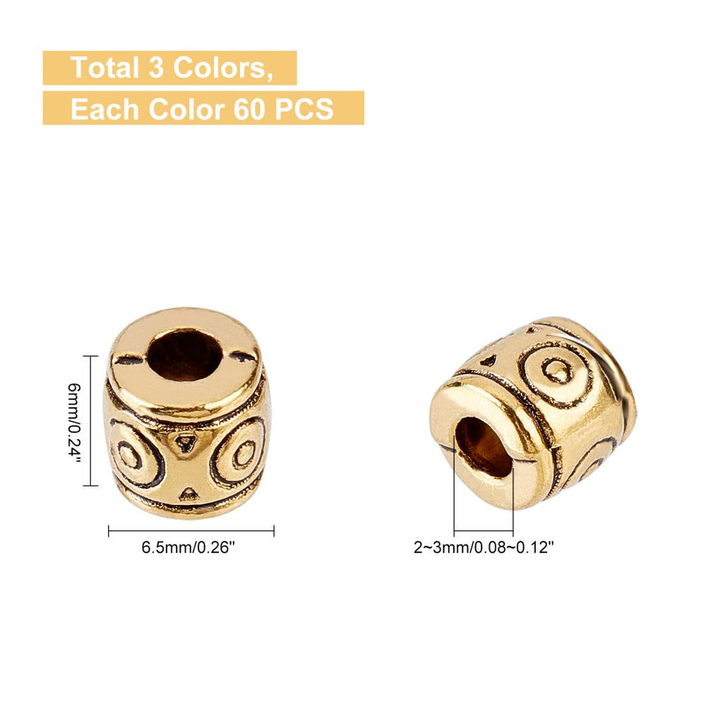 Get this set of 180 mixed patterned column alloy spacer beads for your DIY jewelry projects. These beads are cadmium, nickel, and lead-free, with a size of 6x6.5mm and a hole size of 2-3mm. They come in 3 colors with 60pcs each.