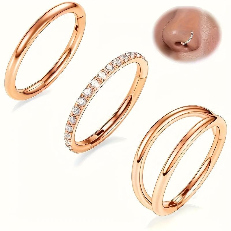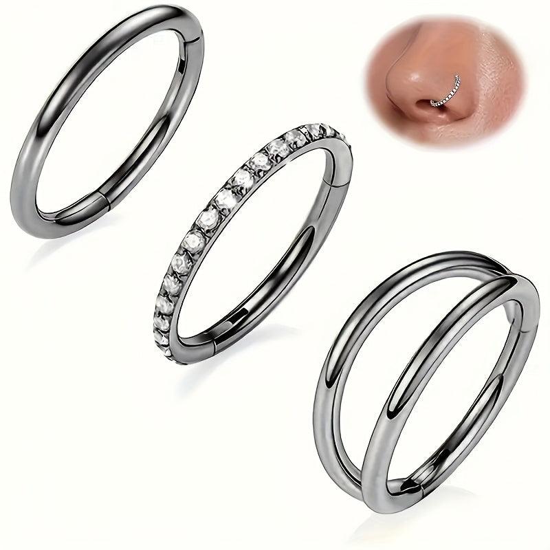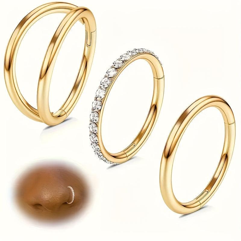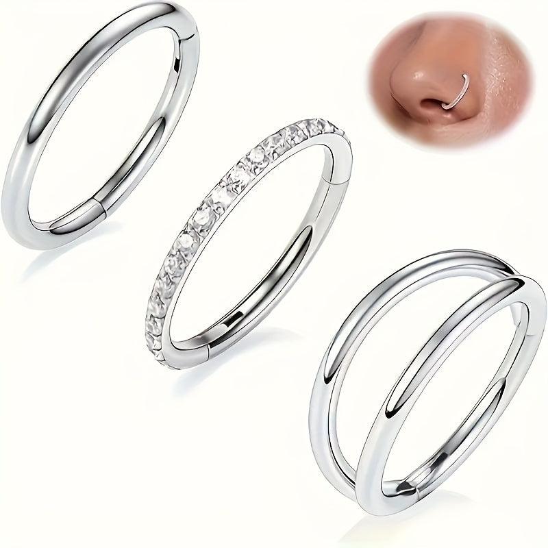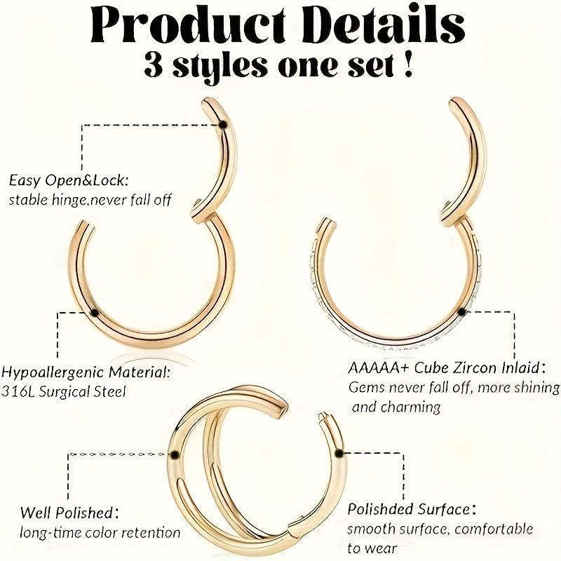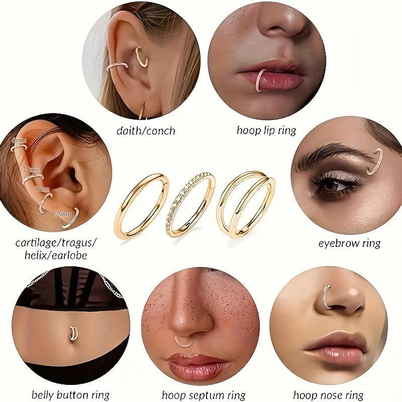 This pack includes 3 nose rings featuring double hoops, conch ear screws, and spiral piercing jewelry. Made of surgery steel, they are perfect for cartilage and conch piercings.