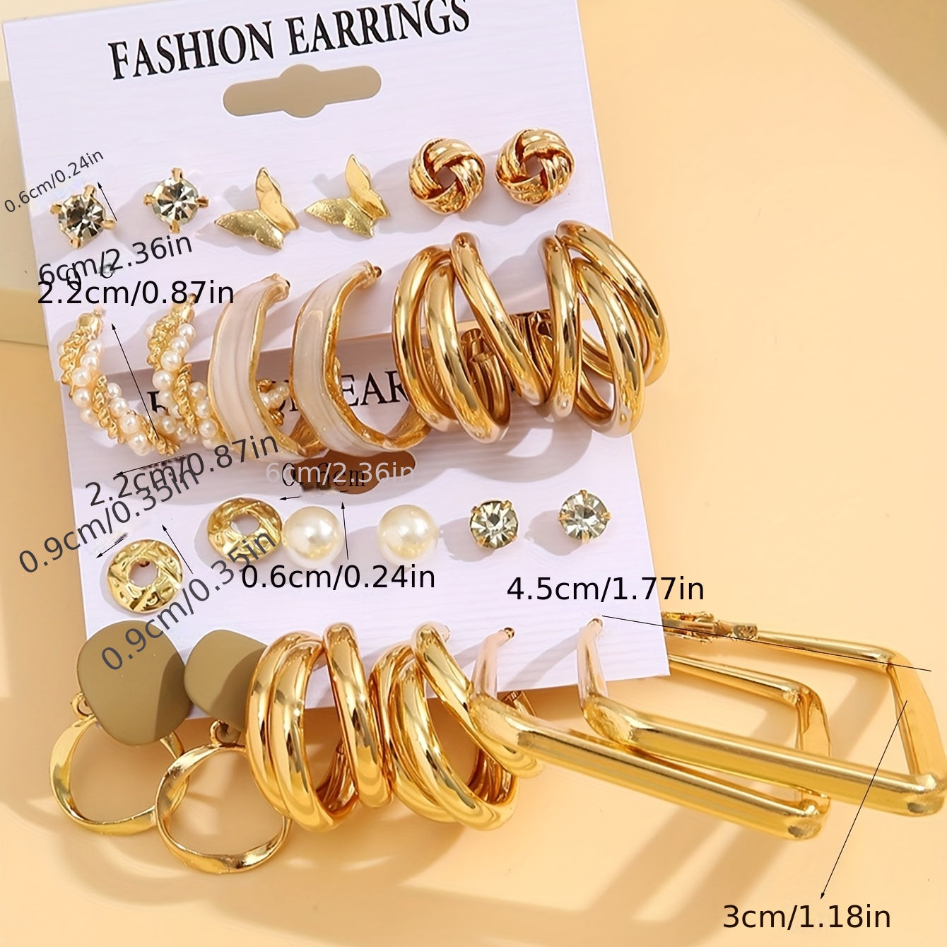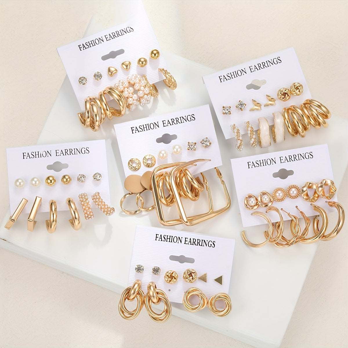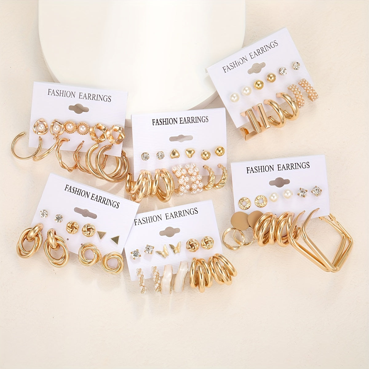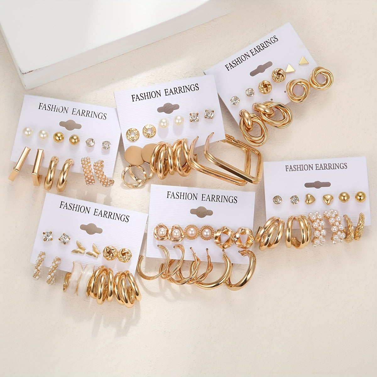 35 Pairs Golden Stud & Hoop Earrings Set with Rhinestone & Pearl - Female Gift