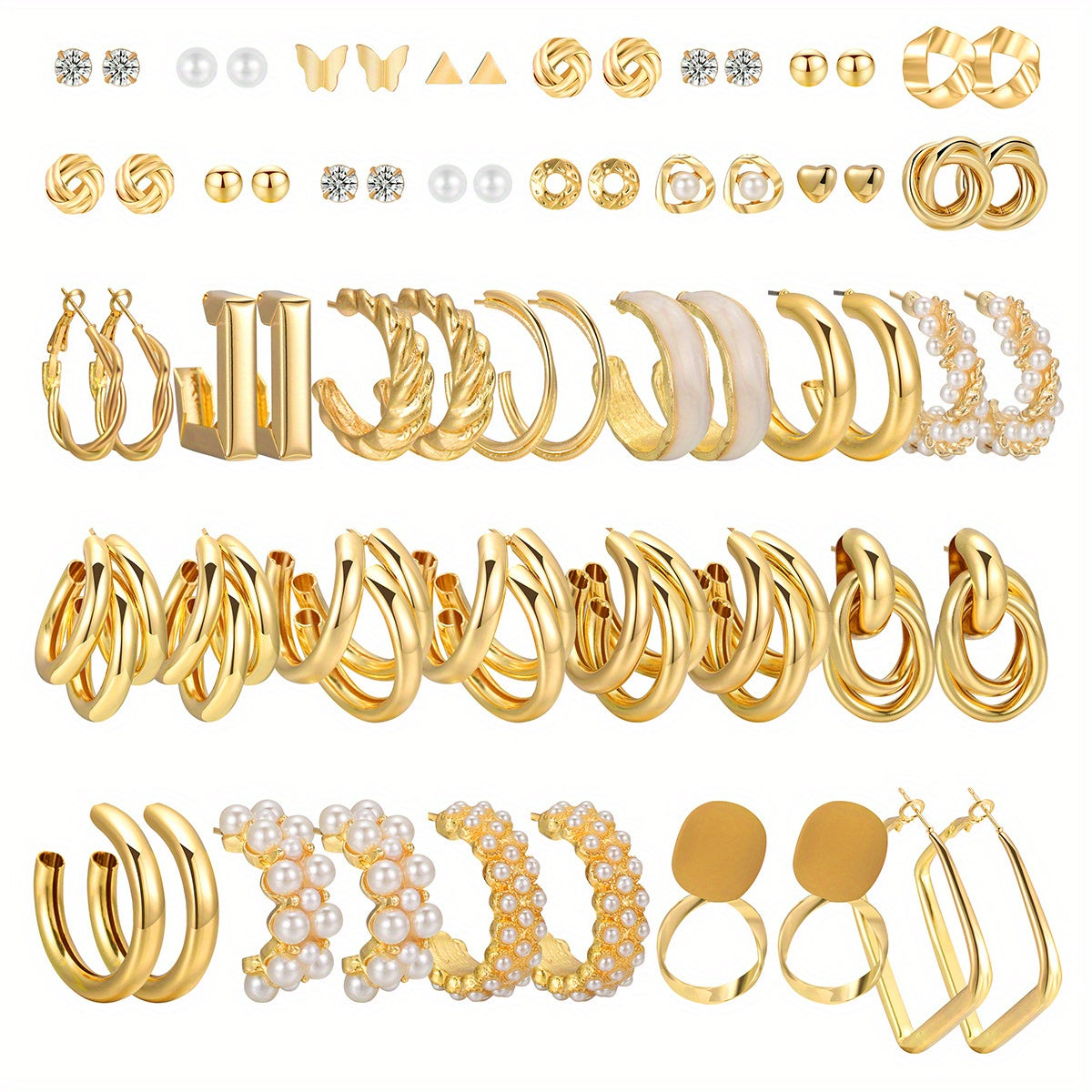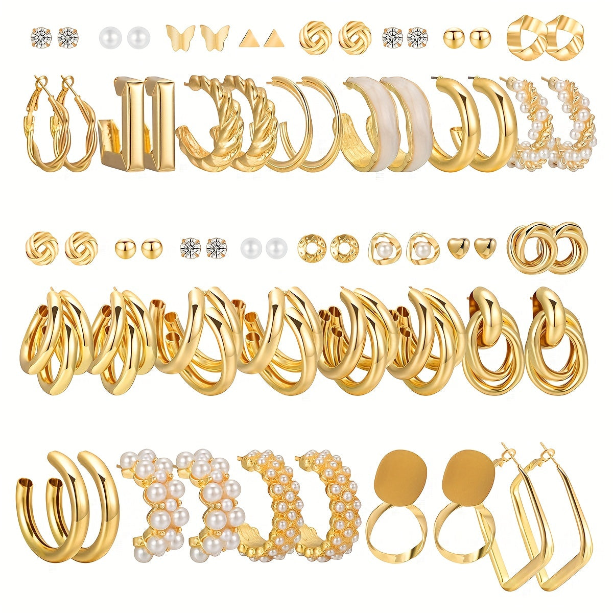Enhance your jewelry collection with this set of 35 pairs of golden stud earrings and hoop earrings featuring rhinestone and faux pearl decorations. Perfect for various occasions and as a thoughtful gift for women.