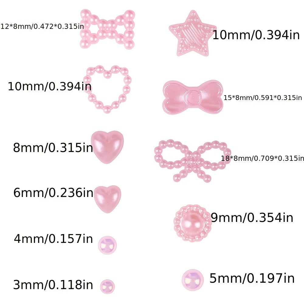Add a touch of glamour to your nail art with this set of 550 pink pearly heart, star, and bowknot shaped charms. These flatback assorted charms come in various sizes and are perfect for creating unique nail designs.